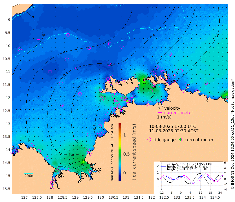 64cm/s 78T +4cm/s rms + 6cm/s 51T. Darwin_C1 52m 27cm/s 80T +4cm/s rms + 7cm/s -161T. Darwin_CW1 22m 11cm/s 81T +4cm/s rms + 8cm/s 61T. Darwin_CW2 34m 21cm/s 53T +3cm/s rms + 9cm/s 98T. Darwin_CW3 22m 6cm/s 90T +5cm/s rms + 7cm/s 88T. Darwin_C3 56m 41cm/s 63T +2cm/s rms + 9cm/s -126T. Darwin_CTbW 22m 6cm/s 147T +9cm/s rms + 2cm/s -110T. NWSLYN 196m 25cm/s 94T +1cm/s rms + 1cm/s -47T. DARBGF 30m 3cm/s 4T +7cm/s rms + 2cm/s -137T. ITFTIS 464m 3cm/s 72T +9cm/s rms + 1cm/s 74T. ITFMHB 146m 18cm/s 145T +4cm/s rms + 1cm/s -134T. ITFJBG 61m 15cm/s 127T +6cm/s rms + 4cm/s 121T. ITFFTB 108m 24cm/s 122T +4cm/s rms + 3cm/s 80T. NRSDAR 19m -24cm Carronade Island -31cm Guy Point -25cm Napier Broome Bay -7cm Lesueur Island -5cm Reveley Island -32cm Rocky Island -17cm Cape Domett -8cm Lacrosse Island -40cm Adolphus Island -76cm Pender Point -79cm Wyndham 20cm The Boxers 46cm Unnamed Shoal -7cm Loxton Shoal 3cm Pelican Island 14cm Calder Shoal 9cm Evans Shoal -45cm Quoin Island 20cm Port Keats 29cm Jones Point 45cm Catfish Island 44cm Cape Scott Offshore 36cm Cape Ford 57cm Anson Bay 21cm Goodrich Bank 56cm Peron Island North 54cm Point Jenny 51cm Native Point 60cm Fish Reef 52cm Tapa Bay 51cm Point Fawcett (Offshore) 48cm Burge Point 44cm Munkunuwa 48cm Beagle A 55cm Parsons Bank 47cm Fenton Patches 16cm Lynedoch Bank 48cm Hancox Shoal Area 49cm Nightcliff 51cm Darwin 54cm Charles Point Patches 35cm Glyde Point 17cm Chambers Bay 17cm Point Stuart 33cm Cape Hotham 10cm Christine Reef 12cm West Alligator Head -2cm East Field Island 29cm Two Hills Bay 34cm Newby Shoal 17cm Camp Point 51cm Medina Inlet South 41cm South Barlow Point 33cm St. Asaph Bay 27cm Cape Van Dieman 30cm Snake Bay 32cm Cache Point -11cm Echo Shoal 31cm Point Jahleel (Off) 44cm Cape Don 46cm Port Essington 46cm Smith Point - West 47cm NW Peacock Island 41cm North Of Jones Shoal 17cm Peacock Island 62cm Point David 53cm D'urville Point 48cm Money Shoal 63cm Copeland Island 84cm Cape Cockburn 61cm One Tree Point 75cm Hogmany Shoal 60cm New Year Island - West 61cm Grant Island 72cm Aurari Bay 76cm Cuthbert Point 71cm North Goulburn Island 72cm Paxie Shoal 72cm Entrance Island 80cm Yabooma Island