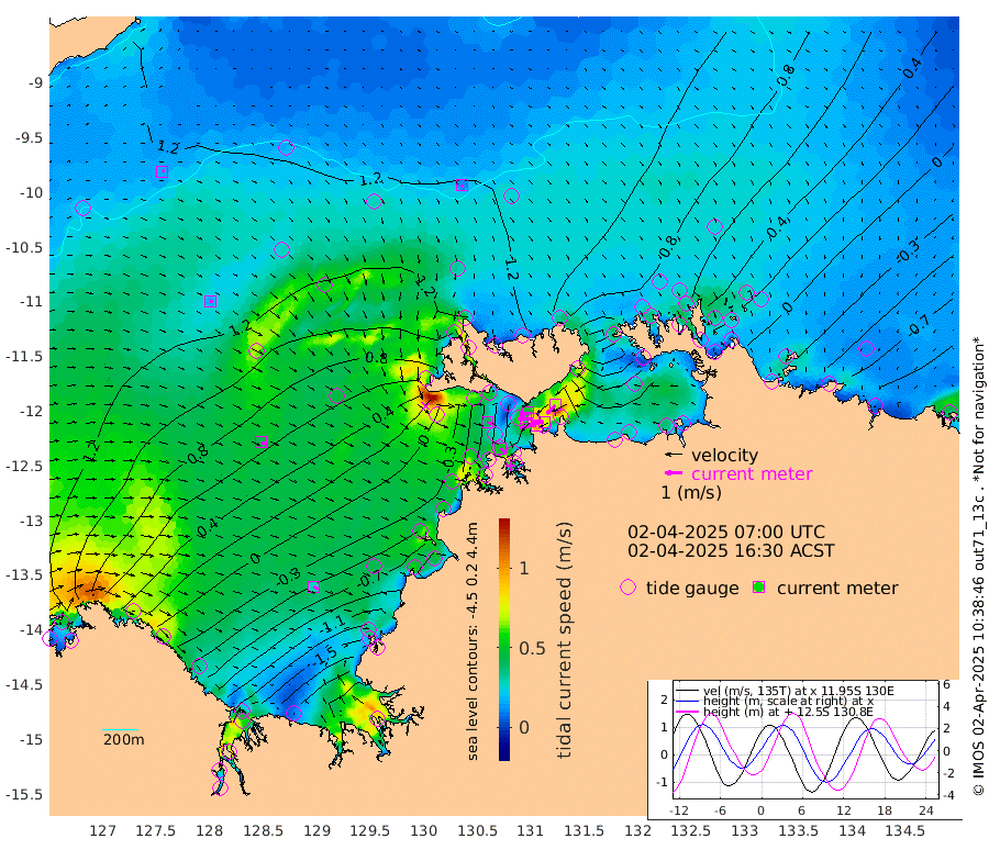 97cm/s -100T +4cm/s rms + 6cm/s 51T. Darwin_C1 52m 76cm/s -92T +4cm/s rms + 7cm/s -161T. Darwin_CW1 22m 40cm/s -107T +4cm/s rms + 8cm/s 61T. Darwin_CW2 34m 68cm/s -135T +3cm/s rms + 9cm/s 98T. Darwin_CW3 22m 87cm/s -90T +5cm/s rms + 7cm/s 88T. Darwin_C3 56m 46cm/s -116T +2cm/s rms + 9cm/s -126T. Darwin_CTbW 22m 11cm/s 141T +9cm/s rms + 2cm/s -110T. NWSLYN 196m 41cm/s 101T +1cm/s rms + 1cm/s -47T. DARBGF 30m 15cm/s 56T +7cm/s rms + 2cm/s -137T. ITFTIS 464m 17cm/s 93T +9cm/s rms + 1cm/s 74T. ITFMHB 146m 29cm/s 117T +4cm/s rms + 1cm/s -134T. ITFJBG 61m 41cm/s 109T +6cm/s rms + 4cm/s 121T. ITFFTB 108m 47cm/s 134T +4cm/s rms + 3cm/s 80T. NRSDAR 19m 70cm Carronade Island 64cm Guy Point 72cm Napier Broome Bay 20cm Lesueur Island -103cm Reveley Island -52cm Rocky Island -181cm Cape Domett -151cm Lacrosse Island -222cm Adolphus Island -237cm Pender Point -240cm Wyndham 97cm The Boxers 94cm Unnamed Shoal 128cm Loxton Shoal -191cm Pelican Island 113cm Calder Shoal 112cm Evans Shoal -304cm Quoin Island -127cm Port Keats -132cm Jones Point -273cm Catfish Island -42cm Cape Scott Offshore 38cm Cape Ford -47cm Anson Bay 112cm Goodrich Bank -26cm Peron Island North -14cm Point Jenny -10cm Native Point -22cm Fish Reef -36cm Tapa Bay 70cm Point Fawcett (Offshore) -53cm Burge Point -35cm Munkunuwa 22cm Beagle A -69cm Parsons Bank -40cm Fenton Patches 105cm Lynedoch Bank -78cm Hancox Shoal Area -70cm Nightcliff -80cm Darwin -38cm Charles Point Patches -91cm Glyde Point -138cm Chambers Bay -156cm Point Stuart -100cm Cape Hotham -125cm Christine Reef -181cm West Alligator Head -195cm East Field Island -103cm Two Hills Bay 70cm Newby Shoal -88cm Camp Point -32cm Medina Inlet South 80cm South Barlow Point 98cm St. Asaph Bay 113cm Cape Van Dieman 110cm Snake Bay 105cm Cache Point 132cm Echo Shoal 74cm Point Jahleel (Off) 12cm Cape Don 66cm Port Essington 66cm Smith Point - West 64cm NW Peacock Island 85cm North Of Jones Shoal 27cm Peacock Island 27cm Point David 61cm D'urville Point 66cm Money Shoal 19cm Copeland Island 27cm Cape Cockburn 33cm One Tree Point 16cm Hogmany Shoal 34cm New Year Island - West 23cm Grant Island -7cm Aurari Bay -39cm Cuthbert Point -4cm North Goulburn Island -59cm Paxie Shoal -89cm Entrance Island -136cm Yabooma Island