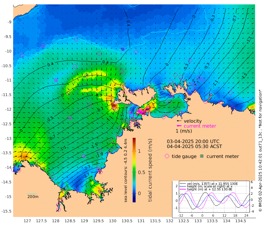 156cm/s -101T +4cm/s rms + 6cm/s 51T. Darwin_C1 52m 117cm/s -92T +4cm/s rms + 7cm/s -161T. Darwin_CW1 22m 45cm/s -104T +4cm/s rms + 8cm/s 61T. Darwin_CW2 34m 101cm/s -137T +3cm/s rms + 9cm/s 98T. Darwin_CW3 22m 100cm/s -89T +5cm/s rms + 7cm/s 88T. Darwin_C3 56m 86cm/s -116T +2cm/s rms + 9cm/s -126T. Darwin_CTbW 22m 7cm/s -167T +9cm/s rms + 2cm/s -110T. NWSLYN 196m 33cm/s 104T +1cm/s rms + 1cm/s -47T. DARBGF 30m 11cm/s 109T +7cm/s rms + 2cm/s -137T. ITFTIS 464m 18cm/s 144T +9cm/s rms + 1cm/s 74T. ITFMHB 146m 31cm/s 130T +4cm/s rms + 1cm/s -134T. ITFJBG 61m 41cm/s 124T +6cm/s rms + 4cm/s 121T. ITFFTB 108m 45cm/s 133T +4cm/s rms + 3cm/s 80T. NRSDAR 19m -53cm Carronade Island -55cm Guy Point -60cm Napier Broome Bay -120cm Lesueur Island -183cm Reveley Island -89cm Rocky Island -284cm Cape Domett -254cm Lacrosse Island -328cm Adolphus Island -333cm Pender Point -356cm Wyndham -15cm The Boxers -20cm Unnamed Shoal 39cm Loxton Shoal -282cm Pelican Island 16cm Calder Shoal 33cm Evans Shoal -402cm Quoin Island -231cm Port Keats -223cm Jones Point -417cm Catfish Island -132cm Cape Scott Offshore -91cm Cape Ford -139cm Anson Bay 26cm Goodrich Bank -126cm Peron Island North -110cm Point Jenny -105cm Native Point -121cm Fish Reef -130cm Tapa Bay -28cm Point Fawcett (Offshore) -153cm Burge Point -96cm Munkunuwa -83cm Beagle A -155cm Parsons Bank -142cm Fenton Patches 22cm Lynedoch Bank -167cm Hancox Shoal Area -160cm Nightcliff -183cm Darwin -152cm Charles Point Patches -189cm Glyde Point -224cm Chambers Bay -243cm Point Stuart -191cm Cape Hotham -210cm Christine Reef -267cm West Alligator Head -285cm East Field Island -194cm Two Hills Bay -69cm Newby Shoal -180cm Camp Point -125cm Medina Inlet South -9cm South Barlow Point 12cm St. Asaph Bay 27cm Cape Van Dieman 20cm Snake Bay 10cm Cache Point 50cm Echo Shoal -15cm Point Jahleel (Off) -84cm Cape Don -30cm Port Essington -27cm Smith Point - West -32cm NW Peacock Island -9cm North Of Jones Shoal -6cm Peacock Island -69cm Point David -35cm D'urville Point -35cm Money Shoal -74cm Copeland Island -102cm Cape Cockburn -67cm One Tree Point -107cm Hogmany Shoal -73cm New Year Island - West -81cm Grant Island -106cm Aurari Bay -147cm Cuthbert Point -109cm North Goulburn Island -161cm Paxie Shoal -183cm Entrance Island -223cm Yabooma Island