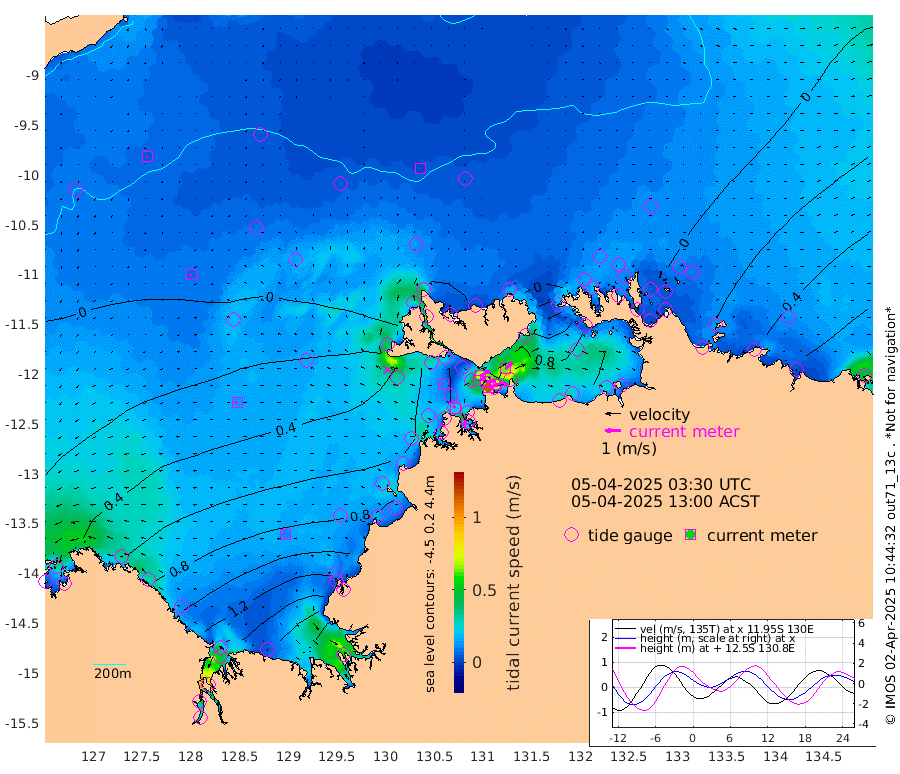 114cm/s 79T +4cm/s rms + 6cm/s 51T. Darwin_C1 52m 82cm/s 91T +4cm/s rms + 7cm/s -161T. Darwin_CW1 22m 41cm/s 71T +4cm/s rms + 8cm/s 61T. Darwin_CW2 34m 62cm/s 48T +3cm/s rms + 9cm/s 98T. Darwin_CW3 22m 66cm/s 91T +5cm/s rms + 7cm/s 88T. Darwin_C3 56m 67cm/s 66T +2cm/s rms + 9cm/s -126T. Darwin_CTbW 22m 2cm/s 6T +9cm/s rms + 2cm/s -110T. NWSLYN 196m 11cm/s -62T +1cm/s rms + 1cm/s -47T. DARBGF 30m 5cm/s -118T +7cm/s rms + 2cm/s -137T. ITFTIS 464m 8cm/s -136T +9cm/s rms + 1cm/s 74T. ITFMHB 146m 11cm/s -56T +4cm/s rms + 1cm/s -134T. ITFJBG 61m 13cm/s -72T +6cm/s rms + 4cm/s 121T. ITFFTB 108m 22cm/s -46T +4cm/s rms + 3cm/s 80T. NRSDAR 19m 77cm Carronade Island 80cm Guy Point 83cm Napier Broome Bay 93cm Lesueur Island 127cm Reveley Island 86cm Rocky Island 177cm Cape Domett 168cm Lacrosse Island 189cm Adolphus Island 211cm Pender Point 225cm Wyndham 23cm The Boxers 10cm Unnamed Shoal -8cm Loxton Shoal 167cm Pelican Island 8cm Calder Shoal -9cm Evans Shoal 233cm Quoin Island 138cm Port Keats 129cm Jones Point 281cm Catfish Island 89cm Cape Scott Offshore 58cm Cape Ford 86cm Anson Bay -16cm Goodrich Bank 77cm Peron Island North 77cm Point Jenny 73cm Native Point 79cm Fish Reef 82cm Tapa Bay 30cm Point Fawcett (Offshore) 92cm Burge Point 66cm Munkunuwa 61cm Beagle A 82cm Parsons Bank 88cm Fenton Patches -16cm Lynedoch Bank 91cm Hancox Shoal Area 97cm Nightcliff 95cm Darwin 78cm Charles Point Patches 104cm Glyde Point 133cm Chambers Bay 143cm Point Stuart 106cm Cape Hotham 128cm Christine Reef 161cm West Alligator Head 172cm East Field Island 111cm Two Hills Bay 53cm Newby Shoal 98cm Camp Point 75cm Medina Inlet South 5cm South Barlow Point 1cm St. Asaph Bay -17cm Cape Van Dieman -19cm Snake Bay -6cm Cache Point -8cm Echo Shoal 6cm Point Jahleel (Off) 40cm Cape Don -1cm Port Essington 1cm Smith Point - West -2cm NW Peacock Island -7cm North Of Jones Shoal -3cm Peacock Island 2cm Point David -3cm D'urville Point -8cm Money Shoal 4cm Copeland Island 12cm Cape Cockburn 5cm One Tree Point 18cm Hogmany Shoal 7cm New Year Island - West 9cm Grant Island 17cm Aurari Bay 36cm Cuthbert Point 21cm North Goulburn Island 46cm Paxie Shoal 51cm Entrance Island 63cm Yabooma Island