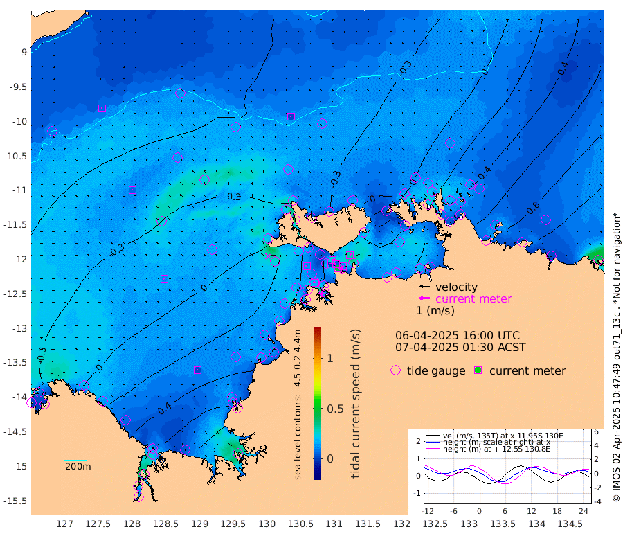 45cm/s 79T +4cm/s rms + 6cm/s 51T. Darwin_C1 52m 12cm/s 80T +4cm/s rms + 7cm/s -161T. Darwin_CW1 22m 1cm/s 3T +4cm/s rms + 8cm/s 61T. Darwin_CW2 34m 29cm/s 43T +3cm/s rms + 9cm/s 98T. Darwin_CW3 22m 4cm/s -109T +5cm/s rms + 7cm/s 88T. Darwin_C3 56m 26cm/s 63T +2cm/s rms + 9cm/s -126T. Darwin_CTbW 22m 2cm/s -47T +9cm/s rms + 2cm/s -110T. NWSLYN 196m 12cm/s -88T +1cm/s rms + 1cm/s -47T. DARBGF 30m 6cm/s -103T +7cm/s rms + 2cm/s -137T. ITFTIS 464m 8cm/s -42T +9cm/s rms + 1cm/s 74T. ITFMHB 146m 3cm/s -68T +4cm/s rms + 1cm/s -134T. ITFJBG 61m 11cm/s -70T +6cm/s rms + 4cm/s 121T. ITFFTB 108m 17cm/s -53T +4cm/s rms + 3cm/s 80T. NRSDAR 19m -29cm Carronade Island -35cm Guy Point -34cm Napier Broome Bay -14cm Lesueur Island 11cm Reveley Island -23cm Rocky Island 32cm Cape Domett 28cm Lacrosse Island 44cm Adolphus Island 39cm Pender Point 51cm Wyndham -40cm The Boxers -22cm Unnamed Shoal -68cm Loxton Shoal 48cm Pelican Island -54cm Calder Shoal -50cm Evans Shoal 67cm Quoin Island 23cm Port Keats 40cm Jones Point 157cm Catfish Island 5cm Cape Scott Offshore -32cm Cape Ford 11cm Anson Bay -42cm Goodrich Bank 10cm Peron Island North 2cm Point Jenny -3cm Native Point 11cm Fish Reef 5cm Tapa Bay -24cm Point Fawcett (Offshore) 10cm Burge Point -7cm Munkunuwa -9cm Beagle A 21cm Parsons Bank 9cm Fenton Patches -40cm Lynedoch Bank 24cm Hancox Shoal Area 15cm Nightcliff 21cm Darwin 8cm Charles Point Patches 42cm Glyde Point 72cm Chambers Bay 84cm Point Stuart 55cm Cape Hotham 58cm Christine Reef 92cm West Alligator Head 99cm East Field Island 62cm Two Hills Bay -29cm Newby Shoal 45cm Camp Point 1cm Medina Inlet South -34cm South Barlow Point -41cm St. Asaph Bay -40cm Cape Van Dieman -39cm Snake Bay -30cm Cache Point -64cm Echo Shoal -19cm Point Jahleel (Off) 17cm Cape Don -1cm Port Essington -1cm Smith Point - West 3cm NW Peacock Island -12cm North Of Jones Shoal -1cm Peacock Island 33cm Point David 8cm D'urville Point 7cm Money Shoal 39cm Copeland Island 52cm Cape Cockburn 28cm One Tree Point 50cm Hogmany Shoal 30cm New Year Island - West 34cm Grant Island 61cm Aurari Bay 81cm Cuthbert Point 58cm North Goulburn Island 83cm Paxie Shoal 103cm Entrance Island 136cm Yabooma Island