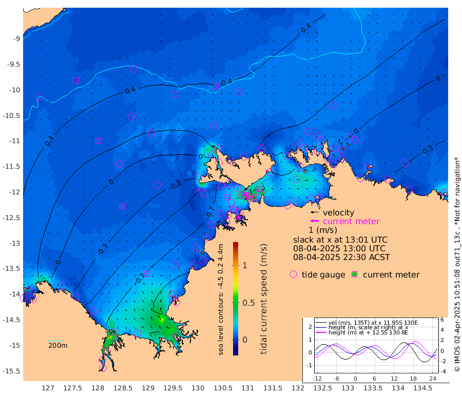 55cm/s -102T +4cm/s rms + 6cm/s 51T. Darwin_C1 52m 46cm/s -88T +4cm/s rms + 7cm/s -161T. Darwin_CW1 22m 39cm/s -108T +4cm/s rms + 8cm/s 61T. Darwin_CW2 34m 32cm/s -138T +3cm/s rms + 9cm/s 98T. Darwin_CW3 22m 50cm/s -91T +5cm/s rms + 7cm/s 88T. Darwin_C3 56m 28cm/s -115T +2cm/s rms + 9cm/s -126T. Darwin_CTbW 22m 7cm/s 145T +9cm/s rms + 2cm/s -110T. NWSLYN 196m 15cm/s -98T +1cm/s rms + 1cm/s -47T. DARBGF 30m 3cm/s 45T +7cm/s rms + 2cm/s -137T. ITFTIS 464m 6cm/s 29T +9cm/s rms + 1cm/s 74T. ITFMHB 146m 14cm/s -2T +4cm/s rms + 1cm/s -134T. ITFJBG 61m 6cm/s 6T +6cm/s rms + 4cm/s 121T. ITFFTB 108m 15cm/s -66T +4cm/s rms + 3cm/s 80T. NRSDAR 19m 36cm Carronade Island 43cm Guy Point 43cm Napier Broome Bay -13cm Lesueur Island -66cm Reveley Island -51cm Rocky Island -103cm Cape Domett -97cm Lacrosse Island -100cm Adolphus Island -59cm Pender Point -50cm Wyndham 6cm The Boxers 3cm Unnamed Shoal 48cm Loxton Shoal -114cm Pelican Island 14cm Calder Shoal 35cm Evans Shoal -108cm Quoin Island -118cm Port Keats -122cm Jones Point -104cm Catfish Island -77cm Cape Scott Offshore -123cm Cape Ford -87cm Anson Bay 24cm Goodrich Bank -80cm Peron Island North -88cm Point Jenny -87cm Native Point -102cm Fish Reef -95cm Tapa Bay -32cm Point Fawcett (Offshore) -114cm Burge Point -92cm Munkunuwa -87cm Beagle A -98cm Parsons Bank -117cm Fenton Patches 32cm Lynedoch Bank -95cm Hancox Shoal Area -106cm Nightcliff -108cm Darwin -94cm Charles Point Patches -84cm Glyde Point -70cm Chambers Bay -70cm Point Stuart -72cm Cape Hotham -63cm Christine Reef -77cm West Alligator Head -76cm East Field Island -55cm Two Hills Bay -43cm Newby Shoal -53cm Camp Point -92cm Medina Inlet South -18cm South Barlow Point -5cm St. Asaph Bay 22cm Cape Van Dieman 25cm Snake Bay 17cm Cache Point 50cm Echo Shoal 8cm Point Jahleel (Off) -16cm Cape Don 10cm Port Essington 8cm Smith Point - West 13cm NW Peacock Island 24cm North Of Jones Shoal 8cm Peacock Island 12cm Point David 10cm D'urville Point 21cm Money Shoal 9cm Copeland Island 7cm Cape Cockburn 13cm One Tree Point 14cm Hogmany Shoal 11cm New Year Island - West 11cm Grant Island -4cm Aurari Bay -10cm Cuthbert Point 1cm North Goulburn Island -4cm Paxie Shoal -24cm Entrance Island -32cm Yabooma Island