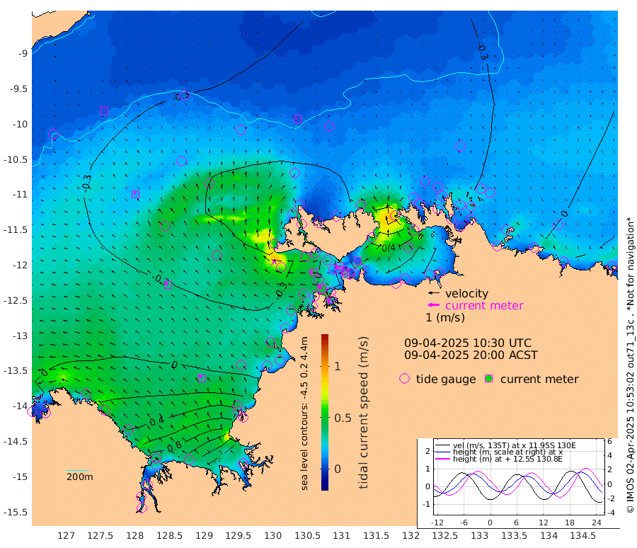 36cm/s -101T +4cm/s rms + 6cm/s 51T. Darwin_C1 52m 5cm/s -80T +4cm/s rms + 7cm/s -161T. Darwin_CW1 22m 13cm/s -111T +4cm/s rms + 8cm/s 61T. Darwin_CW2 34m 7cm/s -3T +3cm/s rms + 9cm/s 98T. Darwin_CW3 22m 6cm/s 108T +5cm/s rms + 7cm/s 88T. Darwin_C3 56m 29cm/s -116T +2cm/s rms + 9cm/s -126T. Darwin_CTbW 22m 5cm/s -3T +9cm/s rms + 2cm/s -110T. NWSLYN 196m 45cm/s -85T +1cm/s rms + 1cm/s -47T. DARBGF 30m 5cm/s -50T +7cm/s rms + 2cm/s -137T. ITFTIS 464m 17cm/s -18T +9cm/s rms + 1cm/s 74T. ITFMHB 146m 34cm/s -33T +4cm/s rms + 1cm/s -134T. ITFJBG 61m 36cm/s -47T +6cm/s rms + 4cm/s 121T. ITFFTB 108m 47cm/s -54T +4cm/s rms + 3cm/s 80T. NRSDAR 19m 30cm Carronade Island 37cm Guy Point 39cm Napier Broome Bay 36cm Lesueur Island 57cm Reveley Island 33cm Rocky Island 103cm Cape Domett 82cm Lacrosse Island 133cm Adolphus Island 194cm Pender Point 204cm Wyndham -25cm The Boxers -33cm Unnamed Shoal -19cm Loxton Shoal 84cm Pelican Island -34cm Calder Shoal -32cm Evans Shoal 172cm Quoin Island 43cm Port Keats 46cm Jones Point 90cm Catfish Island -13cm Cape Scott Offshore -5cm Cape Ford -21cm Anson Bay -37cm Goodrich Bank -27cm Peron Island North -32cm Point Jenny -31cm Native Point -33cm Fish Reef -21cm Tapa Bay -55cm Point Fawcett (Offshore) -8cm Burge Point -26cm Munkunuwa -43cm Beagle A -11cm Parsons Bank -18cm Fenton Patches -28cm Lynedoch Bank -2cm Hancox Shoal Area -15cm Nightcliff 4cm Darwin -9cm Charles Point Patches 27cm Glyde Point 60cm Chambers Bay 73cm Point Stuart 33cm Cape Hotham 56cm Christine Reef 85cm West Alligator Head 107cm East Field Island 39cm Two Hills Bay -34cm Newby Shoal 50cm Camp Point -22cm Medina Inlet South -51cm South Barlow Point -51cm St. Asaph Bay -42cm Cape Van Dieman -41cm Snake Bay -42cm Cache Point -22cm Echo Shoal -32cm Point Jahleel (Off) -15cm Cape Don -33cm Port Essington -41cm Smith Point - West -36cm NW Peacock Island -41cm North Of Jones Shoal -15cm Peacock Island -21cm Point David -40cm D'urville Point -27cm Money Shoal -21cm Copeland Island -32cm Cape Cockburn -25cm One Tree Point -15cm Hogmany Shoal -21cm New Year Island - West -18cm Grant Island -18cm Aurari Bay -3cm Cuthbert Point -15cm North Goulburn Island 18cm Paxie Shoal 21cm Entrance Island 35cm Yabooma Island