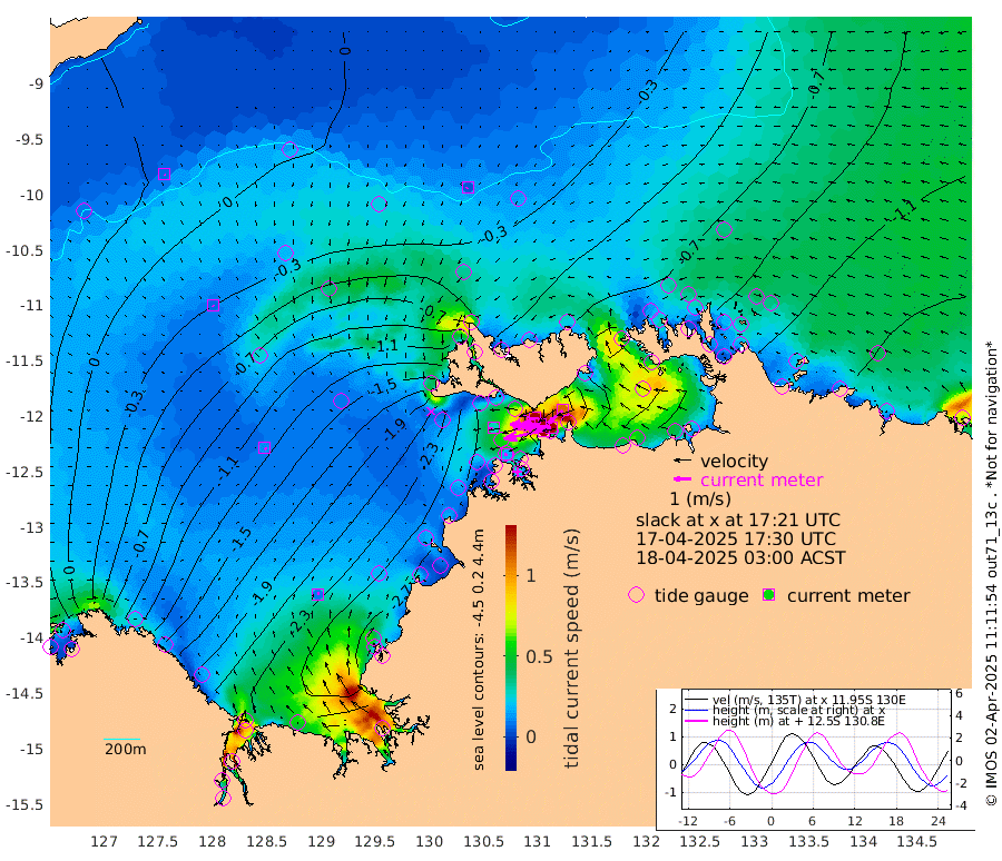 232cm/s -102T +4cm/s rms + 6cm/s 51T. Darwin_C1 52m 165cm/s -90T +4cm/s rms + 7cm/s -161T. Darwin_CW1 22m 115cm/s -107T +4cm/s rms + 8cm/s 61T. Darwin_CW2 34m 110cm/s -133T +3cm/s rms + 9cm/s 98T. Darwin_CW3 22m 173cm/s -90T +5cm/s rms + 7cm/s 88T. Darwin_C3 56m 135cm/s -115T +2cm/s rms + 9cm/s -126T. Darwin_CTbW 22m 6cm/s -130T +9cm/s rms + 2cm/s -110T. NWSLYN 196m 29cm/s -104T +1cm/s rms + 1cm/s -47T. DARBGF 30m 8cm/s 135T +7cm/s rms + 2cm/s -137T. ITFTIS 464m 7cm/s 129T +9cm/s rms + 1cm/s 74T. ITFMHB 146m 10cm/s 52T +4cm/s rms + 1cm/s -134T. ITFJBG 61m 12cm/s 109T +6cm/s rms + 4cm/s 121T. ITFFTB 108m 16cm/s -101T +4cm/s rms + 3cm/s 80T. NRSDAR 19m 17cm Carronade Island 12cm Guy Point 13cm Napier Broome Bay -108cm Lesueur Island -199cm Reveley Island -94cm Rocky Island -282cm Cape Domett -257cm Lacrosse Island -289cm Adolphus Island -219cm Pender Point -201cm Wyndham -67cm The Boxers -90cm Unnamed Shoal -2cm Loxton Shoal -303cm Pelican Island -48cm Calder Shoal -11cm Evans Shoal -339cm Quoin Island -300cm Port Keats -277cm Jones Point -242cm Catfish Island -226cm Cape Scott Offshore -216cm Cape Ford -251cm Anson Bay -33cm Goodrich Bank -221cm Peron Island North -213cm Point Jenny -214cm Native Point -220cm Fish Reef -247cm Tapa Bay -122cm Point Fawcett (Offshore) -255cm Burge Point -222cm Munkunuwa -183cm Beagle A -257cm Parsons Bank -245cm Fenton Patches -23cm Lynedoch Bank -260cm Hancox Shoal Area -271cm Nightcliff -289cm Darwin -265cm Charles Point Patches -213cm Glyde Point -166cm Chambers Bay -158cm Point Stuart -181cm Cape Hotham -160cm Christine Reef -166cm West Alligator Head -150cm East Field Island -152cm Two Hills Bay -142cm Newby Shoal -155cm Camp Point -240cm Medina Inlet South -109cm South Barlow Point -76cm St. Asaph Bay -36cm Cape Van Dieman -50cm Snake Bay -40cm Cache Point 29cm Echo Shoal -60cm Point Jahleel (Off) -106cm Cape Don -67cm Port Essington -68cm Smith Point - West -66cm NW Peacock Island -49cm North Of Jones Shoal -19cm Peacock Island -89cm Point David -72cm D'urville Point -59cm Money Shoal -88cm Copeland Island -112cm Cape Cockburn -85cm One Tree Point -113cm Hogmany Shoal -90cm New Year Island - West -96cm Grant Island -106cm Aurari Bay -121cm Cuthbert Point -107cm North Goulburn Island -132cm Paxie Shoal -136cm Entrance Island -143cm Yabooma Island