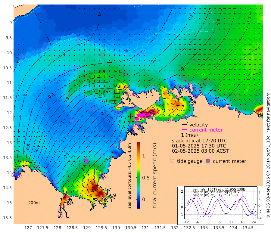275cm/s -101T +4cm/s rms + 6cm/s 51T. Darwin_C1 52m 206cm/s -90T +4cm/s rms + 7cm/s -161T. Darwin_CW1 22m 128cm/s -106T +4cm/s rms + 8cm/s 61T. Darwin_CW2 34m 131cm/s -134T +3cm/s rms + 9cm/s 98T. Darwin_CW3 22m 204cm/s -90T +5cm/s rms + 7cm/s 88T. Darwin_C3 56m 156cm/s -115T +2cm/s rms + 9cm/s -126T. Darwin_CTbW 22m 6cm/s -113T +9cm/s rms + 2cm/s -110T. NWSLYN 196m 35cm/s -104T +1cm/s rms + 1cm/s -47T. DARBGF 30m 10cm/s 137T +7cm/s rms + 2cm/s -137T. ITFTIS 464m 8cm/s 128T +9cm/s rms + 1cm/s 74T. ITFMHB 146m 13cm/s 41T +4cm/s rms + 1cm/s -134T. ITFJBG 61m 13cm/s 107T +6cm/s rms + 4cm/s 121T. ITFFTB 108m 21cm/s -93T +4cm/s rms + 3cm/s 80T. NRSDAR 19m 12cm Carronade Island 11cm Guy Point 5cm Napier Broome Bay -123cm Lesueur Island -235cm Reveley Island -118cm Rocky Island -337cm Cape Domett -305cm Lacrosse Island -337cm Adolphus Island -261cm Pender Point -240cm Wyndham -82cm The Boxers -102cm Unnamed Shoal 0cm Loxton Shoal -357cm Pelican Island -57cm Calder Shoal -18cm Evans Shoal -397cm Quoin Island -358cm Port Keats -339cm Jones Point -332cm Catfish Island -269cm Cape Scott Offshore -301cm Cape Ford -297cm Anson Bay -40cm Goodrich Bank -276cm Peron Island North -262cm Point Jenny -259cm Native Point -282cm Fish Reef -294cm Tapa Bay -157cm Point Fawcett (Offshore) -318cm Burge Point -271cm Munkunuwa -226cm Beagle A -315cm Parsons Bank -297cm Fenton Patches -27cm Lynedoch Bank -308cm Hancox Shoal Area -316cm Nightcliff -351cm Darwin -323cm Charles Point Patches -264cm Glyde Point -209cm Chambers Bay -211cm Point Stuart -231cm Cape Hotham -199cm Christine Reef -222cm West Alligator Head -202cm East Field Island -200cm Two Hills Bay -178cm Newby Shoal -192cm Camp Point -295cm Medina Inlet South -134cm South Barlow Point -93cm St. Asaph Bay -45cm Cape Van Dieman -58cm Snake Bay -55cm Cache Point 38cm Echo Shoal -76cm Point Jahleel (Off) -142cm Cape Don -92cm Port Essington -90cm Smith Point - West -87cm NW Peacock Island -67cm North Of Jones Shoal -26cm Peacock Island -113cm Point David -95cm D'urville Point -81cm Money Shoal -114cm Copeland Island -156cm Cape Cockburn -114cm One Tree Point -149cm Hogmany Shoal -115cm New Year Island - West -124cm Grant Island -135cm Aurari Bay -164cm Cuthbert Point -144cm North Goulburn Island -173cm Paxie Shoal -178cm Entrance Island -193cm Yabooma Island