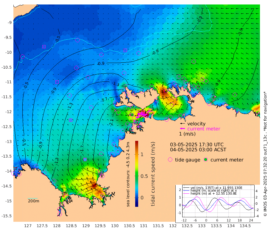 210cm/s -102T +4cm/s rms + 6cm/s 51T. Darwin_C1 52m 147cm/s -89T +4cm/s rms + 7cm/s -161T. Darwin_CW1 22m 107cm/s -107T +4cm/s rms + 8cm/s 61T. Darwin_CW2 34m 84cm/s -127T +3cm/s rms + 9cm/s 98T. Darwin_CW3 22m 153cm/s -91T +5cm/s rms + 7cm/s 88T. Darwin_C3 56m 118cm/s -115T +2cm/s rms + 9cm/s -126T. Darwin_CTbW 22m 9cm/s -57T +9cm/s rms + 2cm/s -110T. NWSLYN 196m 56cm/s -94T +1cm/s rms + 1cm/s -47T. DARBGF 30m 6cm/s -162T +7cm/s rms + 2cm/s -137T. ITFTIS 464m 6cm/s -17T +9cm/s rms + 1cm/s 74T. ITFMHB 146m 22cm/s -18T +4cm/s rms + 1cm/s -134T. ITFJBG 61m 17cm/s -47T +6cm/s rms + 4cm/s 121T. ITFFTB 108m 40cm/s -69T +4cm/s rms + 3cm/s 80T. NRSDAR 19m 7cm Carronade Island 6cm Guy Point -4cm Napier Broome Bay -74cm Lesueur Island -124cm Reveley Island -81cm Rocky Island -154cm Cape Domett -143cm Lacrosse Island -120cm Adolphus Island -53cm Pender Point -20cm Wyndham -106cm The Boxers -120cm Unnamed Shoal -67cm Loxton Shoal -168cm Pelican Island -101cm Calder Shoal -72cm Evans Shoal -137cm Quoin Island -205cm Port Keats -184cm Jones Point -85cm Catfish Island -195cm Cape Scott Offshore -224cm Cape Ford -215cm Anson Bay -84cm Goodrich Bank -204cm Peron Island North -195cm Point Jenny -196cm Native Point -205cm Fish Reef -212cm Tapa Bay -162cm Point Fawcett (Offshore) -213cm Burge Point -210cm Munkunuwa -176cm Beagle A -212cm Parsons Bank -197cm Fenton Patches -71cm Lynedoch Bank -197cm Hancox Shoal Area -210cm Nightcliff -230cm Darwin -227cm Charles Point Patches -139cm Glyde Point -57cm Chambers Bay -47cm Point Stuart -104cm Cape Hotham -59cm Christine Reef -42cm West Alligator Head -6cm East Field Island -77cm Two Hills Bay -157cm Newby Shoal -73cm Camp Point -219cm Medina Inlet South -150cm South Barlow Point -126cm St. Asaph Bay -90cm Cape Van Dieman -101cm Snake Bay -89cm Cache Point -33cm Echo Shoal -89cm Point Jahleel (Off) -103cm Cape Don -94cm Port Essington -93cm Smith Point - West -86cm NW Peacock Island -87cm North Of Jones Shoal -31cm Peacock Island -81cm Point David -90cm D'urville Point -76cm Money Shoal -76cm Copeland Island -104cm Cape Cockburn -88cm One Tree Point -93cm Hogmany Shoal -83cm New Year Island - West -85cm Grant Island -72cm Aurari Bay -71cm Cuthbert Point -81cm North Goulburn Island -71cm Paxie Shoal -48cm Entrance Island -24cm Yabooma Island