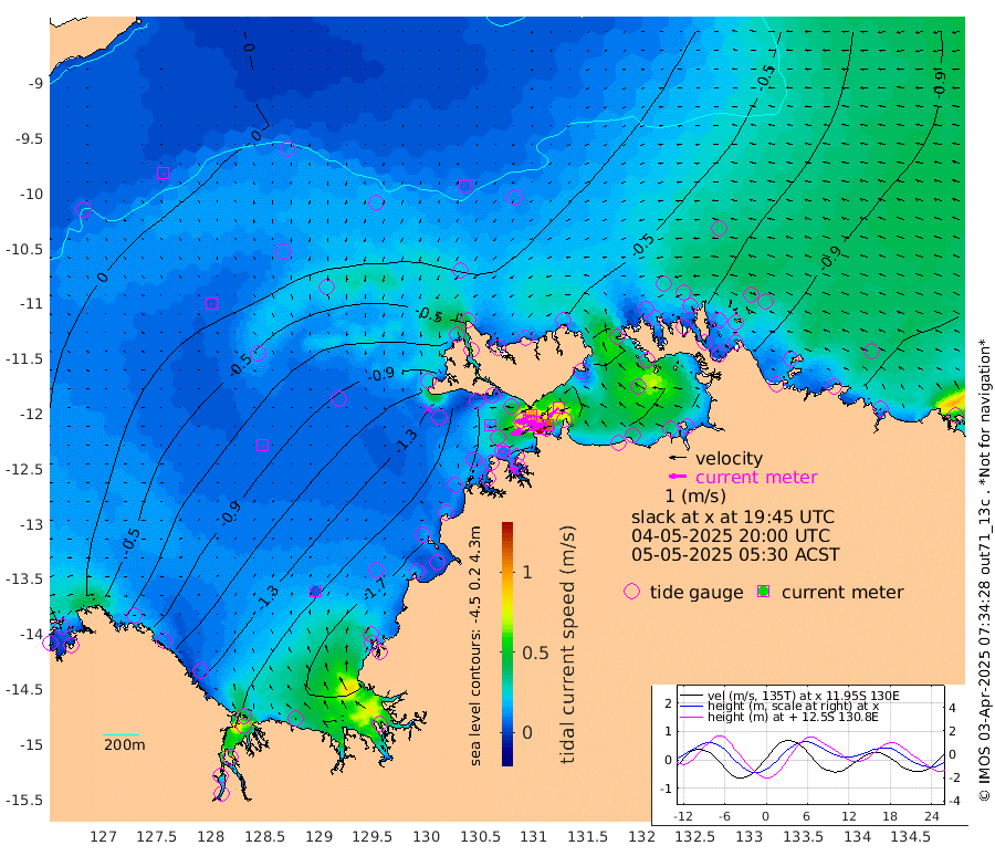 169cm/s -101T +4cm/s rms + 6cm/s 51T. Darwin_C1 52m 112cm/s -90T +4cm/s rms + 7cm/s -161T. Darwin_CW1 22m 61cm/s -105T +4cm/s rms + 8cm/s 61T. Darwin_CW2 34m 81cm/s -133T +3cm/s rms + 9cm/s 98T. Darwin_CW3 22m 102cm/s -90T +5cm/s rms + 7cm/s 88T. Darwin_C3 56m 97cm/s -115T +2cm/s rms + 9cm/s -126T. Darwin_CTbW 22m 6cm/s -61T +9cm/s rms + 2cm/s -110T. NWSLYN 196m 17cm/s -102T +1cm/s rms + 1cm/s -47T. DARBGF 30m 6cm/s 149T +7cm/s rms + 2cm/s -137T. ITFTIS 464m 4cm/s 137T +9cm/s rms + 1cm/s 74T. ITFMHB 146m 5cm/s 47T +4cm/s rms + 1cm/s -134T. ITFJBG 61m 6cm/s 108T +6cm/s rms + 4cm/s 121T. ITFFTB 108m 10cm/s -96T +4cm/s rms + 3cm/s 80T. NRSDAR 19m -17cm Carronade Island -17cm Guy Point -29cm Napier Broome Bay -74cm Lesueur Island -116cm Reveley Island -63cm Rocky Island -167cm Cape Domett -152cm Lacrosse Island -159cm Adolphus Island -143cm Pender Point -135cm Wyndham -52cm The Boxers -69cm Unnamed Shoal -9cm Loxton Shoal -175cm Pelican Island -34cm Calder Shoal -16cm Evans Shoal -202cm Quoin Island -171cm Port Keats -164cm Jones Point -235cm Catfish Island -137cm Cape Scott Offshore -109cm Cape Ford -150cm Anson Bay -24cm Goodrich Bank -137cm Peron Island North -124cm Point Jenny -123cm Native Point -134cm Fish Reef -140cm Tapa Bay -84cm Point Fawcett (Offshore) -143cm Burge Point -126cm Munkunuwa -100cm Beagle A -147cm Parsons Bank -129cm Fenton Patches -20cm Lynedoch Bank -144cm Hancox Shoal Area -146cm Nightcliff -164cm Darwin -152cm Charles Point Patches -131cm Glyde Point -115cm Chambers Bay -120cm Point Stuart -120cm Cape Hotham -104cm Christine Reef -127cm West Alligator Head -117cm East Field Island -113cm Two Hills Bay -85cm Newby Shoal -100cm Camp Point -141cm Medina Inlet South -65cm South Barlow Point -48cm St. Asaph Bay -27cm Cape Van Dieman -36cm Snake Bay -34cm Cache Point 11cm Echo Shoal -44cm Point Jahleel (Off) -81cm Cape Don -54cm Port Essington -52cm Smith Point - West -51cm NW Peacock Island -44cm North Of Jones Shoal -17cm Peacock Island -69cm Point David -54cm D'urville Point -49cm Money Shoal -68cm Copeland Island -92cm Cape Cockburn -71cm One Tree Point -90cm Hogmany Shoal -70cm New Year Island - West -74cm Grant Island -81cm Aurari Bay -97cm Cuthbert Point -88cm North Goulburn Island -108cm Paxie Shoal -101cm Entrance Island -107cm Yabooma Island