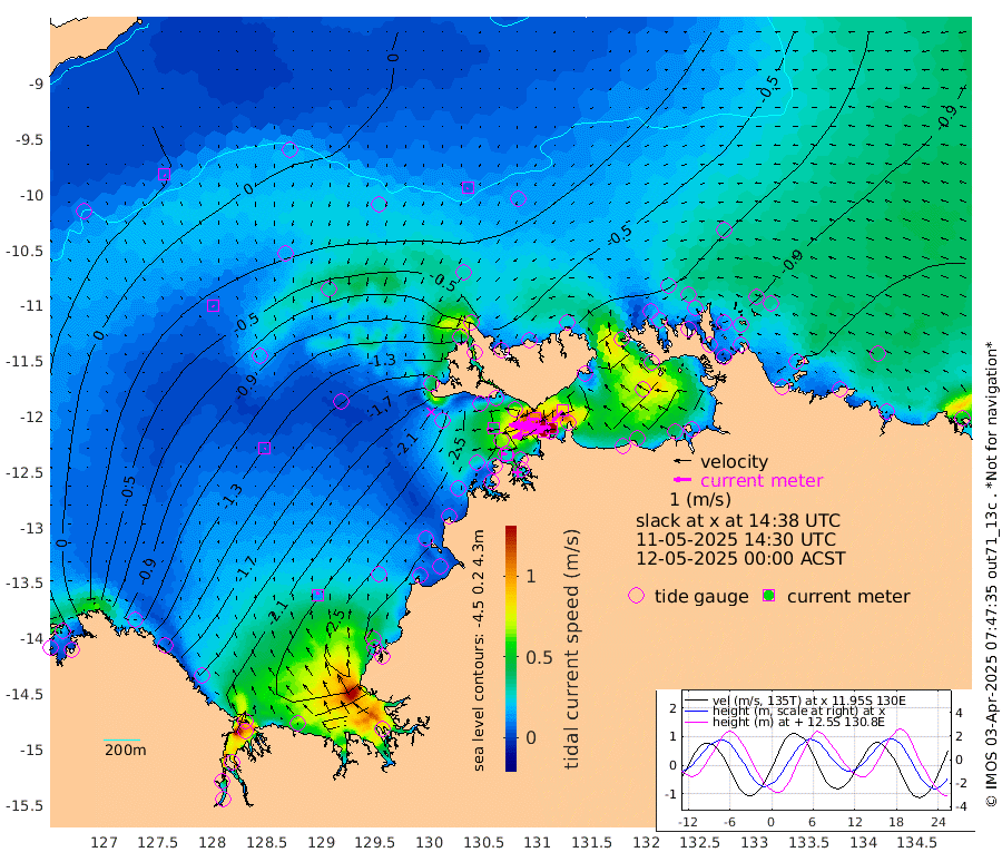 180cm/s -101T +4cm/s rms + 6cm/s 51T. Darwin_C1 52m 163cm/s -91T +4cm/s rms + 7cm/s -161T. Darwin_CW1 22m 110cm/s -106T +4cm/s rms + 8cm/s 61T. Darwin_CW2 34m 83cm/s -135T +3cm/s rms + 9cm/s 98T. Darwin_CW3 22m 177cm/s -91T +5cm/s rms + 7cm/s 88T. Darwin_C3 56m 103cm/s -115T +2cm/s rms + 9cm/s -126T. Darwin_CTbW 22m 7cm/s -160T +9cm/s rms + 2cm/s -110T. NWSLYN 196m 39cm/s -100T +1cm/s rms + 1cm/s -47T. DARBGF 30m 7cm/s 147T +7cm/s rms + 2cm/s -137T. ITFTIS 464m 5cm/s 137T +9cm/s rms + 1cm/s 74T. ITFMHB 146m 15cm/s 10T +4cm/s rms + 1cm/s -134T. ITFJBG 61m 4cm/s 86T +6cm/s rms + 4cm/s 121T. ITFFTB 108m 27cm/s -75T +4cm/s rms + 3cm/s 80T. NRSDAR 19m 28cm Carronade Island 32cm Guy Point 27cm Napier Broome Bay -99cm Lesueur Island -186cm Reveley Island -85cm Rocky Island -265cm Cape Domett -252cm Lacrosse Island -259cm Adolphus Island -177cm Pender Point -160cm Wyndham -66cm The Boxers -89cm Unnamed Shoal 6cm Loxton Shoal -284cm Pelican Island -52cm Calder Shoal -8cm Evans Shoal -314cm Quoin Island -293cm Port Keats -280cm Jones Point -268cm Catfish Island -233cm Cape Scott Offshore -234cm Cape Ford -260cm Anson Bay -28cm Goodrich Bank -235cm Peron Island North -222cm Point Jenny -220cm Native Point -245cm Fish Reef -250cm Tapa Bay -137cm Point Fawcett (Offshore) -270cm Burge Point -233cm Munkunuwa -202cm Beagle A -259cm Parsons Bank -260cm Fenton Patches -18cm Lynedoch Bank -255cm Hancox Shoal Area -277cm Nightcliff -295cm Darwin -272cm Charles Point Patches -213cm Glyde Point -160cm Chambers Bay -155cm Point Stuart -184cm Cape Hotham -145cm Christine Reef -162cm West Alligator Head -146cm East Field Island -149cm Two Hills Bay -151cm Newby Shoal -148cm Camp Point -253cm Medina Inlet South -116cm South Barlow Point -83cm St. Asaph Bay -33cm Cape Van Dieman -46cm Snake Bay -40cm Cache Point 27cm Echo Shoal -57cm Point Jahleel (Off) -104cm Cape Don -63cm Port Essington -61cm Smith Point - West -56cm NW Peacock Island -49cm North Of Jones Shoal -19cm Peacock Island -71cm Point David -62cm D'urville Point -51cm Money Shoal -72cm Copeland Island -102cm Cape Cockburn -75cm One Tree Point -84cm Hogmany Shoal -77cm New Year Island - West -77cm Grant Island -94cm Aurari Bay -99cm Cuthbert Point -92cm North Goulburn Island -110cm Paxie Shoal -113cm Entrance Island -127cm Yabooma Island