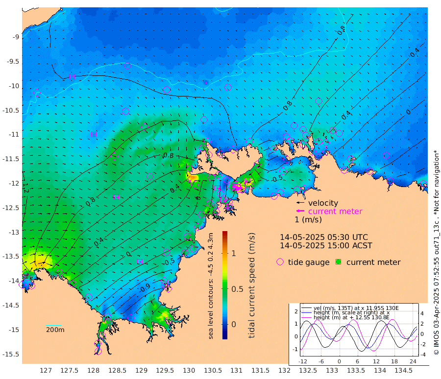 85cm/s -100T +4cm/s rms + 6cm/s 51T. Darwin_C1 52m 85cm/s -92T +4cm/s rms + 7cm/s -161T. Darwin_CW1 22m 30cm/s -106T +4cm/s rms + 8cm/s 61T. Darwin_CW2 34m 60cm/s -136T +3cm/s rms + 9cm/s 98T. Darwin_CW3 22m 71cm/s -91T +5cm/s rms + 7cm/s 88T. Darwin_C3 56m 38cm/s -116T +2cm/s rms + 9cm/s -126T. Darwin_CTbW 22m 10cm/s 139T +9cm/s rms + 2cm/s -110T. NWSLYN 196m 29cm/s 102T +1cm/s rms + 1cm/s -47T. DARBGF 30m 13cm/s 46T +7cm/s rms + 2cm/s -137T. ITFTIS 464m 13cm/s 79T +9cm/s rms + 1cm/s 74T. ITFMHB 146m 21cm/s 113T +4cm/s rms + 1cm/s -134T. ITFJBG 61m 31cm/s 105T +6cm/s rms + 4cm/s 121T. ITFFTB 108m 33cm/s 136T +4cm/s rms + 3cm/s 80T. NRSDAR 19m 78cm Carronade Island 73cm Guy Point 82cm Napier Broome Bay 36cm Lesueur Island -58cm Reveley Island -35cm Rocky Island -124cm Cape Domett -100cm Lacrosse Island -170cm Adolphus Island -165cm Pender Point -168cm Wyndham 86cm The Boxers 98cm Unnamed Shoal 104cm Loxton Shoal -142cm Pelican Island 98cm Calder Shoal 90cm Evans Shoal -244cm Quoin Island -87cm Port Keats -90cm Jones Point -246cm Catfish Island -26cm Cape Scott Offshore 63cm Cape Ford -31cm Anson Bay 93cm Goodrich Bank -11cm Peron Island North 4cm Point Jenny 9cm Native Point -8cm Fish Reef -13cm Tapa Bay 60cm Point Fawcett (Offshore) -21cm Burge Point -12cm Munkunuwa 30cm Beagle A -36cm Parsons Bank -16cm Fenton Patches 86cm Lynedoch Bank -46cm Hancox Shoal Area -41cm Nightcliff -50cm Darwin -23cm Charles Point Patches -57cm Glyde Point -95cm Chambers Bay -104cm Point Stuart -62cm Cape Hotham -80cm Christine Reef -122cm West Alligator Head -135cm East Field Island -65cm Two Hills Bay 73cm Newby Shoal -53cm Camp Point -15cm Medina Inlet South 68cm South Barlow Point 80cm St. Asaph Bay 95cm Cape Van Dieman 94cm Snake Bay 89cm Cache Point 101cm Echo Shoal 66cm Point Jahleel (Off) 19cm Cape Don 57cm Port Essington 57cm Smith Point - West 58cm NW Peacock Island 68cm North Of Jones Shoal 22cm Peacock Island 38cm Point David 55cm D'urville Point 58cm Money Shoal 30cm Copeland Island 39cm Cape Cockburn 37cm One Tree Point 37cm Hogmany Shoal 42cm New Year Island - West 36cm Grant Island 6cm Aurari Bay -14cm Cuthbert Point 14cm North Goulburn Island -25cm Paxie Shoal -42cm Entrance Island -81cm Yabooma Island