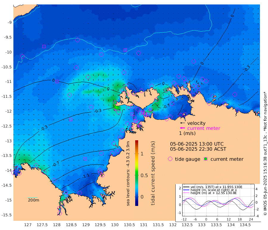 8cm/s -97T +4cm/s rms + 6cm/s 51T. Darwin_C1 52m 21cm/s -88T +4cm/s rms + 7cm/s -161T. Darwin_CW1 22m 14cm/s -106T +4cm/s rms + 8cm/s 61T. Darwin_CW2 34m 17cm/s -151T +3cm/s rms + 9cm/s 98T. Darwin_CW3 22m 35cm/s -88T +5cm/s rms + 7cm/s 88T. Darwin_C3 56m 2cm/s 50T +2cm/s rms + 9cm/s -126T. Darwin_CTbW 22m 8cm/s 159T +9cm/s rms + 2cm/s -110T. NWSLYN 196m 15cm/s 107T +1cm/s rms + 1cm/s -47T. DARBGF 30m 4cm/s 123T +7cm/s rms + 2cm/s -137T. ITFTIS 464m 7cm/s 158T +9cm/s rms + 1cm/s 74T. ITFMHB 146m 13cm/s 135T +4cm/s rms + 1cm/s -134T. ITFJBG 61m 16cm/s 133T +6cm/s rms + 4cm/s 121T. ITFFTB 108m 19cm/s 126T +4cm/s rms + 3cm/s 80T. NRSDAR 19m -47cm Carronade Island -41cm Guy Point -49cm Napier Broome Bay -74cm Lesueur Island -96cm Reveley Island -75cm Rocky Island -143cm Cape Domett -135cm Lacrosse Island -163cm Adolphus Island -166cm Pender Point -182cm Wyndham -17cm The Boxers -7cm Unnamed Shoal 11cm Loxton Shoal -129cm Pelican Island -5cm Calder Shoal 13cm Evans Shoal -192cm Quoin Island -111cm Port Keats -112cm Jones Point -202cm Catfish Island -60cm Cape Scott Offshore -83cm Cape Ford -59cm Anson Bay 13cm Goodrich Bank -61cm Peron Island North -57cm Point Jenny -55cm Native Point -73cm Fish Reef -60cm Tapa Bay -18cm Point Fawcett (Offshore) -88cm Burge Point -49cm Munkunuwa -61cm Beagle A -68cm Parsons Bank -87cm Fenton Patches 11cm Lynedoch Bank -70cm Hancox Shoal Area -76cm Nightcliff -87cm Darwin -72cm Charles Point Patches -91cm Glyde Point -104cm Chambers Bay -117cm Point Stuart -91cm Cape Hotham -99cm Christine Reef -129cm West Alligator Head -146cm East Field Island -88cm Two Hills Bay -56cm Newby Shoal -86cm Camp Point -64cm Medina Inlet South -6cm South Barlow Point 1cm St. Asaph Bay 15cm Cape Van Dieman 15cm Snake Bay 5cm Cache Point 7cm Echo Shoal -3cm Point Jahleel (Off) -30cm Cape Don -2cm Port Essington 1cm Smith Point - West 2cm NW Peacock Island 7cm North Of Jones Shoal 2cm Peacock Island 1cm Point David 3cm D'urville Point 2cm Money Shoal -1cm Copeland Island -13cm Cape Cockburn -4cm One Tree Point -6cm Hogmany Shoal -7cm New Year Island - West -6cm Grant Island -16cm Aurari Bay -28cm Cuthbert Point -14cm North Goulburn Island -29cm Paxie Shoal -45cm Entrance Island -59cm Yabooma Island