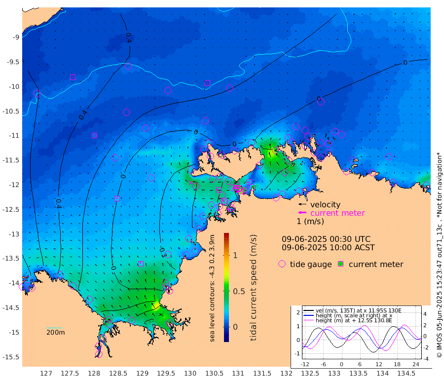 63cm/s -104T +4cm/s rms + 6cm/s 51T. Darwin_C1 52m 40cm/s -88T +4cm/s rms + 7cm/s -161T. Darwin_CW1 22m 51cm/s -109T +4cm/s rms + 8cm/s 61T. Darwin_CW2 34m 17cm/s -112T +3cm/s rms + 9cm/s 98T. Darwin_CW3 22m 51cm/s -93T +5cm/s rms + 7cm/s 88T. Darwin_C3 56m 45cm/s -115T +2cm/s rms + 9cm/s -126T. Darwin_CTbW 22m 2cm/s 72T +9cm/s rms + 2cm/s -110T. NWSLYN 196m 34cm/s -88T +1cm/s rms + 1cm/s -47T. DARBGF 30m 3cm/s 10T +7cm/s rms + 2cm/s -137T. ITFTIS 464m 8cm/s 14T +9cm/s rms + 1cm/s 74T. ITFMHB 146m 24cm/s -22T +4cm/s rms + 1cm/s -134T. ITFJBG 61m 18cm/s -29T +6cm/s rms + 4cm/s 121T. ITFFTB 108m 31cm/s -62T +4cm/s rms + 3cm/s 80T. NRSDAR 19m 122cm Carronade Island 126cm Guy Point 123cm Napier Broome Bay 83cm Lesueur Island 34cm Reveley Island 24cm Rocky Island 28cm Cape Domett 33cm Lacrosse Island 48cm Adolphus Island 105cm Pender Point 129cm Wyndham 33cm The Boxers 12cm Unnamed Shoal 59cm Loxton Shoal -5cm Pelican Island 36cm Calder Shoal 39cm Evans Shoal 50cm Quoin Island -21cm Port Keats -28cm Jones Point 54cm Catfish Island -34cm Cape Scott Offshore -13cm Cape Ford -55cm Anson Bay 22cm Goodrich Bank -34cm Peron Island North -45cm Point Jenny -45cm Native Point -45cm Fish Reef -52cm Tapa Bay -14cm Point Fawcett (Offshore) -44cm Burge Point -57cm Munkunuwa -30cm Beagle A -54cm Parsons Bank -45cm Fenton Patches 30cm Lynedoch Bank -49cm Hancox Shoal Area -55cm Nightcliff -51cm Darwin -47cm Charles Point Patches -12cm Glyde Point 22cm Chambers Bay 36cm Point Stuart 6cm Cape Hotham 25cm Christine Reef 42cm West Alligator Head 63cm East Field Island 22cm Two Hills Bay 15cm Newby Shoal 20cm Camp Point -49cm Medina Inlet South -14cm South Barlow Point 0cm St. Asaph Bay 17cm Cape Van Dieman 16cm Snake Bay 22cm Cache Point 72cm Echo Shoal 17cm Point Jahleel (Off) 4cm Cape Don 6cm Port Essington 4cm Smith Point - West 7cm NW Peacock Island 15cm North Of Jones Shoal 3cm Peacock Island -3cm Point David 1cm D'urville Point 10cm Money Shoal -5cm Copeland Island 0cm Cape Cockburn 1cm One Tree Point 8cm Hogmany Shoal 4cm New Year Island - West 2cm Grant Island -12cm Aurari Bay -11cm Cuthbert Point -5cm North Goulburn Island -9cm Paxie Shoal -12cm Entrance Island -18cm Yabooma Island
