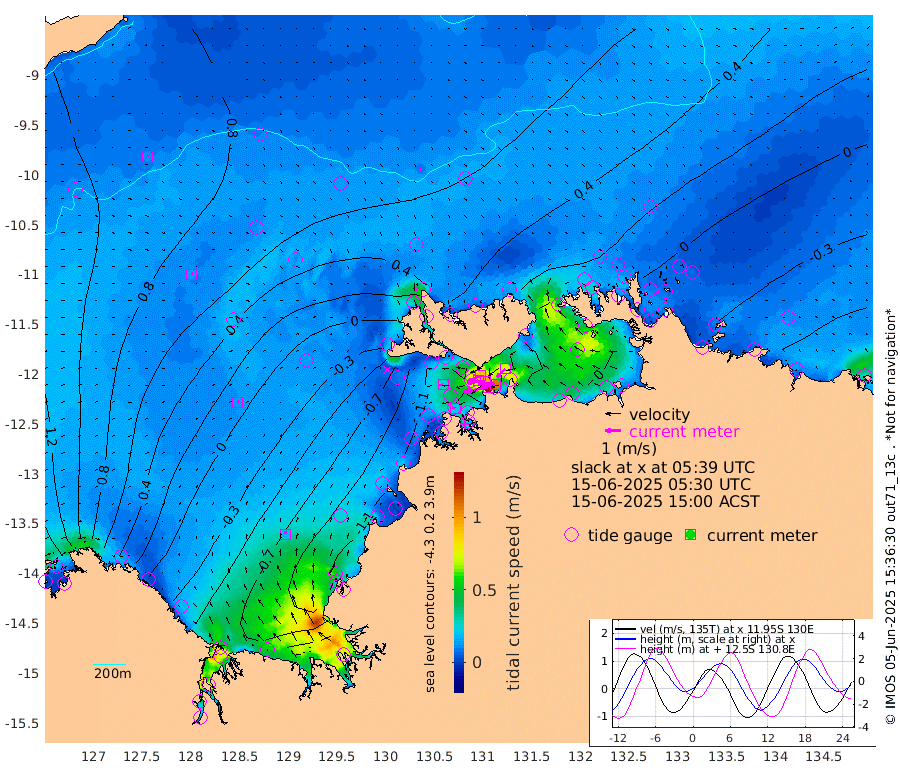163cm/s -101T +4cm/s rms + 6cm/s 51T. Darwin_C1 52m 108cm/s -90T +4cm/s rms + 7cm/s -161T. Darwin_CW1 22m 72cm/s -107T +4cm/s rms + 8cm/s 61T. Darwin_CW2 34m 75cm/s -134T +3cm/s rms + 9cm/s 98T. Darwin_CW3 22m 95cm/s -91T +5cm/s rms + 7cm/s 88T. Darwin_C3 56m 90cm/s -115T +2cm/s rms + 9cm/s -126T. Darwin_CTbW 22m 9cm/s 143T +9cm/s rms + 2cm/s -110T. NWSLYN 196m 25cm/s -95T +1cm/s rms + 1cm/s -47T. DARBGF 30m 11cm/s 34T +7cm/s rms + 2cm/s -137T. ITFTIS 464m 14cm/s 38T +9cm/s rms + 1cm/s 74T. ITFMHB 146m 20cm/s 3T +4cm/s rms + 1cm/s -134T. ITFJBG 61m 14cm/s 36T +6cm/s rms + 4cm/s 121T. ITFFTB 108m 22cm/s -79T +4cm/s rms + 3cm/s 80T. NRSDAR 19m 130cm Carronade Island 129cm Guy Point 143cm Napier Broome Bay 51cm Lesueur Island -58cm Reveley Island -10cm Rocky Island -99cm Cape Domett -86cm Lacrosse Island -104cm Adolphus Island -27cm Pender Point 0cm Wyndham 55cm The Boxers 35cm Unnamed Shoal 93cm Loxton Shoal -131cm Pelican Island 55cm Calder Shoal 68cm Evans Shoal -126cm Quoin Island -133cm Port Keats -126cm Jones Point -48cm Catfish Island -90cm Cape Scott Offshore -55cm Cape Ford -110cm Anson Bay 52cm Goodrich Bank -89cm Peron Island North -88cm Point Jenny -86cm Native Point -94cm Fish Reef -108cm Tapa Bay -12cm Point Fawcett (Offshore) -117cm Burge Point -114cm Munkunuwa -65cm Beagle A -128cm Parsons Bank -113cm Fenton Patches 60cm Lynedoch Bank -126cm Hancox Shoal Area -138cm Nightcliff -130cm Darwin -102cm Charles Point Patches -83cm Glyde Point -58cm Chambers Bay -51cm Point Stuart -69cm Cape Hotham -54cm Christine Reef -57cm West Alligator Head -39cm East Field Island -46cm Two Hills Bay 1cm Newby Shoal -38cm Camp Point -104cm Medina Inlet South -10cm South Barlow Point 16cm St. Asaph Bay 48cm Cape Van Dieman 42cm Snake Bay 48cm Cache Point 108cm Echo Shoal 27cm Point Jahleel (Off) -7cm Cape Don 23cm Port Essington 15cm Smith Point - West 20cm NW Peacock Island 34cm North Of Jones Shoal 10cm Peacock Island -1cm Point David 12cm D'urville Point 29cm Money Shoal -7cm Copeland Island -6cm Cape Cockburn 5cm One Tree Point 5cm Hogmany Shoal 6cm New Year Island - West 0cm Grant Island -24cm Aurari Bay -28cm Cuthbert Point -17cm North Goulburn Island -30cm Paxie Shoal -50cm Entrance Island -69cm Yabooma Island