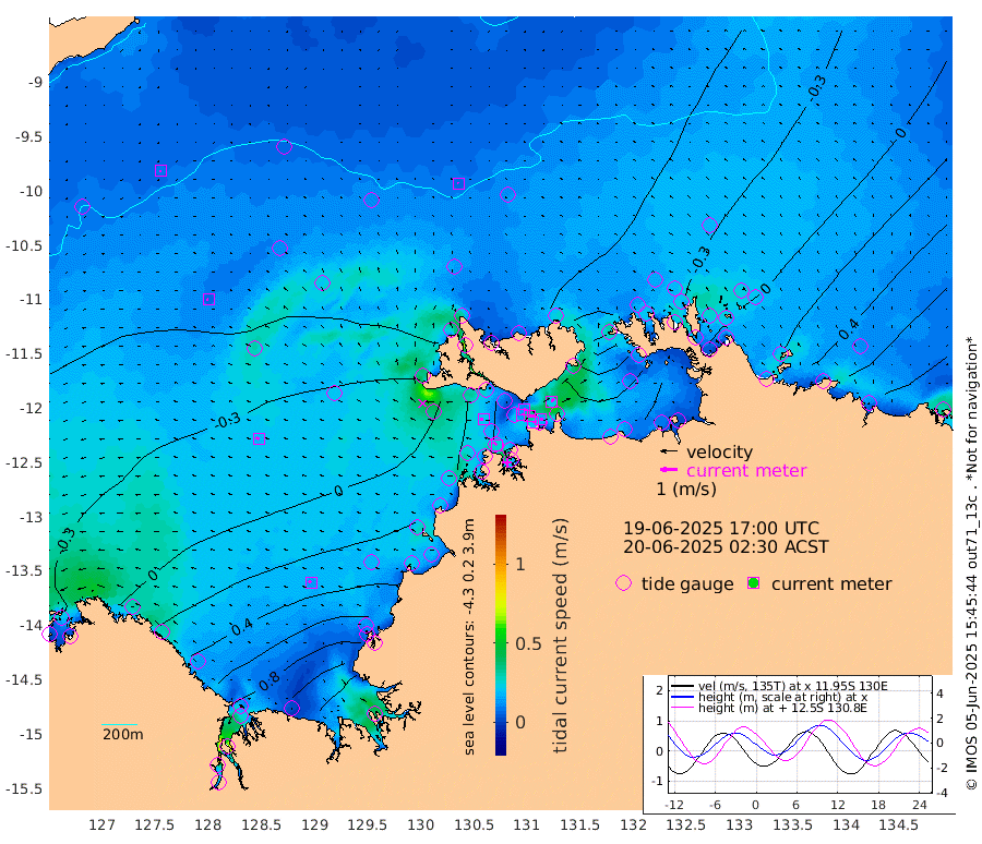 21cm/s 80T +4cm/s rms + 6cm/s 51T. Darwin_C1 52m 16cm/s 87T +4cm/s rms + 7cm/s -161T. Darwin_CW1 22m 14cm/s 74T +4cm/s rms + 8cm/s 61T. Darwin_CW2 34m 24cm/s 36T +3cm/s rms + 9cm/s 98T. Darwin_CW3 22m 33cm/s 90T +5cm/s rms + 7cm/s 88T. Darwin_C3 56m 11cm/s 67T +2cm/s rms + 9cm/s -126T. Darwin_CTbW 22m 6cm/s -20T +9cm/s rms + 2cm/s -110T. NWSLYN 196m 20cm/s -81T +1cm/s rms + 1cm/s -47T. DARBGF 30m 8cm/s -122T +7cm/s rms + 2cm/s -137T. ITFTIS 464m 8cm/s -84T +9cm/s rms + 1cm/s 74T. ITFMHB 146m 14cm/s -54T +4cm/s rms + 1cm/s -134T. ITFJBG 61m 20cm/s -66T +6cm/s rms + 4cm/s 121T. ITFFTB 108m 25cm/s -51T +4cm/s rms + 3cm/s 80T. NRSDAR 19m -2cm Carronade Island 5cm Guy Point -11cm Napier Broome Bay 29cm Lesueur Island 70cm Reveley Island -5cm Rocky Island 118cm Cape Domett 110cm Lacrosse Island 151cm Adolphus Island 145cm Pender Point 163cm Wyndham -41cm The Boxers -45cm Unnamed Shoal -68cm Loxton Shoal 133cm Pelican Island -52cm Calder Shoal -57cm Evans Shoal 187cm Quoin Island 84cm Port Keats 89cm Jones Point 209cm Catfish Island 42cm Cape Scott Offshore -3cm Cape Ford 46cm Anson Bay -53cm Goodrich Bank 27cm Peron Island North 31cm Point Jenny 26cm Native Point 27cm Fish Reef 41cm Tapa Bay -24cm Point Fawcett (Offshore) 42cm Burge Point 15cm Munkunuwa 13cm Beagle A 44cm Parsons Bank 47cm Fenton Patches -53cm Lynedoch Bank 65cm Hancox Shoal Area 63cm Nightcliff 54cm Darwin 39cm Charles Point Patches 73cm Glyde Point 118cm Chambers Bay 116cm Point Stuart 80cm Cape Hotham 105cm Christine Reef 131cm West Alligator Head 146cm East Field Island 80cm Two Hills Bay -19cm Newby Shoal 78cm Camp Point 24cm Medina Inlet South -40cm South Barlow Point -43cm St. Asaph Bay -54cm Cape Van Dieman -58cm Snake Bay -44cm Cache Point -58cm Echo Shoal -28cm Point Jahleel (Off) 9cm Cape Don -24cm Port Essington -20cm Smith Point - West -19cm NW Peacock Island -32cm North Of Jones Shoal -10cm Peacock Island 4cm Point David -16cm D'urville Point -17cm Money Shoal 11cm Copeland Island 10cm Cape Cockburn -2cm One Tree Point 20cm Hogmany Shoal 3cm New Year Island - West 7cm Grant Island 32cm Aurari Bay 52cm Cuthbert Point 26cm North Goulburn Island 62cm Paxie Shoal 90cm Entrance Island 129cm Yabooma Island