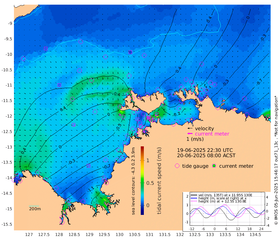 49cm/s -103T +4cm/s rms + 6cm/s 51T. Darwin_C1 52m 32cm/s -89T +4cm/s rms + 7cm/s -161T. Darwin_CW1 22m 32cm/s -108T +4cm/s rms + 8cm/s 61T. Darwin_CW2 34m 37cm/s -134T +3cm/s rms + 9cm/s 98T. Darwin_CW3 22m 58cm/s -91T +5cm/s rms + 7cm/s 88T. Darwin_C3 56m 27cm/s -115T +2cm/s rms + 9cm/s -126T. Darwin_CTbW 22m 1cm/s 169T +9cm/s rms + 2cm/s -110T. NWSLYN 196m 15cm/s 104T +1cm/s rms + 1cm/s -47T. DARBGF 30m 7cm/s 86T +7cm/s rms + 2cm/s -137T. ITFTIS 464m 10cm/s 123T +9cm/s rms + 1cm/s 74T. ITFMHB 146m 13cm/s 116T +4cm/s rms + 1cm/s -134T. ITFJBG 61m 20cm/s 113T +6cm/s rms + 4cm/s 121T. ITFFTB 108m 21cm/s 136T +4cm/s rms + 3cm/s 80T. NRSDAR 19m 39cm Carronade Island 35cm Guy Point 34cm Napier Broome Bay 8cm Lesueur Island -57cm Reveley Island -12cm Rocky Island -112cm Cape Domett -91cm Lacrosse Island -123cm Adolphus Island -130cm Pender Point -131cm Wyndham 44cm The Boxers 35cm Unnamed Shoal 78cm Loxton Shoal -122cm Pelican Island 61cm Calder Shoal 67cm Evans Shoal -164cm Quoin Island -94cm Port Keats -96cm Jones Point -163cm Catfish Island -47cm Cape Scott Offshore -1cm Cape Ford -59cm Anson Bay 58cm Goodrich Bank -33cm Peron Island North -41cm Point Jenny -38cm Native Point -37cm Fish Reef -53cm Tapa Bay 22cm Point Fawcett (Offshore) -60cm Burge Point -41cm Munkunuwa -12cm Beagle A -66cm Parsons Bank -51cm Fenton Patches 57cm Lynedoch Bank -73cm Hancox Shoal Area -71cm Nightcliff -73cm Darwin -52cm Charles Point Patches -73cm Glyde Point -99cm Chambers Bay -99cm Point Stuart -71cm Cape Hotham -89cm Christine Reef -111cm West Alligator Head -115cm East Field Island -70cm Two Hills Bay 20cm Newby Shoal -69cm Camp Point -44cm Medina Inlet South 32cm South Barlow Point 46cm St. Asaph Bay 57cm Cape Van Dieman 57cm Snake Bay 52cm Cache Point 87cm Echo Shoal 35cm Point Jahleel (Off) -11cm Cape Don 23cm Port Essington 25cm Smith Point - West 23cm NW Peacock Island 38cm North Of Jones Shoal 11cm Peacock Island -7cm Point David 19cm D'urville Point 17cm Money Shoal -12cm Copeland Island -11cm Cape Cockburn -2cm One Tree Point -18cm Hogmany Shoal -3cm New Year Island - West -9cm Grant Island -30cm Aurari Bay -56cm Cuthbert Point -32cm North Goulburn Island -75cm Paxie Shoal -91cm Entrance Island -125cm Yabooma Island