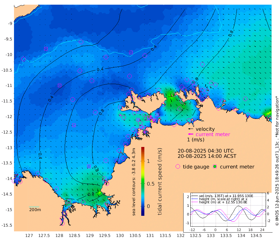 66cm/s 78T +4cm/s rms + 6cm/s 51T. Darwin_C1 52m 20cm/s 77T +4cm/s rms + 7cm/s -161T. Darwin_CW1 22m 14cm/s 80T +4cm/s rms + 8cm/s 61T. Darwin_CW2 34m 18cm/s 55T +3cm/s rms + 9cm/s 98T. Darwin_CW3 22m 9cm/s 91T +5cm/s rms + 7cm/s 88T. Darwin_C3 56m 49cm/s 62T +2cm/s rms + 9cm/s -126T. Darwin_CTbW 22m 5cm/s 141T +9cm/s rms + 2cm/s -110T. NWSLYN 196m 21cm/s 93T +1cm/s rms + 1cm/s -47T. DARBGF 30m 5cm/s -5T +7cm/s rms + 2cm/s -137T. ITFTIS 464m 5cm/s 27T +9cm/s rms + 1cm/s 74T. ITFMHB 146m 14cm/s 144T +4cm/s rms + 1cm/s -134T. ITFJBG 61m 11cm/s 122T +6cm/s rms + 4cm/s 121T. ITFFTB 108m 19cm/s 121T +4cm/s rms + 3cm/s 80T. NRSDAR 19m -12cm Carronade Island -21cm Guy Point -11cm Napier Broome Bay 9cm Lesueur Island 9cm Reveley Island -9cm Rocky Island 2cm Cape Domett 6cm Lacrosse Island -16cm Adolphus Island -49cm Pender Point -51cm Wyndham 32cm The Boxers 60cm Unnamed Shoal 4cm Loxton Shoal 18cm Pelican Island 23cm Calder Shoal 18cm Evans Shoal -23cm Quoin Island 32cm Port Keats 41cm Jones Point 50cm Catfish Island 48cm Cape Scott Offshore 53cm Cape Ford 60cm Anson Bay 31cm Goodrich Bank 64cm Peron Island North 60cm Point Jenny 59cm Native Point 66cm Fish Reef 60cm Tapa Bay 54cm Point Fawcett (Offshore) 58cm Burge Point 50cm Munkunuwa 56cm Beagle A 66cm Parsons Bank 57cm Fenton Patches 26cm Lynedoch Bank 59cm Hancox Shoal Area 55cm Nightcliff 64cm Darwin 66cm Charles Point Patches 48cm Glyde Point 25cm Chambers Bay 30cm Point Stuart 44cm Cape Hotham 23cm Christine Reef 25cm West Alligator Head 12cm East Field Island 42cm Two Hills Bay 50cm Newby Shoal 29cm Camp Point 60cm Medina Inlet South 49cm South Barlow Point 38cm St. Asaph Bay 37cm Cape Van Dieman 41cm Snake Bay 41cm Cache Point -5cm Echo Shoal 41cm Point Jahleel (Off) 55cm Cape Don 57cm Port Essington 58cm Smith Point - West 60cm NW Peacock Island 49cm North Of Jones Shoal 20cm Peacock Island 76cm Point David 65cm D'urville Point 60cm Money Shoal 76cm Copeland Island 100cm Cape Cockburn 73cm One Tree Point 94cm Hogmany Shoal 75cm New Year Island - West 77cm Grant Island 84cm Aurari Bay 93cm Cuthbert Point 84cm North Goulburn Island 85cm Paxie Shoal 89cm Entrance Island 92cm Yabooma Island