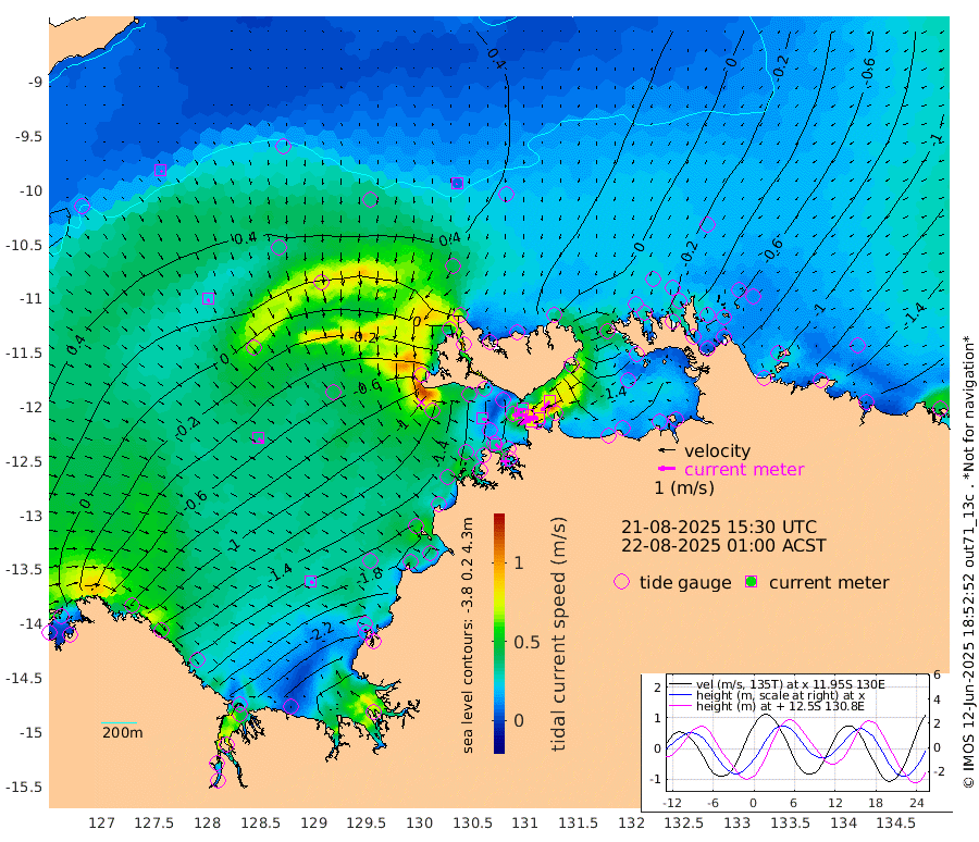 75cm/s -101T +4cm/s rms + 6cm/s 51T. Darwin_C1 52m 85cm/s -93T +4cm/s rms + 7cm/s -161T. Darwin_CW1 22m 43cm/s -106T +4cm/s rms + 8cm/s 61T. Darwin_CW2 34m 72cm/s -140T +3cm/s rms + 9cm/s 98T. Darwin_CW3 22m 88cm/s -90T +5cm/s rms + 7cm/s 88T. Darwin_C3 56m 28cm/s -116T +2cm/s rms + 9cm/s -126T. Darwin_CTbW 22m 6cm/s -154T +9cm/s rms + 2cm/s -110T. NWSLYN 196m 26cm/s 108T +1cm/s rms + 1cm/s -47T. DARBGF 30m 12cm/s 140T +7cm/s rms + 2cm/s -137T. ITFTIS 464m 23cm/s 162T +9cm/s rms + 1cm/s 74T. ITFMHB 146m 23cm/s 126T +4cm/s rms + 1cm/s -134T. ITFJBG 61m 35cm/s 131T +6cm/s rms + 4cm/s 121T. ITFFTB 108m 33cm/s 133T +4cm/s rms + 3cm/s 80T. NRSDAR 19m -8cm Carronade Island -10cm Guy Point -8cm Napier Broome Bay -86cm Lesueur Island -162cm Reveley Island -42cm Rocky Island -252cm Cape Domett -225cm Lacrosse Island -276cm Adolphus Island -275cm Pender Point -277cm Wyndham -6cm The Boxers -16cm Unnamed Shoal 48cm Loxton Shoal -254cm Pelican Island 17cm Calder Shoal 42cm Evans Shoal -334cm Quoin Island -225cm Port Keats -224cm Jones Point -276cm Catfish Island -129cm Cape Scott Offshore -154cm Cape Ford -144cm Anson Bay 27cm Goodrich Bank -121cm Peron Island North -116cm Point Jenny -114cm Native Point -127cm Fish Reef -140cm Tapa Bay -31cm Point Fawcett (Offshore) -169cm Burge Point -114cm Munkunuwa -92cm Beagle A -158cm Parsons Bank -153cm Fenton Patches 27cm Lynedoch Bank -166cm Hancox Shoal Area -164cm Nightcliff -190cm Darwin -164cm Charles Point Patches -170cm Glyde Point -183cm Chambers Bay -188cm Point Stuart -162cm Cape Hotham -164cm Christine Reef -203cm West Alligator Head -216cm East Field Island -146cm Two Hills Bay -58cm Newby Shoal -157cm Camp Point -135cm Medina Inlet South -16cm South Barlow Point 6cm St. Asaph Bay 27cm Cape Van Dieman 21cm Snake Bay 17cm Cache Point 58cm Echo Shoal -3cm Point Jahleel (Off) -62cm Cape Don -16cm Port Essington -7cm Smith Point - West -12cm NW Peacock Island 6cm North Of Jones Shoal 0cm Peacock Island -48cm Point David -14cm D'urville Point -23cm Money Shoal -52cm Copeland Island -68cm Cape Cockburn -44cm One Tree Point -74cm Hogmany Shoal -49cm New Year Island - West -54cm Grant Island -75cm Aurari Bay -104cm Cuthbert Point -80cm North Goulburn Island -131cm Paxie Shoal -148cm Entrance Island -187cm Yabooma Island