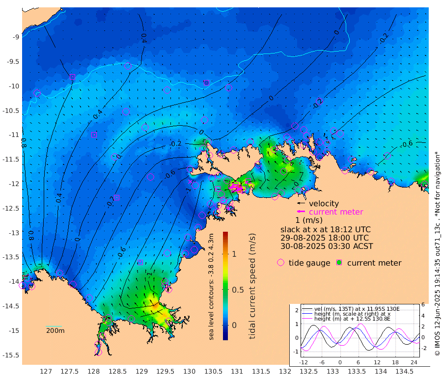108cm/s -102T +4cm/s rms + 6cm/s 51T. Darwin_C1 52m 70cm/s -90T +4cm/s rms + 7cm/s -161T. Darwin_CW1 22m 82cm/s -108T +4cm/s rms + 8cm/s 61T. Darwin_CW2 34m 46cm/s -129T +3cm/s rms + 9cm/s 98T. Darwin_CW3 22m 112cm/s -91T +5cm/s rms + 7cm/s 88T. Darwin_C3 56m 63cm/s -115T +2cm/s rms + 9cm/s -126T. Darwin_CTbW 22m 2cm/s 135T +9cm/s rms + 2cm/s -110T. NWSLYN 196m 25cm/s -98T +1cm/s rms + 1cm/s -47T. DARBGF 30m 5cm/s 75T +7cm/s rms + 2cm/s -137T. ITFTIS 464m 7cm/s 87T +9cm/s rms + 1cm/s 74T. ITFMHB 146m 14cm/s 10T +4cm/s rms + 1cm/s -134T. ITFJBG 61m 9cm/s 56T +6cm/s rms + 4cm/s 121T. ITFFTB 108m 19cm/s -84T +4cm/s rms + 3cm/s 80T. NRSDAR 19m 129cm Carronade Island 130cm Guy Point 130cm Napier Broome Bay 51cm Lesueur Island -46cm Reveley Island -30cm Rocky Island -88cm Cape Domett -64cm Lacrosse Island -91cm Adolphus Island -24cm Pender Point 6cm Wyndham 23cm The Boxers 3cm Unnamed Shoal 57cm Loxton Shoal -119cm Pelican Island 30cm Calder Shoal 39cm Evans Shoal -114cm Quoin Island -125cm Port Keats -118cm Jones Point -35cm Catfish Island -90cm Cape Scott Offshore -63cm Cape Ford -114cm Anson Bay 19cm Goodrich Bank -91cm Peron Island North -88cm Point Jenny -89cm Native Point -95cm Fish Reef -110cm Tapa Bay -29cm Point Fawcett (Offshore) -113cm Burge Point -114cm Munkunuwa -63cm Beagle A -131cm Parsons Bank -105cm Fenton Patches 24cm Lynedoch Bank -123cm Hancox Shoal Area -125cm Nightcliff -139cm Darwin -121cm Charles Point Patches -79cm Glyde Point -40cm Chambers Bay -27cm Point Stuart -55cm Cape Hotham -34cm Christine Reef -27cm West Alligator Head -5cm East Field Island -34cm Two Hills Bay -15cm Newby Shoal -35cm Camp Point -113cm Medina Inlet South -36cm South Barlow Point -7cm St. Asaph Bay 16cm Cape Van Dieman 6cm Snake Bay 20cm Cache Point 81cm Echo Shoal 5cm Point Jahleel (Off) -26cm Cape Don -10cm Port Essington -11cm Smith Point - West -9cm NW Peacock Island 6cm North Of Jones Shoal 0cm Peacock Island -28cm Point David -16cm D'urville Point -5cm Money Shoal -30cm Copeland Island -34cm Cape Cockburn -24cm One Tree Point -28cm Hogmany Shoal -22cm New Year Island - West -28cm Grant Island -41cm Aurari Bay -51cm Cuthbert Point -40cm North Goulburn Island -51cm Paxie Shoal -65cm Entrance Island -74cm Yabooma Island