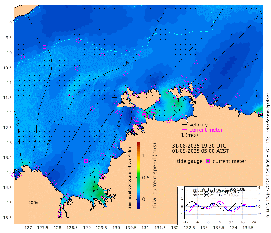 52cm/s -102T +4cm/s rms + 6cm/s 51T. Darwin_C1 52m 7cm/s -89T +4cm/s rms + 7cm/s -161T. Darwin_CW1 22m 31cm/s -109T +4cm/s rms + 8cm/s 61T. Darwin_CW2 34m 19cm/s -125T +3cm/s rms + 9cm/s 98T. Darwin_CW3 22m 35cm/s -92T +5cm/s rms + 7cm/s 88T. Darwin_C3 56m 35cm/s -115T +2cm/s rms + 9cm/s -126T. Darwin_CTbW 22m 4cm/s 111T +9cm/s rms + 2cm/s -110T. NWSLYN 196m 2cm/s -147T +1cm/s rms + 1cm/s -47T. DARBGF 30m 7cm/s 45T +7cm/s rms + 2cm/s -137T. ITFTIS 464m 7cm/s 77T +9cm/s rms + 1cm/s 74T. ITFMHB 146m 6cm/s 49T +4cm/s rms + 1cm/s -134T. ITFJBG 61m 11cm/s 79T +6cm/s rms + 4cm/s 121T. ITFFTB 108m 5cm/s -162T +4cm/s rms + 3cm/s 80T. NRSDAR 19m 97cm Carronade Island 97cm Guy Point 99cm Napier Broome Bay 73cm Lesueur Island 10cm Reveley Island 4cm Rocky Island -8cm Cape Domett 7cm Lacrosse Island -22cm Adolphus Island 7cm Pender Point 16cm Wyndham 57cm The Boxers 46cm Unnamed Shoal 65cm Loxton Shoal -25cm Pelican Island 60cm Calder Shoal 53cm Evans Shoal -41cm Quoin Island -18cm Port Keats -12cm Jones Point -6cm Catfish Island -1cm Cape Scott Offshore 66cm Cape Ford -12cm Anson Bay 44cm Goodrich Bank 0cm Peron Island North 4cm Point Jenny 4cm Native Point 4cm Fish Reef -5cm Tapa Bay 35cm Point Fawcett (Offshore) -6cm Burge Point -13cm Munkunuwa 21cm Beagle A -28cm Parsons Bank -2cm Fenton Patches 42cm Lynedoch Bank -26cm Hancox Shoal Area -23cm Nightcliff -23cm Darwin -7cm Charles Point Patches -9cm Glyde Point -9cm Chambers Bay -6cm Point Stuart -6cm Cape Hotham -9cm Christine Reef -8cm West Alligator Head 0cm East Field Island -5cm Two Hills Bay 44cm Newby Shoal 2cm Camp Point -8cm Medina Inlet South 23cm South Barlow Point 39cm St. Asaph Bay 43cm Cape Van Dieman 37cm Snake Bay 45cm Cache Point 77cm Echo Shoal 32cm Point Jahleel (Off) 9cm Cape Don 19cm Port Essington 16cm Smith Point - West 15cm NW Peacock Island 26cm North Of Jones Shoal 7cm Peacock Island -4cm Point David 10cm D'urville Point 16cm Money Shoal -8cm Copeland Island -7cm Cape Cockburn 0cm One Tree Point -2cm Hogmany Shoal 2cm New Year Island - West -4cm Grant Island -18cm Aurari Bay -29cm Cuthbert Point -16cm North Goulburn Island -29cm Paxie Shoal -45cm Entrance Island -62cm Yabooma Island