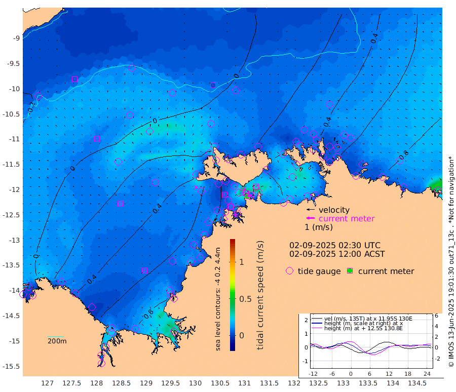 55cm/s 78T +4cm/s rms + 6cm/s 51T. Darwin_C1 52m 6cm/s 79T +4cm/s rms + 7cm/s -161T. Darwin_CW1 22m 14cm/s 76T +4cm/s rms + 8cm/s 61T. Darwin_CW2 34m 29cm/s 44T +3cm/s rms + 9cm/s 98T. Darwin_CW3 22m 22cm/s 92T +5cm/s rms + 7cm/s 88T. Darwin_C3 56m 38cm/s 64T +2cm/s rms + 9cm/s -126T. Darwin_CTbW 22m 2cm/s 30T +9cm/s rms + 2cm/s -110T. NWSLYN 196m 6cm/s -77T +1cm/s rms + 1cm/s -47T. DARBGF 30m 4cm/s -57T +7cm/s rms + 2cm/s -137T. ITFTIS 464m 9cm/s -19T +9cm/s rms + 1cm/s 74T. ITFMHB 146m 8cm/s -44T +4cm/s rms + 1cm/s -134T. ITFJBG 61m 12cm/s -56T +6cm/s rms + 4cm/s 121T. ITFFTB 108m 10cm/s -40T +4cm/s rms + 3cm/s 80T. NRSDAR 19m -9cm Carronade Island -10cm Guy Point -6cm Napier Broome Bay 17cm Lesueur Island 36cm Reveley Island -3cm Rocky Island 52cm Cape Domett 47cm Lacrosse Island 63cm Adolphus Island 55cm Pender Point 62cm Wyndham -2cm The Boxers 24cm Unnamed Shoal -18cm Loxton Shoal 57cm Pelican Island -10cm Calder Shoal -15cm Evans Shoal 82cm Quoin Island 45cm Port Keats 42cm Jones Point 78cm Catfish Island 31cm Cape Scott Offshore -36cm Cape Ford 39cm Anson Bay -5cm Goodrich Bank 29cm Peron Island North 21cm Point Jenny 21cm Native Point 18cm Fish Reef 31cm Tapa Bay 0cm Point Fawcett (Offshore) 29cm Burge Point 19cm Munkunuwa 8cm Beagle A 44cm Parsons Bank 26cm Fenton Patches -1cm Lynedoch Bank 48cm Hancox Shoal Area 46cm Nightcliff 47cm Darwin 34cm Charles Point Patches 46cm Glyde Point 53cm Chambers Bay 56cm Point Stuart 49cm Cape Hotham 49cm Christine Reef 59cm West Alligator Head 58cm East Field Island 51cm Two Hills Bay 9cm Newby Shoal 45cm Camp Point 27cm Medina Inlet South 5cm South Barlow Point -7cm St. Asaph Bay -4cm Cape Van Dieman 6cm Snake Bay -2cm Cache Point -25cm Echo Shoal 9cm Point Jahleel (Off) 29cm Cape Don 18cm Port Essington 19cm Smith Point - West 25cm NW Peacock Island 14cm North Of Jones Shoal 7cm Peacock Island 51cm Point David 28cm D'urville Point 27cm Money Shoal 52cm Copeland Island 64cm Cape Cockburn 45cm One Tree Point 64cm Hogmany Shoal 50cm New Year Island - West 54cm Grant Island 65cm Aurari Bay 74cm Cuthbert Point 63cm North Goulburn Island 81cm Paxie Shoal 90cm Entrance Island 105cm Yabooma Island