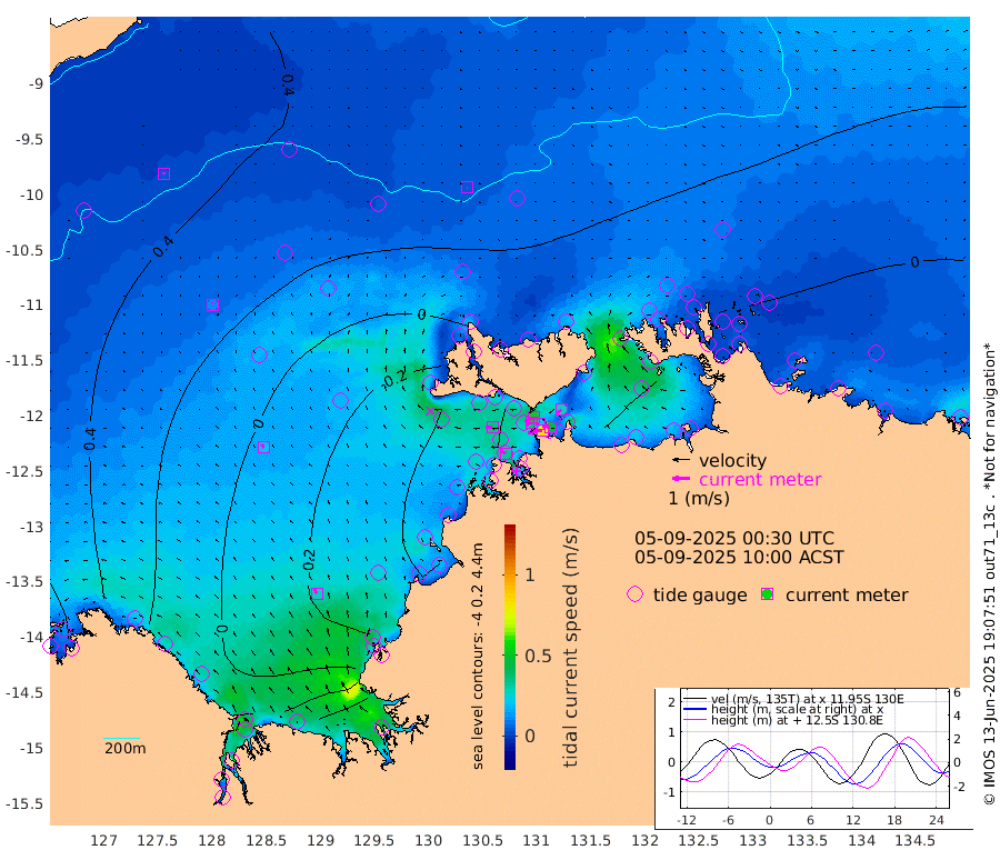 82cm/s -103T +4cm/s rms + 6cm/s 51T. Darwin_C1 52m 44cm/s -87T +4cm/s rms + 7cm/s -161T. Darwin_CW1 22m 36cm/s -111T +4cm/s rms + 8cm/s 61T. Darwin_CW2 34m 28cm/s -127T +3cm/s rms + 9cm/s 98T. Darwin_CW3 22m 22cm/s -93T +5cm/s rms + 7cm/s 88T. Darwin_C3 56m 54cm/s -115T +2cm/s rms + 9cm/s -126T. Darwin_CTbW 22m 3cm/s 115T +9cm/s rms + 2cm/s -110T. NWSLYN 196m 34cm/s -87T +1cm/s rms + 1cm/s -47T. DARBGF 30m 5cm/s -4T +7cm/s rms + 2cm/s -137T. ITFTIS 464m 12cm/s 2T +9cm/s rms + 1cm/s 74T. ITFMHB 146m 27cm/s -25T +4cm/s rms + 1cm/s -134T. ITFJBG 61m 22cm/s -34T +6cm/s rms + 4cm/s 121T. ITFFTB 108m 33cm/s -60T +4cm/s rms + 3cm/s 80T. NRSDAR 19m 74cm Carronade Island 79cm Guy Point 83cm Napier Broome Bay 46cm Lesueur Island 10cm Reveley Island 20cm Rocky Island 14cm Cape Domett 5cm Lacrosse Island 35cm Adolphus Island 91cm Pender Point 106cm Wyndham 24cm The Boxers 5cm Unnamed Shoal 51cm Loxton Shoal -7cm Pelican Island 22cm Calder Shoal 35cm Evans Shoal 44cm Quoin Island -35cm Port Keats -29cm Jones Point 39cm Catfish Island -41cm Cape Scott Offshore -14cm Cape Ford -56cm Anson Bay 23cm Goodrich Bank -39cm Peron Island North -54cm Point Jenny -52cm Native Point -53cm Fish Reef -56cm Tapa Bay -20cm Point Fawcett (Offshore) -56cm Burge Point -59cm Munkunuwa -50cm Beagle A -52cm Parsons Bank -61cm Fenton Patches 31cm Lynedoch Bank -50cm Hancox Shoal Area -71cm Nightcliff -47cm Darwin -39cm Charles Point Patches -18cm Glyde Point 7cm Chambers Bay 18cm Point Stuart -8cm Cape Hotham 5cm Christine Reef 20cm West Alligator Head 35cm East Field Island 9cm Two Hills Bay -10cm Newby Shoal 9cm Camp Point -49cm Medina Inlet South -14cm South Barlow Point -4cm St. Asaph Bay 18cm Cape Van Dieman 18cm Snake Bay 19cm Cache Point 53cm Echo Shoal 14cm Point Jahleel (Off) 6cm Cape Don 17cm Port Essington 10cm Smith Point - West 15cm NW Peacock Island 17cm North Of Jones Shoal 5cm Peacock Island 11cm Point David 10cm D'urville Point 21cm Money Shoal 9cm Copeland Island 12cm Cape Cockburn 14cm One Tree Point 26cm Hogmany Shoal 14cm New Year Island - West 15cm Grant Island -1cm Aurari Bay 9cm Cuthbert Point 8cm North Goulburn Island 11cm Paxie Shoal 7cm Entrance Island 2cm Yabooma Island