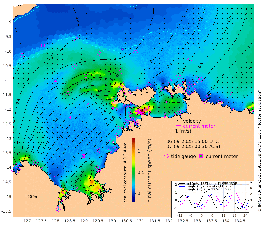138cm/s -101T +4cm/s rms + 6cm/s 51T. Darwin_C1 52m 116cm/s -91T +4cm/s rms + 7cm/s -161T. Darwin_CW1 22m 80cm/s -106T +4cm/s rms + 8cm/s 61T. Darwin_CW2 34m 82cm/s -137T +3cm/s rms + 9cm/s 98T. Darwin_CW3 22m 129cm/s -90T +5cm/s rms + 7cm/s 88T. Darwin_C3 56m 75cm/s -116T +2cm/s rms + 9cm/s -126T. Darwin_CTbW 22m 4cm/s -134T +9cm/s rms + 2cm/s -110T. NWSLYN 196m 14cm/s -120T +1cm/s rms + 1cm/s -47T. DARBGF 30m 10cm/s 146T +7cm/s rms + 2cm/s -137T. ITFTIS 464m 14cm/s 158T +9cm/s rms + 1cm/s 74T. ITFMHB 146m 9cm/s 70T +4cm/s rms + 1cm/s -134T. ITFJBG 61m 17cm/s 124T +6cm/s rms + 4cm/s 121T. ITFFTB 108m 9cm/s -123T +4cm/s rms + 3cm/s 80T. NRSDAR 19m 39cm Carronade Island 36cm Guy Point 38cm Napier Broome Bay -71cm Lesueur Island -166cm Reveley Island -54cm Rocky Island -255cm Cape Domett -229cm Lacrosse Island -266cm Adolphus Island -219cm Pender Point -203cm Wyndham -25cm The Boxers -41cm Unnamed Shoal 43cm Loxton Shoal -280cm Pelican Island -1cm Calder Shoal 32cm Evans Shoal -318cm Quoin Island -264cm Port Keats -259cm Jones Point -255cm Catfish Island -185cm Cape Scott Offshore -187cm Cape Ford -212cm Anson Bay 8cm Goodrich Bank -171cm Peron Island North -175cm Point Jenny -174cm Native Point -182cm Fish Reef -206cm Tapa Bay -76cm Point Fawcett (Offshore) -219cm Burge Point -177cm Munkunuwa -144cm Beagle A -212cm Parsons Bank -210cm Fenton Patches 15cm Lynedoch Bank -220cm Hancox Shoal Area -228cm Nightcliff -247cm Darwin -226cm Charles Point Patches -189cm Glyde Point -170cm Chambers Bay -155cm Point Stuart -161cm Cape Hotham -150cm Christine Reef -164cm West Alligator Head -161cm East Field Island -132cm Two Hills Bay -87cm Newby Shoal -149cm Camp Point -196cm Medina Inlet South -59cm South Barlow Point -31cm St. Asaph Bay 5cm Cape Van Dieman -1cm Snake Bay 1cm Cache Point 61cm Echo Shoal -19cm Point Jahleel (Off) -74cm Cape Don -31cm Port Essington -27cm Smith Point - West -26cm NW Peacock Island -8cm North Of Jones Shoal -5cm Peacock Island -55cm Point David -31cm D'urville Point -31cm Money Shoal -58cm Copeland Island -70cm Cape Cockburn -51cm One Tree Point -74cm Hogmany Shoal -56cm New Year Island - West -59cm Grant Island -81cm Aurari Bay -101cm Cuthbert Point -81cm North Goulburn Island -123cm Paxie Shoal -135cm Entrance Island -161cm Yabooma Island