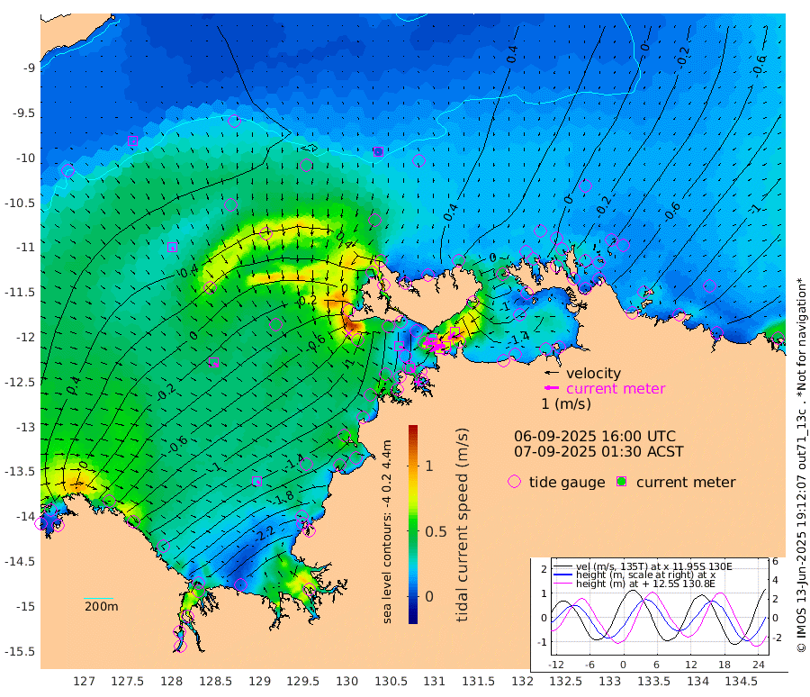 71cm/s -101T +4cm/s rms + 6cm/s 51T. Darwin_C1 52m 73cm/s -94T +4cm/s rms + 7cm/s -161T. Darwin_CW1 22m 46cm/s -105T +4cm/s rms + 8cm/s 61T. Darwin_CW2 34m 67cm/s -140T +3cm/s rms + 9cm/s 98T. Darwin_CW3 22m 93cm/s -90T +5cm/s rms + 7cm/s 88T. Darwin_C3 56m 28cm/s -116T +2cm/s rms + 9cm/s -126T. Darwin_CTbW 22m 5cm/s -166T +9cm/s rms + 2cm/s -110T. NWSLYN 196m 28cm/s 107T +1cm/s rms + 1cm/s -47T. DARBGF 30m 11cm/s 127T +7cm/s rms + 2cm/s -137T. ITFTIS 464m 22cm/s 156T +9cm/s rms + 1cm/s 74T. ITFMHB 146m 26cm/s 126T +4cm/s rms + 1cm/s -134T. ITFJBG 61m 38cm/s 127T +6cm/s rms + 4cm/s 121T. ITFFTB 108m 36cm/s 135T +4cm/s rms + 3cm/s 80T. NRSDAR 19m 29cm Carronade Island 23cm Guy Point 29cm Napier Broome Bay -61cm Lesueur Island -145cm Reveley Island -39cm Rocky Island -241cm Cape Domett -212cm Lacrosse Island -280cm Adolphus Island -273cm Pender Point -276cm Wyndham 16cm The Boxers 8cm Unnamed Shoal 63cm Loxton Shoal -257cm Pelican Island 40cm Calder Shoal 57cm Evans Shoal -358cm Quoin Island -208cm Port Keats -209cm Jones Point -311cm Catfish Island -119cm Cape Scott Offshore -83cm Cape Ford -135cm Anson Bay 43cm Goodrich Bank -101cm Peron Island North -90cm Point Jenny -88cm Native Point -101cm Fish Reef -121cm Tapa Bay -8cm Point Fawcett (Offshore) -134cm Burge Point -93cm Munkunuwa -60cm Beagle A -135cm Parsons Bank -124cm Fenton Patches 39cm Lynedoch Bank -151cm Hancox Shoal Area -147cm Nightcliff -173cm Darwin -148cm Charles Point Patches -153cm Glyde Point -174cm Chambers Bay -172cm Point Stuart -143cm Cape Hotham -148cm Christine Reef -188cm West Alligator Head -202cm East Field Island -130cm Two Hills Bay -18cm Newby Shoal -142cm Camp Point -115cm Medina Inlet South 4cm South Barlow Point 24cm St. Asaph Bay 44cm Cape Van Dieman 37cm Snake Bay 37cm Cache Point 70cm Echo Shoal 14cm Point Jahleel (Off) -43cm Cape Don 0cm Port Essington 7cm Smith Point - West 4cm NW Peacock Island 20cm North Of Jones Shoal 5cm Peacock Island -33cm Point David 1cm D'urville Point -7cm Money Shoal -37cm Copeland Island -42cm Cape Cockburn -28cm One Tree Point -54cm Hogmany Shoal -33cm New Year Island - West -37cm Grant Island -64cm Aurari Bay -89cm Cuthbert Point -62cm North Goulburn Island -117cm Paxie Shoal -133cm Entrance Island -175cm Yabooma Island