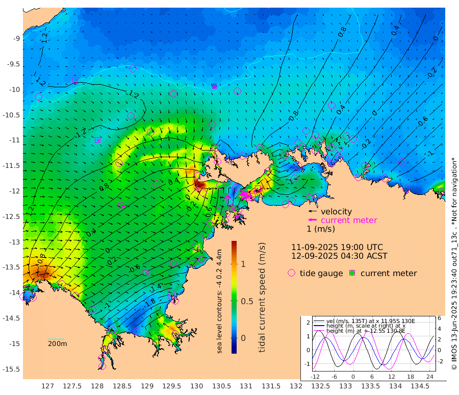 94cm/s -100T +4cm/s rms + 6cm/s 51T. Darwin_C1 52m 76cm/s -92T +4cm/s rms + 7cm/s -161T. Darwin_CW1 22m 46cm/s -107T +4cm/s rms + 8cm/s 61T. Darwin_CW2 34m 71cm/s -136T +3cm/s rms + 9cm/s 98T. Darwin_CW3 22m 103cm/s -90T +5cm/s rms + 7cm/s 88T. Darwin_C3 56m 43cm/s -116T +2cm/s rms + 9cm/s -126T. Darwin_CTbW 22m 9cm/s 147T +9cm/s rms + 2cm/s -110T. NWSLYN 196m 44cm/s 102T +1cm/s rms + 1cm/s -47T. DARBGF 30m 14cm/s 68T +7cm/s rms + 2cm/s -137T. ITFTIS 464m 18cm/s 111T +9cm/s rms + 1cm/s 74T. ITFMHB 146m 34cm/s 122T +4cm/s rms + 1cm/s -134T. ITFJBG 61m 47cm/s 114T +6cm/s rms + 4cm/s 121T. ITFFTB 108m 52cm/s 134T +4cm/s rms + 3cm/s 80T. NRSDAR 19m 60cm Carronade Island 52cm Guy Point 59cm Napier Broome Bay 2cm Lesueur Island -126cm Reveley Island -56cm Rocky Island -220cm Cape Domett -183cm Lacrosse Island -266cm Adolphus Island -281cm Pender Point -286cm Wyndham 85cm The Boxers 85cm Unnamed Shoal 121cm Loxton Shoal -228cm Pelican Island 105cm Calder Shoal 108cm Evans Shoal -357cm Quoin Island -164cm Port Keats -162cm Jones Point -309cm Catfish Island -66cm Cape Scott Offshore 22cm Cape Ford -75cm Anson Bay 105cm Goodrich Bank -46cm Peron Island North -35cm Point Jenny -32cm Native Point -41cm Fish Reef -61cm Tapa Bay 59cm Point Fawcett (Offshore) -80cm Burge Point -53cm Munkunuwa 6cm Beagle A -95cm Parsons Bank -64cm Fenton Patches 97cm Lynedoch Bank -107cm Hancox Shoal Area -99cm Nightcliff -112cm Darwin -70cm Charles Point Patches -117cm Glyde Point -165cm Chambers Bay -177cm Point Stuart -121cm Cape Hotham -150cm Christine Reef -203cm West Alligator Head -218cm East Field Island -122cm Two Hills Bay 51cm Newby Shoal -113cm Camp Point -57cm Medina Inlet South 68cm South Barlow Point 90cm St. Asaph Bay 107cm Cape Van Dieman 102cm Snake Bay 99cm Cache Point 130cm Echo Shoal 66cm Point Jahleel (Off) -4cm Cape Don 54cm Port Essington 56cm Smith Point - West 54cm NW Peacock Island 74cm North Of Jones Shoal 24cm Peacock Island 12cm Point David 50cm D'urville Point 51cm Money Shoal 4cm Copeland Island 8cm Cape Cockburn 18cm One Tree Point -3cm Hogmany Shoal 18cm New Year Island - West 7cm Grant Island -24cm Aurari Bay -61cm Cuthbert Point -24cm North Goulburn Island -87cm Paxie Shoal -117cm Entrance Island -169cm Yabooma Island