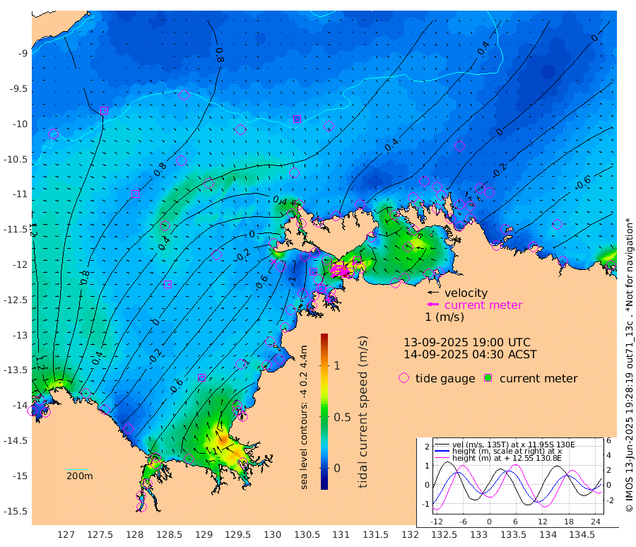 129cm/s -101T +4cm/s rms + 6cm/s 51T. Darwin_C1 52m 81cm/s -90T +4cm/s rms + 7cm/s -161T. Darwin_CW1 22m 73cm/s -107T +4cm/s rms + 8cm/s 61T. Darwin_CW2 34m 57cm/s -132T +3cm/s rms + 9cm/s 98T. Darwin_CW3 22m 110cm/s -91T +5cm/s rms + 7cm/s 88T. Darwin_C3 56m 73cm/s -115T +2cm/s rms + 9cm/s -126T. Darwin_CTbW 22m 7cm/s 133T +9cm/s rms + 2cm/s -110T. NWSLYN 196m 9cm/s -118T +1cm/s rms + 1cm/s -47T. DARBGF 30m 11cm/s 51T +7cm/s rms + 2cm/s -137T. ITFTIS 464m 13cm/s 67T +9cm/s rms + 1cm/s 74T. ITFMHB 146m 14cm/s 42T +4cm/s rms + 1cm/s -134T. ITFJBG 61m 19cm/s 78T +6cm/s rms + 4cm/s 121T. ITFFTB 108m 10cm/s -126T +4cm/s rms + 3cm/s 80T. NRSDAR 19m 132cm Carronade Island 134cm Guy Point 135cm Napier Broome Bay 59cm Lesueur Island -65cm Reveley Island -39cm Rocky Island -114cm Cape Domett -90cm Lacrosse Island -118cm Adolphus Island -77cm Pender Point -52cm Wyndham 64cm The Boxers 38cm Unnamed Shoal 103cm Loxton Shoal -141cm Pelican Island 73cm Calder Shoal 78cm Evans Shoal -162cm Quoin Island -122cm Port Keats -131cm Jones Point -110cm Catfish Island -73cm Cape Scott Offshore -45cm Cape Ford -91cm Anson Bay 64cm Goodrich Bank -77cm Peron Island North -66cm Point Jenny -65cm Native Point -79cm Fish Reef -88cm Tapa Bay 7cm Point Fawcett (Offshore) -100cm Burge Point -100cm Munkunuwa -34cm Beagle A -121cm Parsons Bank -86cm Fenton Patches 67cm Lynedoch Bank -112cm Hancox Shoal Area -108cm Nightcliff -123cm Darwin -89cm Charles Point Patches -87cm Glyde Point -73cm Chambers Bay -81cm Point Stuart -78cm Cape Hotham -63cm Christine Reef -91cm West Alligator Head -77cm East Field Island -66cm Two Hills Bay 25cm Newby Shoal -48cm Camp Point -90cm Medina Inlet South 9cm South Barlow Point 38cm St. Asaph Bay 60cm Cape Van Dieman 52cm Snake Bay 59cm Cache Point 124cm Echo Shoal 35cm Point Jahleel (Off) -11cm Cape Don 22cm Port Essington 20cm Smith Point - West 21cm NW Peacock Island 43cm North Of Jones Shoal 12cm Peacock Island -10cm Point David 14cm D'urville Point 30cm Money Shoal -15cm Copeland Island -16cm Cape Cockburn -3cm One Tree Point -16cm Hogmany Shoal 1cm New Year Island - West -10cm Grant Island -31cm Aurari Bay -51cm Cuthbert Point -30cm North Goulburn Island -55cm Paxie Shoal -80cm Entrance Island -104cm Yabooma Island