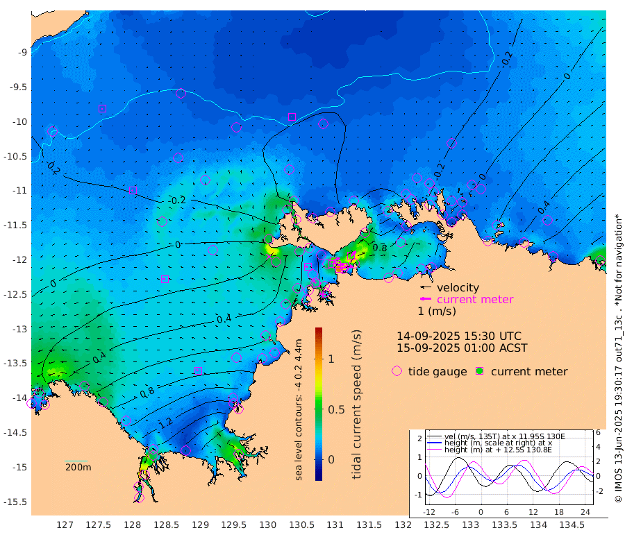 106cm/s 79T +4cm/s rms + 6cm/s 51T. Darwin_C1 52m 85cm/s 91T +4cm/s rms + 7cm/s -161T. Darwin_CW1 22m 37cm/s 71T +4cm/s rms + 8cm/s 61T. Darwin_CW2 34m 61cm/s 47T +3cm/s rms + 9cm/s 98T. Darwin_CW3 22m 68cm/s 91T +5cm/s rms + 7cm/s 88T. Darwin_C3 56m 61cm/s 66T +2cm/s rms + 9cm/s -126T. Darwin_CTbW 22m 3cm/s -2T +9cm/s rms + 2cm/s -110T. NWSLYN 196m 21cm/s -74T +1cm/s rms + 1cm/s -47T. DARBGF 30m 7cm/s -119T +7cm/s rms + 2cm/s -137T. ITFTIS 464m 9cm/s -120T +9cm/s rms + 1cm/s 74T. ITFMHB 146m 17cm/s -49T +4cm/s rms + 1cm/s -134T. ITFJBG 61m 20cm/s -66T +6cm/s rms + 4cm/s 121T. ITFFTB 108m 34cm/s -49T +4cm/s rms + 3cm/s 80T. NRSDAR 19m 75cm Carronade Island 82cm Guy Point 79cm Napier Broome Bay 88cm Lesueur Island 128cm Reveley Island 73cm Rocky Island 186cm Cape Domett 173cm Lacrosse Island 211cm Adolphus Island 234cm Pender Point 254cm Wyndham 6cm The Boxers -13cm Unnamed Shoal -22cm Loxton Shoal 178cm Pelican Island -10cm Calder Shoal -21cm Evans Shoal 262cm Quoin Island 138cm Port Keats 125cm Jones Point 299cm Catfish Island 81cm Cape Scott Offshore 35cm Cape Ford 77cm Anson Bay -30cm Goodrich Bank 65cm Peron Island North 67cm Point Jenny 62cm Native Point 64cm Fish Reef 72cm Tapa Bay 12cm Point Fawcett (Offshore) 83cm Burge Point 51cm Munkunuwa 46cm Beagle A 75cm Parsons Bank 78cm Fenton Patches -28cm Lynedoch Bank 90cm Hancox Shoal Area 93cm Nightcliff 88cm Darwin 69cm Charles Point Patches 105cm Glyde Point 147cm Chambers Bay 156cm Point Stuart 111cm Cape Hotham 144cm Christine Reef 177cm West Alligator Head 192cm East Field Island 118cm Two Hills Bay 38cm Newby Shoal 106cm Camp Point 62cm Medina Inlet South -12cm South Barlow Point -15cm St. Asaph Bay -32cm Cape Van Dieman -35cm Snake Bay -19cm Cache Point -20cm Echo Shoal -4cm Point Jahleel (Off) 36cm Cape Don -8cm Port Essington -5cm Smith Point - West -7cm NW Peacock Island -14cm North Of Jones Shoal -5cm Peacock Island 2cm Point David -7cm D'urville Point -10cm Money Shoal 6cm Copeland Island 14cm Cape Cockburn 4cm One Tree Point 21cm Hogmany Shoal 6cm New Year Island - West 10cm Grant Island 22cm Aurari Bay 47cm Cuthbert Point 25cm North Goulburn Island 59cm Paxie Shoal 69cm Entrance Island 93cm Yabooma Island