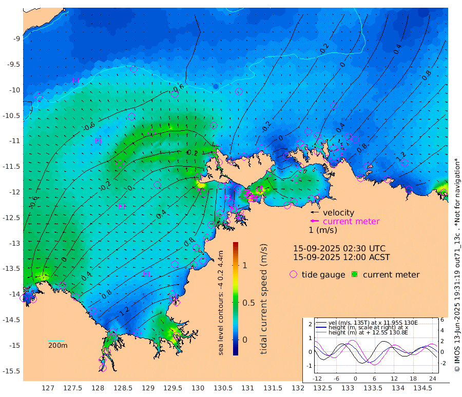 95cm/s 79T +4cm/s rms + 6cm/s 51T. Darwin_C1 52m 48cm/s 90T +4cm/s rms + 7cm/s -161T. Darwin_CW1 22m 32cm/s 71T +4cm/s rms + 8cm/s 61T. Darwin_CW2 34m 59cm/s 43T +3cm/s rms + 9cm/s 98T. Darwin_CW3 22m 56cm/s 91T +5cm/s rms + 7cm/s 88T. Darwin_C3 56m 52cm/s 64T +2cm/s rms + 9cm/s -126T. Darwin_CTbW 22m 7cm/s -26T +9cm/s rms + 2cm/s -110T. NWSLYN 196m 22cm/s -79T +1cm/s rms + 1cm/s -47T. DARBGF 30m 9cm/s -93T +7cm/s rms + 2cm/s -137T. ITFTIS 464m 15cm/s -40T +9cm/s rms + 1cm/s 74T. ITFMHB 146m 16cm/s -58T +4cm/s rms + 1cm/s -134T. ITFJBG 61m 27cm/s -64T +6cm/s rms + 4cm/s 121T. ITFFTB 108m 30cm/s -48T +4cm/s rms + 3cm/s 80T. NRSDAR 19m -43cm Carronade Island -49cm Guy Point -43cm Napier Broome Bay 9cm Lesueur Island 72cm Reveley Island 29cm Rocky Island 125cm Cape Domett 106cm Lacrosse Island 153cm Adolphus Island 141cm Pender Point 150cm Wyndham -38cm The Boxers -10cm Unnamed Shoal -79cm Loxton Shoal 140cm Pelican Island -60cm Calder Shoal -62cm Evans Shoal 196cm Quoin Island 103cm Port Keats 116cm Jones Point 222cm Catfish Island 47cm Cape Scott Offshore 5cm Cape Ford 57cm Anson Bay -48cm Goodrich Bank 52cm Peron Island North 37cm Point Jenny 35cm Native Point 49cm Fish Reef 53cm Tapa Bay -20cm Point Fawcett (Offshore) 65cm Burge Point 38cm Munkunuwa 18cm Beagle A 83cm Parsons Bank 61cm Fenton Patches -44cm Lynedoch Bank 85cm Hancox Shoal Area 72cm Nightcliff 91cm Darwin 64cm Charles Point Patches 100cm Glyde Point 121cm Chambers Bay 141cm Point Stuart 105cm Cape Hotham 109cm Christine Reef 154cm West Alligator Head 161cm East Field Island 109cm Two Hills Bay -8cm Newby Shoal 92cm Camp Point 50cm Medina Inlet South -23cm South Barlow Point -44cm St. Asaph Bay -46cm Cape Van Dieman -38cm Snake Bay -37cm Cache Point -88cm Echo Shoal -15cm Point Jahleel (Off) 37cm Cape Don 5cm Port Essington 5cm Smith Point - West 11cm NW Peacock Island -16cm North Of Jones Shoal -2cm Peacock Island 52cm Point David 17cm D'urville Point 12cm Money Shoal 58cm Copeland Island 74cm Cape Cockburn 44cm One Tree Point 76cm Hogmany Shoal 49cm New Year Island - West 57cm Grant Island 85cm Aurari Bay 115cm Cuthbert Point 82cm North Goulburn Island 118cm Paxie Shoal 148cm Entrance Island 182cm Yabooma Island
