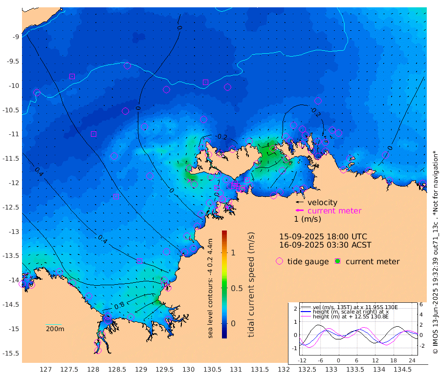 7cm/s 83T +4cm/s rms + 6cm/s 51T. Darwin_C1 52m 34cm/s 92T +4cm/s rms + 7cm/s -161T. Darwin_CW1 22m 9cm/s -117T +4cm/s rms + 8cm/s 61T. Darwin_CW2 34m 22cm/s 27T +3cm/s rms + 9cm/s 98T. Darwin_CW3 22m 5cm/s 110T +5cm/s rms + 7cm/s 88T. Darwin_C3 56m 5cm/s 86T +2cm/s rms + 9cm/s -126T. Darwin_CTbW 22m 3cm/s 62T +9cm/s rms + 2cm/s -110T. NWSLYN 196m 17cm/s -83T +1cm/s rms + 1cm/s -47T. DARBGF 30m 3cm/s -3T +7cm/s rms + 2cm/s -137T. ITFTIS 464m 2cm/s 16T +9cm/s rms + 1cm/s 74T. ITFMHB 146m 15cm/s -26T +4cm/s rms + 1cm/s -134T. ITFJBG 61m 12cm/s -33T +6cm/s rms + 4cm/s 121T. ITFFTB 108m 17cm/s -61T +4cm/s rms + 3cm/s 80T. NRSDAR 19m 121cm Carronade Island 127cm Guy Point 127cm Napier Broome Bay 103cm Lesueur Island 82cm Reveley Island 43cm Rocky Island 112cm Cape Domett 113cm Lacrosse Island 125cm Adolphus Island 168cm Pender Point 191cm Wyndham 34cm The Boxers 10cm Unnamed Shoal 22cm Loxton Shoal 90cm Pelican Island 24cm Calder Shoal 9cm Evans Shoal 142cm Quoin Island 71cm Port Keats 60cm Jones Point 175cm Catfish Island 39cm Cape Scott Offshore 34cm Cape Ford 30cm Anson Bay -1cm Goodrich Bank 20cm Peron Island North 35cm Point Jenny 32cm Native Point 26cm Fish Reef 30cm Tapa Bay 13cm Point Fawcett (Offshore) 39cm Burge Point 8cm Munkunuwa 34cm Beagle A 14cm Parsons Bank 40cm Fenton Patches 1cm Lynedoch Bank 30cm Hancox Shoal Area 39cm Nightcliff 27cm Darwin 25cm Charles Point Patches 53cm Glyde Point 91cm Chambers Bay 91cm Point Stuart 58cm Cape Hotham 90cm Christine Reef 103cm West Alligator Head 124cm East Field Island 63cm Two Hills Bay 48cm Newby Shoal 71cm Camp Point 19cm Medina Inlet South -7cm South Barlow Point 3cm St. Asaph Bay -4cm Cape Van Dieman -11cm Snake Bay 5cm Cache Point 34cm Echo Shoal 6cm Point Jahleel (Off) 18cm Cape Don -6cm Port Essington -7cm Smith Point - West -9cm NW Peacock Island -4cm North Of Jones Shoal -3cm Peacock Island -15cm Point David -13cm D'urville Point -4cm Money Shoal -14cm Copeland Island -13cm Cape Cockburn -11cm One Tree Point -7cm Hogmany Shoal -6cm New Year Island - West -9cm Grant Island -8cm Aurari Bay 0cm Cuthbert Point -6cm North Goulburn Island 15cm Paxie Shoal 11cm Entrance Island 18cm Yabooma Island