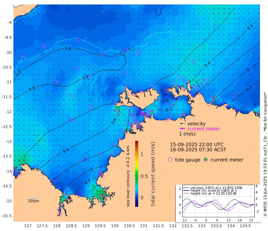 42cm/s -102T +4cm/s rms + 6cm/s 51T. Darwin_C1 52m 16cm/s -87T +4cm/s rms + 7cm/s -161T. Darwin_CW1 22m 5cm/s -127T +4cm/s rms + 8cm/s 61T. Darwin_CW2 34m 25cm/s -132T +3cm/s rms + 9cm/s 98T. Darwin_CW3 22m 2cm/s -86T +5cm/s rms + 7cm/s 88T. Darwin_C3 56m 26cm/s -116T +2cm/s rms + 9cm/s -126T. Darwin_CTbW 22m 8cm/s 119T +9cm/s rms + 2cm/s -110T. NWSLYN 196m 14cm/s 93T +1cm/s rms + 1cm/s -47T. DARBGF 30m 11cm/s 31T +7cm/s rms + 2cm/s -137T. ITFTIS 464m 11cm/s 44T +9cm/s rms + 1cm/s 74T. ITFMHB 146m 6cm/s 68T +4cm/s rms + 1cm/s -134T. ITFJBG 61m 12cm/s 71T +6cm/s rms + 4cm/s 121T. ITFFTB 108m 13cm/s 133T +4cm/s rms + 3cm/s 80T. NRSDAR 19m 48cm Carronade Island 52cm Guy Point 54cm Napier Broome Bay 48cm Lesueur Island 0cm Reveley Island -9cm Rocky Island -11cm Cape Domett -9cm Lacrosse Island -20cm Adolphus Island -26cm Pender Point -32cm Wyndham 73cm The Boxers 64cm Unnamed Shoal 90cm Loxton Shoal -21cm Pelican Island 81cm Calder Shoal 75cm Evans Shoal -42cm Quoin Island 5cm Port Keats -7cm Jones Point -98cm Catfish Island 25cm Cape Scott Offshore 74cm Cape Ford 26cm Anson Bay 75cm Goodrich Bank 29cm Peron Island North 28cm Point Jenny 30cm Native Point 25cm Fish Reef 26cm Tapa Bay 60cm Point Fawcett (Offshore) 23cm Burge Point 23cm Munkunuwa 38cm Beagle A 14cm Parsons Bank 20cm Fenton Patches 74cm Lynedoch Bank 11cm Hancox Shoal Area 14cm Nightcliff 23cm Darwin 42cm Charles Point Patches -3cm Glyde Point -34cm Chambers Bay -50cm Point Stuart -16cm Cape Hotham -31cm Christine Reef -62cm West Alligator Head -68cm East Field Island -24cm Two Hills Bay 66cm Newby Shoal -6cm Camp Point 32cm Medina Inlet South 68cm South Barlow Point 72cm St. Asaph Bay 74cm Cape Van Dieman 77cm Snake Bay 70cm Cache Point 84cm Echo Shoal 56cm Point Jahleel (Off) 31cm Cape Don 55cm Port Essington 50cm Smith Point - West 51cm NW Peacock Island 64cm North Of Jones Shoal 21cm Peacock Island 34cm Point David 48cm D'urville Point 57cm Money Shoal 29cm Copeland Island 39cm Cape Cockburn 40cm One Tree Point 34cm Hogmany Shoal 39cm New Year Island - West 35cm Grant Island 13cm Aurari Bay 1cm Cuthbert Point 21cm North Goulburn Island 2cm Paxie Shoal -19cm Entrance Island -41cm Yabooma Island