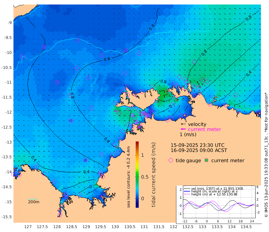 25cm/s 80T +4cm/s rms + 6cm/s 51T. Darwin_C1 52m 11cm/s 73T +4cm/s rms + 7cm/s -161T. Darwin_CW1 22m 19cm/s 79T +4cm/s rms + 8cm/s 61T. Darwin_CW2 34m 4cm/s 176T +3cm/s rms + 9cm/s 98T. Darwin_CW3 22m 29cm/s 88T +5cm/s rms + 7cm/s 88T. Darwin_C3 56m 18cm/s 60T +2cm/s rms + 9cm/s -126T. Darwin_CTbW 22m 8cm/s 122T +9cm/s rms + 2cm/s -110T. NWSLYN 196m 24cm/s 90T +1cm/s rms + 1cm/s -47T. DARBGF 30m 8cm/s 22T +7cm/s rms + 2cm/s -137T. ITFTIS 464m 8cm/s 40T +9cm/s rms + 1cm/s 74T. ITFMHB 146m 8cm/s 135T +4cm/s rms + 1cm/s -134T. ITFJBG 61m 10cm/s 93T +6cm/s rms + 4cm/s 121T. ITFFTB 108m 20cm/s 120T +4cm/s rms + 3cm/s 80T. NRSDAR 19m -1cm Carronade Island 0cm Guy Point 4cm Napier Broome Bay 26cm Lesueur Island 10cm Reveley Island -2cm Rocky Island 6cm Cape Domett 2cm Lacrosse Island -5cm Adolphus Island -40cm Pender Point -55cm Wyndham 67cm The Boxers 73cm Unnamed Shoal 70cm Loxton Shoal 11cm Pelican Island 71cm Calder Shoal 68cm Evans Shoal -19cm Quoin Island 37cm Port Keats 29cm Jones Point -66cm Catfish Island 55cm Cape Scott Offshore 92cm Cape Ford 63cm Anson Bay 74cm Goodrich Bank 69cm Peron Island North 57cm Point Jenny 59cm Native Point 61cm Fish Reef 61cm Tapa Bay 77cm Point Fawcett (Offshore) 58cm Burge Point 61cm Munkunuwa 58cm Beagle A 63cm Parsons Bank 50cm Fenton Patches 71cm Lynedoch Bank 53cm Hancox Shoal Area 51cm Nightcliff 70cm Darwin 82cm Charles Point Patches 27cm Glyde Point -19cm Chambers Bay -30cm Point Stuart 11cm Cape Hotham -18cm Christine Reef -43cm West Alligator Head -60cm East Field Island 1cm Two Hills Bay 71cm Newby Shoal 6cm Camp Point 71cm Medina Inlet South 85cm South Barlow Point 77cm St. Asaph Bay 76cm Cape Van Dieman 84cm Snake Bay 73cm Cache Point 53cm Echo Shoal 64cm Point Jahleel (Off) 53cm Cape Don 74cm Port Essington 70cm Smith Point - West 72cm NW Peacock Island 76cm North Of Jones Shoal 27cm Peacock Island 67cm Point David 73cm D'urville Point 73cm Money Shoal 63cm Copeland Island 84cm Cape Cockburn 71cm One Tree Point 75cm Hogmany Shoal 68cm New Year Island - West 68cm Grant Island 52cm Aurari Bay 48cm Cuthbert Point 61cm North Goulburn Island 42cm Paxie Shoal 28cm Entrance Island 11cm Yabooma Island