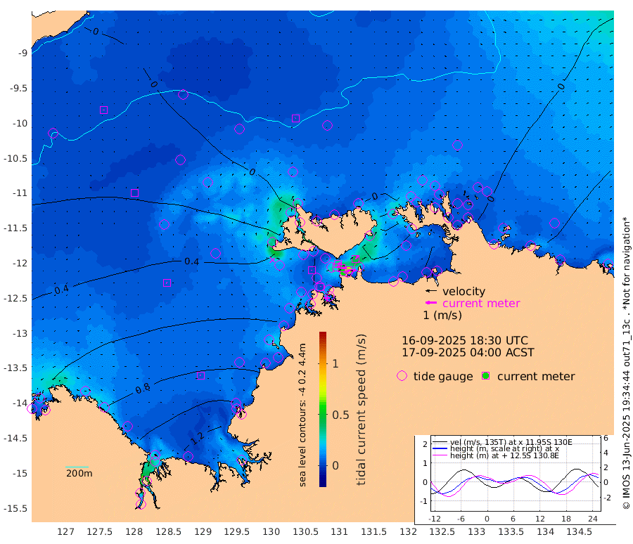 56cm/s 78T +4cm/s rms + 6cm/s 51T. Darwin_C1 52m 67cm/s 92T +4cm/s rms + 7cm/s -161T. Darwin_CW1 22m 26cm/s 74T +4cm/s rms + 8cm/s 61T. Darwin_CW2 34m 42cm/s 40T +3cm/s rms + 9cm/s 98T. Darwin_CW3 22m 48cm/s 91T +5cm/s rms + 7cm/s 88T. Darwin_C3 56m 32cm/s 68T +2cm/s rms + 9cm/s -126T. Darwin_CTbW 22m 3cm/s 49T +9cm/s rms + 2cm/s -110T. NWSLYN 196m 3cm/s -1T +1cm/s rms + 1cm/s -47T. DARBGF 30m 3cm/s -3T +7cm/s rms + 2cm/s -137T. ITFTIS 464m 1cm/s 177T +9cm/s rms + 1cm/s 74T. ITFMHB 146m 5cm/s -56T +4cm/s rms + 1cm/s -134T. ITFJBG 61m 5cm/s -39T +6cm/s rms + 4cm/s 121T. ITFFTB 108m 2cm/s -33T +4cm/s rms + 3cm/s 80T. NRSDAR 19m 85cm Carronade Island 88cm Guy Point 91cm Napier Broome Bay 98cm Lesueur Island 108cm Reveley Island 61cm Rocky Island 149cm Cape Domett 145cm Lacrosse Island 148cm Adolphus Island 166cm Pender Point 173cm Wyndham 42cm The Boxers 28cm Unnamed Shoal 12cm Loxton Shoal 135cm Pelican Island 31cm Calder Shoal 6cm Evans Shoal 165cm Quoin Island 128cm Port Keats 118cm Jones Point 170cm Catfish Island 87cm Cape Scott Offshore 107cm Cape Ford 87cm Anson Bay 3cm Goodrich Bank 73cm Peron Island North 88cm Point Jenny 86cm Native Point 84cm Fish Reef 90cm Tapa Bay 45cm Point Fawcett (Offshore) 103cm Burge Point 72cm Munkunuwa 81cm Beagle A 76cm Parsons Bank 100cm Fenton Patches 0cm Lynedoch Bank 85cm Hancox Shoal Area 99cm Nightcliff 92cm Darwin 85cm Charles Point Patches 90cm Glyde Point 102cm Chambers Bay 100cm Point Stuart 83cm Cape Hotham 99cm Christine Reef 111cm West Alligator Head 120cm East Field Island 76cm Two Hills Bay 74cm Newby Shoal 84cm Camp Point 80cm Medina Inlet South 23cm South Barlow Point 23cm St. Asaph Bay 3cm Cape Van Dieman -2cm Snake Bay 10cm Cache Point 14cm Echo Shoal 13cm Point Jahleel (Off) 33cm Cape Don 3cm Port Essington 2cm Smith Point - West -2cm NW Peacock Island -1cm North Of Jones Shoal -1cm Peacock Island -6cm Point David -4cm D'urville Point -2cm Money Shoal -6cm Copeland Island -3cm Cape Cockburn -3cm One Tree Point 0cm Hogmany Shoal 1cm New Year Island - West -1cm Grant Island 0cm Aurari Bay 8cm Cuthbert Point 4cm North Goulburn Island 22cm Paxie Shoal 19cm Entrance Island 23cm Yabooma Island