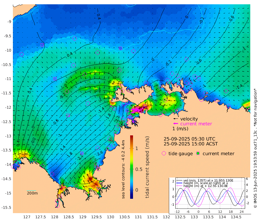 198cm/s -101T +4cm/s rms + 6cm/s 51T. Darwin_C1 52m 172cm/s -91T +4cm/s rms + 7cm/s -161T. Darwin_CW1 22m 100cm/s -105T +4cm/s rms + 8cm/s 61T. Darwin_CW2 34m 104cm/s -136T +3cm/s rms + 9cm/s 98T. Darwin_CW3 22m 184cm/s -91T +5cm/s rms + 7cm/s 88T. Darwin_C3 56m 107cm/s -115T +2cm/s rms + 9cm/s -126T. Darwin_CTbW 22m 10cm/s -177T +9cm/s rms + 2cm/s -110T. NWSLYN 196m 11cm/s -145T +1cm/s rms + 1cm/s -47T. DARBGF 30m 10cm/s 101T +7cm/s rms + 2cm/s -137T. ITFTIS 464m 13cm/s 125T +9cm/s rms + 1cm/s 74T. ITFMHB 146m 17cm/s 90T +4cm/s rms + 1cm/s -134T. ITFJBG 61m 28cm/s 114T +6cm/s rms + 4cm/s 121T. ITFFTB 108m 14cm/s 177T +4cm/s rms + 3cm/s 80T. NRSDAR 19m 43cm Carronade Island 43cm Guy Point 41cm Napier Broome Bay -88cm Lesueur Island -199cm Reveley Island -94cm Rocky Island -310cm Cape Domett -281cm Lacrosse Island -337cm Adolphus Island -277cm Pender Point -270cm Wyndham -20cm The Boxers -38cm Unnamed Shoal 45cm Loxton Shoal -328cm Pelican Island 0cm Calder Shoal 29cm Evans Shoal -425cm Quoin Island -301cm Port Keats -289cm Jones Point -371cm Catfish Island -209cm Cape Scott Offshore -164cm Cape Ford -231cm Anson Bay 15cm Goodrich Bank -207cm Peron Island North -178cm Point Jenny -175cm Native Point -205cm Fish Reef -213cm Tapa Bay -83cm Point Fawcett (Offshore) -236cm Burge Point -196cm Munkunuwa -147cm Beagle A -240cm Parsons Bank -221cm Fenton Patches 17cm Lynedoch Bank -241cm Hancox Shoal Area -251cm Nightcliff -278cm Darwin -242cm Charles Point Patches -221cm Glyde Point -203cm Chambers Bay -208cm Point Stuart -204cm Cape Hotham -181cm Christine Reef -226cm West Alligator Head -221cm East Field Island -181cm Two Hills Bay -97cm Newby Shoal -170cm Camp Point -219cm Medina Inlet South -65cm South Barlow Point -29cm St. Asaph Bay 13cm Cape Van Dieman -2cm Snake Bay 2cm Cache Point 68cm Echo Shoal -26cm Point Jahleel (Off) -92cm Cape Don -39cm Port Essington -36cm Smith Point - West -35cm NW Peacock Island -21cm North Of Jones Shoal -10cm Peacock Island -66cm Point David -41cm D'urville Point -32cm Money Shoal -69cm Copeland Island -98cm Cape Cockburn -68cm One Tree Point -85cm Hogmany Shoal -68cm New Year Island - West -73cm Grant Island -101cm Aurari Bay -121cm Cuthbert Point -100cm North Goulburn Island -137cm Paxie Shoal -151cm Entrance Island -184cm Yabooma Island
