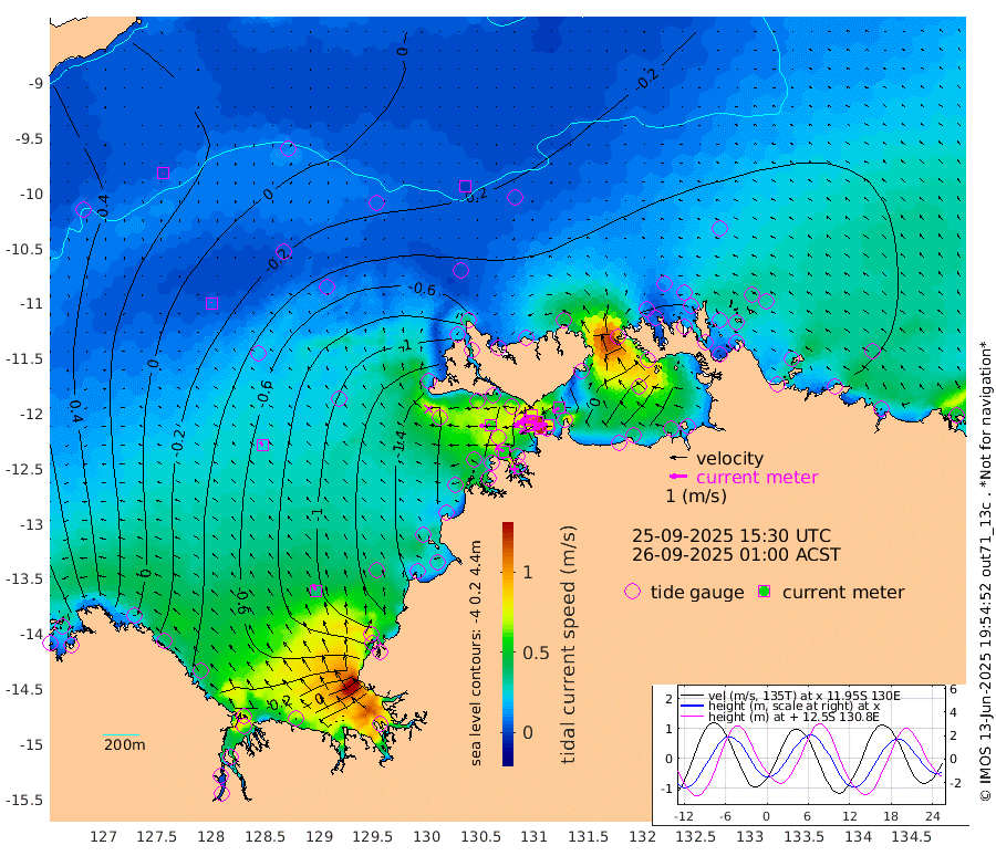 121cm/s -103T +4cm/s rms + 6cm/s 51T. Darwin_C1 52m 84cm/s -89T +4cm/s rms + 7cm/s -161T. Darwin_CW1 22m 102cm/s -109T +4cm/s rms + 8cm/s 61T. Darwin_CW2 34m 44cm/s -120T +3cm/s rms + 9cm/s 98T. Darwin_CW3 22m 118cm/s -92T +5cm/s rms + 7cm/s 88T. Darwin_C3 56m 72cm/s -116T +2cm/s rms + 9cm/s -126T. Darwin_CTbW 22m 0cm/s -30T +9cm/s rms + 2cm/s -110T. NWSLYN 196m 61cm/s -92T +1cm/s rms + 1cm/s -47T. DARBGF 30m 2cm/s -139T +7cm/s rms + 2cm/s -137T. ITFTIS 464m 7cm/s 1T +9cm/s rms + 1cm/s 74T. ITFMHB 146m 38cm/s -20T +4cm/s rms + 1cm/s -134T. ITFJBG 61m 26cm/s -37T +6cm/s rms + 4cm/s 121T. ITFFTB 108m 53cm/s -64T +4cm/s rms + 3cm/s 80T. NRSDAR 19m 151cm Carronade Island 155cm Guy Point 154cm Napier Broome Bay 65cm Lesueur Island -19cm Reveley Island -10cm Rocky Island -33cm Cape Domett -20cm Lacrosse Island 1cm Adolphus Island 107cm Pender Point 160cm Wyndham -15cm The Boxers -43cm Unnamed Shoal 26cm Loxton Shoal -73cm Pelican Island -16cm Calder Shoal 5cm Evans Shoal 20cm Quoin Island -121cm Port Keats -116cm Jones Point 125cm Catfish Island -120cm Cape Scott Offshore -161cm Cape Ford -152cm Anson Bay -24cm Goodrich Bank -129cm Peron Island North -141cm Point Jenny -143cm Native Point -145cm Fish Reef -158cm Tapa Bay -88cm Point Fawcett (Offshore) -158cm Burge Point -169cm Munkunuwa -124cm Beagle A -164cm Parsons Bank -152cm Fenton Patches -8cm Lynedoch Bank -147cm Hancox Shoal Area -161cm Nightcliff -167cm Darwin -162cm Charles Point Patches -70cm Glyde Point 18cm Chambers Bay 46cm Point Stuart -28cm Cape Hotham 19cm Christine Reef 60cm West Alligator Head 101cm East Field Island 10cm Two Hills Bay -64cm Newby Shoal -1cm Camp Point -159cm Medina Inlet South -95cm South Barlow Point -65cm St. Asaph Bay -32cm Cape Van Dieman -39cm Snake Bay -21cm Cache Point 56cm Echo Shoal -25cm Point Jahleel (Off) -35cm Cape Don -36cm Port Essington -38cm Smith Point - West -32cm NW Peacock Island -22cm North Of Jones Shoal -9cm Peacock Island -36cm Point David -40cm D'urville Point -24cm Money Shoal -35cm Copeland Island -39cm Cape Cockburn -32cm One Tree Point -25cm Hogmany Shoal -29cm New Year Island - West -32cm Grant Island -34cm Aurari Bay -27cm Cuthbert Point -33cm North Goulburn Island -20cm Paxie Shoal -23cm Entrance Island -9cm Yabooma Island