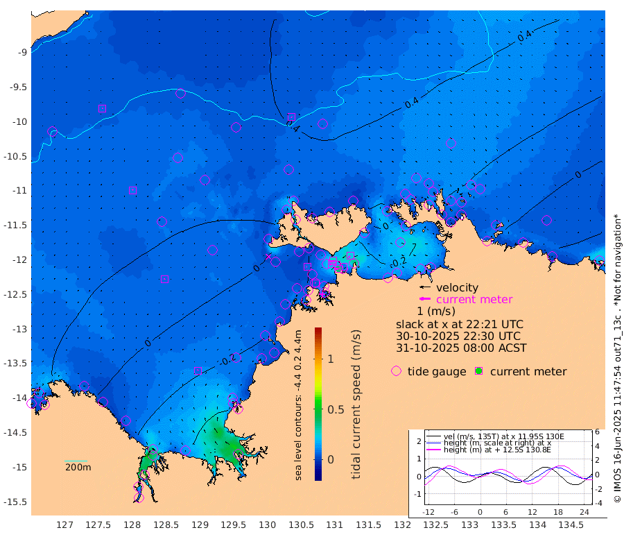 37cm/s -102T +4cm/s rms + 6cm/s 51T. Darwin_C1 52m 8cm/s -85T +4cm/s rms + 7cm/s -161T. Darwin_CW1 22m 19cm/s -111T +4cm/s rms + 8cm/s 61T. Darwin_CW2 34m 23cm/s -135T +3cm/s rms + 9cm/s 98T. Darwin_CW3 22m 16cm/s -91T +5cm/s rms + 7cm/s 88T. Darwin_C3 56m 26cm/s -115T +2cm/s rms + 9cm/s -126T. Darwin_CTbW 22m 7cm/s 136T +9cm/s rms + 2cm/s -110T. NWSLYN 196m 6cm/s -100T +1cm/s rms + 1cm/s -47T. DARBGF 30m 6cm/s 21T +7cm/s rms + 2cm/s -137T. ITFTIS 464m 9cm/s 19T +9cm/s rms + 1cm/s 74T. ITFMHB 146m 8cm/s 6T +4cm/s rms + 1cm/s -134T. ITFJBG 61m 7cm/s 10T +6cm/s rms + 4cm/s 121T. ITFFTB 108m 5cm/s -79T +4cm/s rms + 3cm/s 80T. NRSDAR 19m 11cm Carronade Island 14cm Guy Point 18cm Napier Broome Bay -5cm Lesueur Island -33cm Reveley Island -16cm Rocky Island -48cm Cape Domett -53cm Lacrosse Island -55cm Adolphus Island -33cm Pender Point -39cm Wyndham 23cm The Boxers 19cm Unnamed Shoal 43cm Loxton Shoal -53cm Pelican Island 24cm Calder Shoal 37cm Evans Shoal -69cm Quoin Island -47cm Port Keats -40cm Jones Point -101cm Catfish Island -33cm Cape Scott Offshore 35cm Cape Ford -37cm Anson Bay 35cm Goodrich Bank -23cm Peron Island North -28cm Point Jenny -26cm Native Point -29cm Fish Reef -30cm Tapa Bay 5cm Point Fawcett (Offshore) -34cm Burge Point -25cm Munkunuwa -26cm Beagle A -29cm Parsons Bank -42cm Fenton Patches 36cm Lynedoch Bank -36cm Hancox Shoal Area -54cm Nightcliff -31cm Darwin -17cm Charles Point Patches -32cm Glyde Point -50cm Chambers Bay -44cm Point Stuart -35cm Cape Hotham -44cm Christine Reef -52cm West Alligator Head -55cm East Field Island -31cm Two Hills Bay -3cm Newby Shoal -25cm Camp Point -24cm Medina Inlet South 14cm South Barlow Point 18cm St. Asaph Bay 35cm Cape Van Dieman 34cm Snake Bay 30cm Cache Point 34cm Echo Shoal 20cm Point Jahleel (Off) 5cm Cape Don 28cm Port Essington 21cm Smith Point - West 25cm NW Peacock Island 26cm North Of Jones Shoal 9cm Peacock Island 21cm Point David 23cm D'urville Point 30cm Money Shoal 18cm Copeland Island 20cm Cape Cockburn 21cm One Tree Point 30cm Hogmany Shoal 18cm New Year Island - West 21cm Grant Island 2cm Aurari Bay 6cm Cuthbert Point 10cm North Goulburn Island 4cm Paxie Shoal -12cm Entrance Island -25cm Yabooma Island