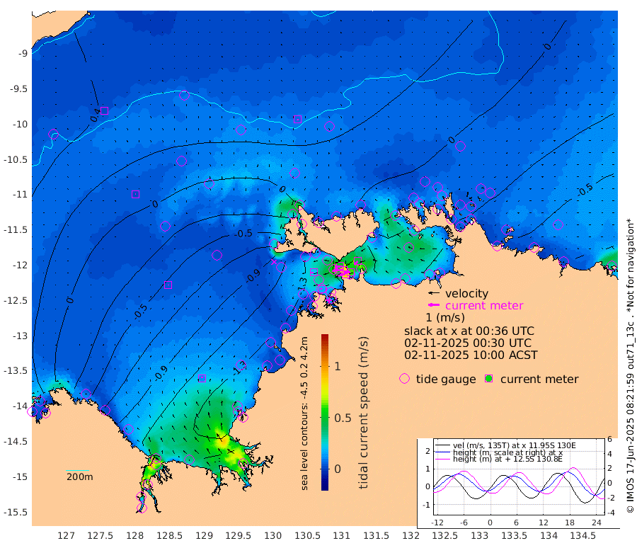 83cm/s -102T +4cm/s rms + 6cm/s 51T. Darwin_C1 52m 60cm/s -89T +4cm/s rms + 7cm/s -161T. Darwin_CW1 22m 59cm/s -108T +4cm/s rms + 8cm/s 61T. Darwin_CW2 34m 44cm/s -137T +3cm/s rms + 9cm/s 98T. Darwin_CW3 22m 82cm/s -91T +5cm/s rms + 7cm/s 88T. Darwin_C3 56m 50cm/s -115T +2cm/s rms + 9cm/s -126T. Darwin_CTbW 22m 8cm/s 160T +9cm/s rms + 2cm/s -110T. NWSLYN 196m 21cm/s -100T +1cm/s rms + 1cm/s -47T. DARBGF 30m 3cm/s 91T +7cm/s rms + 2cm/s -137T. ITFTIS 464m 3cm/s 60T +9cm/s rms + 1cm/s 74T. ITFMHB 146m 12cm/s 6T +4cm/s rms + 1cm/s -134T. ITFJBG 61m 4cm/s 33T +6cm/s rms + 4cm/s 121T. ITFFTB 108m 16cm/s -73T +4cm/s rms + 3cm/s 80T. NRSDAR 19m 24cm Carronade Island 27cm Guy Point 30cm Napier Broome Bay -52cm Lesueur Island -110cm Reveley Island -49cm Rocky Island -155cm Cape Domett -153cm Lacrosse Island -155cm Adolphus Island -101cm Pender Point -95cm Wyndham -13cm The Boxers -31cm Unnamed Shoal 38cm Loxton Shoal -168cm Pelican Island -6cm Calder Shoal 28cm Evans Shoal -176cm Quoin Island -170cm Port Keats -163cm Jones Point -144cm Catfish Island -126cm Cape Scott Offshore -113cm Cape Ford -142cm Anson Bay 12cm Goodrich Bank -120cm Peron Island North -126cm Point Jenny -126cm Native Point -133cm Fish Reef -142cm Tapa Bay -55cm Point Fawcett (Offshore) -156cm Burge Point -128cm Munkunuwa -119cm Beagle A -142cm Parsons Bank -160cm Fenton Patches 20cm Lynedoch Bank -146cm Hancox Shoal Area -169cm Nightcliff -159cm Darwin -139cm Charles Point Patches -122cm Glyde Point -105cm Chambers Bay -96cm Point Stuart -106cm Cape Hotham -96cm Christine Reef -104cm West Alligator Head -100cm East Field Island -83cm Two Hills Bay -75cm Newby Shoal -87cm Camp Point -134cm Medina Inlet South -42cm South Barlow Point -23cm St. Asaph Bay 10cm Cape Van Dieman 5cm Snake Bay 6cm Cache Point 42cm Echo Shoal -9cm Point Jahleel (Off) -37cm Cape Don -3cm Port Essington -8cm Smith Point - West -3cm NW Peacock Island 6cm North Of Jones Shoal 1cm Peacock Island -14cm Point David -7cm D'urville Point 3cm Money Shoal -16cm Copeland Island -22cm Cape Cockburn -11cm One Tree Point -13cm Hogmany Shoal -18cm New Year Island - West -16cm Grant Island -35cm Aurari Bay -34cm Cuthbert Point -27cm North Goulburn Island -40cm Paxie Shoal -58cm Entrance Island -70cm Yabooma Island