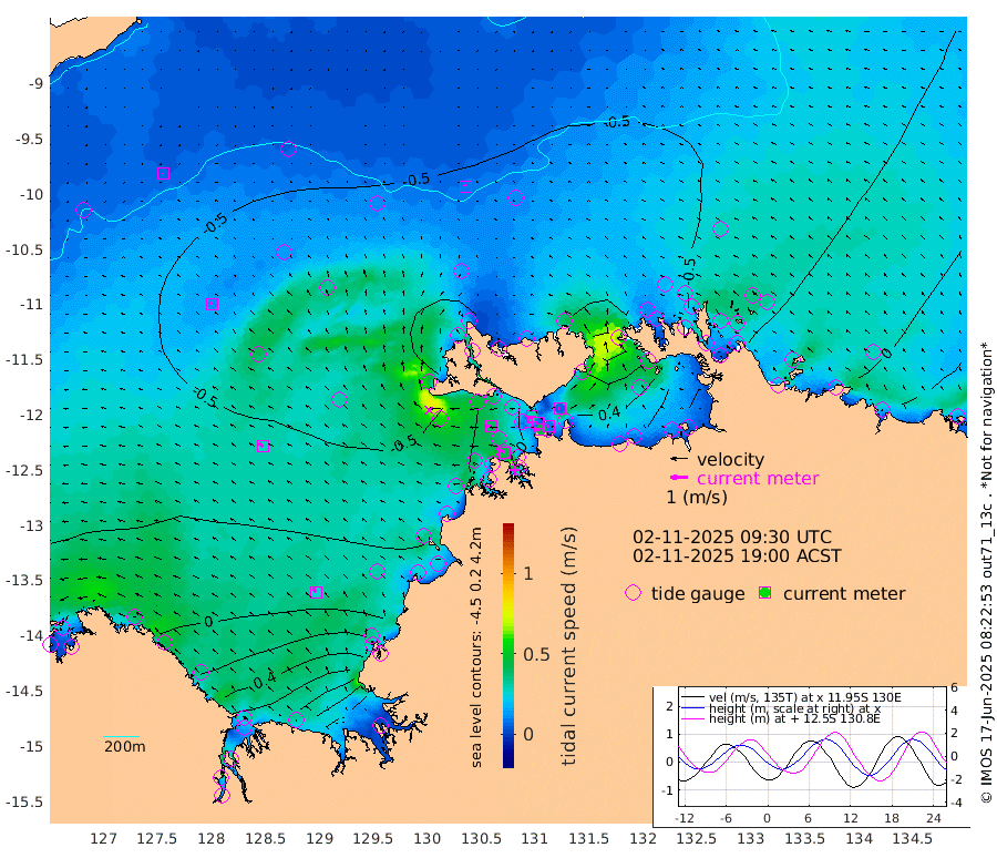 44cm/s -104T +4cm/s rms + 6cm/s 51T. Darwin_C1 52m 10cm/s -81T +4cm/s rms + 7cm/s -161T. Darwin_CW1 22m 14cm/s -104T +4cm/s rms + 8cm/s 61T. Darwin_CW2 34m 7cm/s -77T +3cm/s rms + 9cm/s 98T. Darwin_CW3 22m 7cm/s -103T +5cm/s rms + 7cm/s 88T. Darwin_C3 56m 31cm/s -116T +2cm/s rms + 9cm/s -126T. Darwin_CTbW 22m 9cm/s -26T +9cm/s rms + 2cm/s -110T. NWSLYN 196m 39cm/s -85T +1cm/s rms + 1cm/s -47T. DARBGF 30m 6cm/s -112T +7cm/s rms + 2cm/s -137T. ITFTIS 464m 11cm/s -35T +9cm/s rms + 1cm/s 74T. ITFMHB 146m 27cm/s -36T +4cm/s rms + 1cm/s -134T. ITFJBG 61m 29cm/s -52T +6cm/s rms + 4cm/s 121T. ITFFTB 108m 45cm/s -57T +4cm/s rms + 3cm/s 80T. NRSDAR 19m 6cm Carronade Island 10cm Guy Point -4cm Napier Broome Bay 28cm Lesueur Island 47cm Reveley Island -3cm Rocky Island 82cm Cape Domett 79cm Lacrosse Island 128cm Adolphus Island 149cm Pender Point 173cm Wyndham -46cm The Boxers -55cm Unnamed Shoal -42cm Loxton Shoal 81cm Pelican Island -50cm Calder Shoal -46cm Evans Shoal 183cm Quoin Island 29cm Port Keats 34cm Jones Point 175cm Catfish Island -11cm Cape Scott Offshore -61cm Cape Ford -18cm Anson Bay -51cm Goodrich Bank -24cm Peron Island North -43cm Point Jenny -45cm Native Point -33cm Fish Reef -31cm Tapa Bay -58cm Point Fawcett (Offshore) -26cm Burge Point -42cm Munkunuwa -44cm Beagle A -24cm Parsons Bank -21cm Fenton Patches -42cm Lynedoch Bank -6cm Hancox Shoal Area -11cm Nightcliff -5cm Darwin -18cm Charles Point Patches 24cm Glyde Point 69cm Chambers Bay 80cm Point Stuart 39cm Cape Hotham 56cm Christine Reef 94cm West Alligator Head 120cm East Field Island 44cm Two Hills Bay -52cm Newby Shoal 47cm Camp Point -31cm Medina Inlet South -62cm South Barlow Point -58cm St. Asaph Bay -57cm Cape Van Dieman -56cm Snake Bay -51cm Cache Point -25cm Echo Shoal -38cm Point Jahleel (Off) -22cm Cape Don -40cm Port Essington -42cm Smith Point - West -40cm NW Peacock Island -40cm North Of Jones Shoal -14cm Peacock Island -27cm Point David -42cm D'urville Point -34cm Money Shoal -22cm Copeland Island -31cm Cape Cockburn -28cm One Tree Point -22cm Hogmany Shoal -24cm New Year Island - West -26cm Grant Island -7cm Aurari Bay -3cm Cuthbert Point -17cm North Goulburn Island 10cm Paxie Shoal 22cm Entrance Island 53cm Yabooma Island