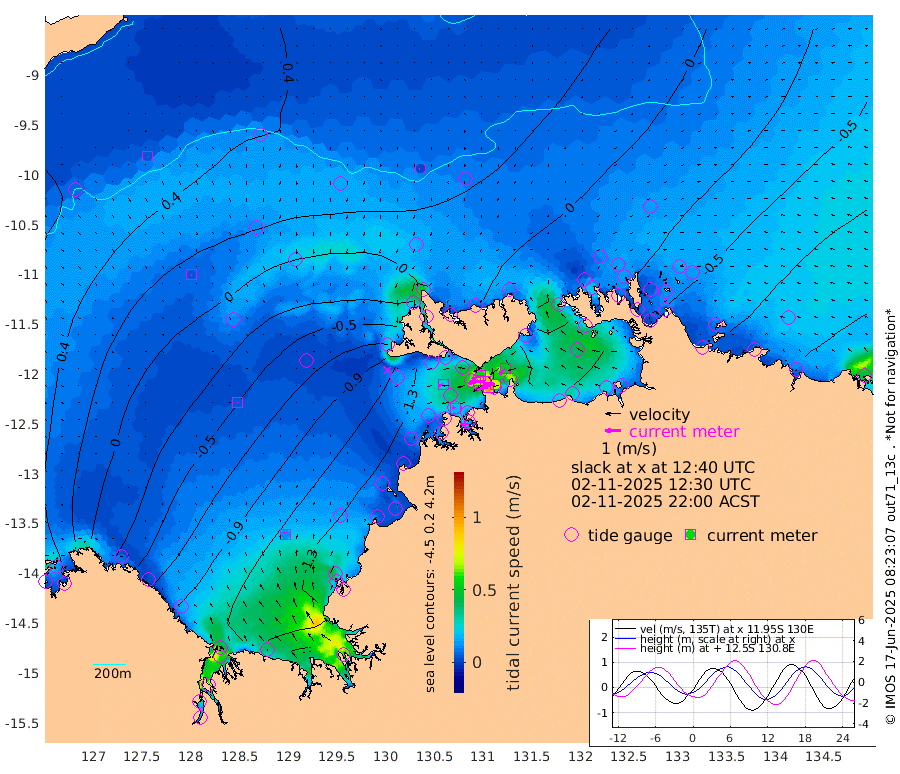 98cm/s -103T +4cm/s rms + 6cm/s 51T. Darwin_C1 52m 70cm/s -89T +4cm/s rms + 7cm/s -161T. Darwin_CW1 22m 66cm/s -107T +4cm/s rms + 8cm/s 61T. Darwin_CW2 34m 51cm/s -133T +3cm/s rms + 9cm/s 98T. Darwin_CW3 22m 92cm/s -91T +5cm/s rms + 7cm/s 88T. Darwin_C3 56m 57cm/s -115T +2cm/s rms + 9cm/s -126T. Darwin_CTbW 22m 2cm/s -95T +9cm/s rms + 2cm/s -110T. NWSLYN 196m 24cm/s -97T +1cm/s rms + 1cm/s -47T. DARBGF 30m 4cm/s 137T +7cm/s rms + 2cm/s -137T. ITFTIS 464m 4cm/s 116T +9cm/s rms + 1cm/s 74T. ITFMHB 146m 12cm/s -1T +4cm/s rms + 1cm/s -134T. ITFJBG 61m 4cm/s 29T +6cm/s rms + 4cm/s 121T. ITFFTB 108m 19cm/s -73T +4cm/s rms + 3cm/s 80T. NRSDAR 19m 59cm Carronade Island 57cm Guy Point 56cm Napier Broome Bay -5cm Lesueur Island -78cm Reveley Island -17cm Rocky Island -129cm Cape Domett -112cm Lacrosse Island -118cm Adolphus Island -76cm Pender Point -56cm Wyndham -1cm The Boxers -16cm Unnamed Shoal 52cm Loxton Shoal -154cm Pelican Island 13cm Calder Shoal 36cm Evans Shoal -135cm Quoin Island -156cm Port Keats -155cm Jones Point -98cm Catfish Island -118cm Cape Scott Offshore -126cm Cape Ford -142cm Anson Bay 16cm Goodrich Bank -110cm Peron Island North -128cm Point Jenny -126cm Native Point -124cm Fish Reef -143cm Tapa Bay -51cm Point Fawcett (Offshore) -150cm Burge Point -128cm Munkunuwa -100cm Beagle A -145cm Parsons Bank -142cm Fenton Patches 25cm Lynedoch Bank -147cm Hancox Shoal Area -156cm Nightcliff -157cm Darwin -144cm Charles Point Patches -111cm Glyde Point -90cm Chambers Bay -73cm Point Stuart -88cm Cape Hotham -81cm Christine Reef -76cm West Alligator Head -64cm East Field Island -65cm Two Hills Bay -49cm Newby Shoal -76cm Camp Point -131cm Medina Inlet South -38cm South Barlow Point -17cm St. Asaph Bay 11cm Cape Van Dieman 11cm Snake Bay 10cm Cache Point 69cm Echo Shoal -2cm Point Jahleel (Off) -41cm Cape Don -12cm Port Essington -11cm Smith Point - West -9cm NW Peacock Island 5cm North Of Jones Shoal 0cm Peacock Island -30cm Point David -15cm D'urville Point -11cm Money Shoal -32cm Copeland Island -37cm Cape Cockburn -25cm One Tree Point -36cm Hogmany Shoal -26cm New Year Island - West -30cm Grant Island -46cm Aurari Bay -61cm Cuthbert Point -47cm North Goulburn Island -75cm Paxie Shoal -85cm Entrance Island -103cm Yabooma Island
