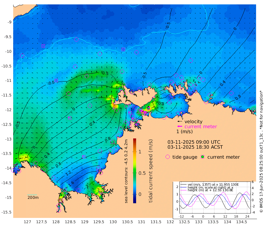 60cm/s 80T +4cm/s rms + 6cm/s 51T. Darwin_C1 52m 60cm/s 92T +4cm/s rms + 7cm/s -161T. Darwin_CW1 22m 46cm/s 70T +4cm/s rms + 8cm/s 61T. Darwin_CW2 34m 50cm/s 41T +3cm/s rms + 9cm/s 98T. Darwin_CW3 22m 81cm/s 90T +5cm/s rms + 7cm/s 88T. Darwin_C3 56m 25cm/s 66T +2cm/s rms + 9cm/s -126T. Darwin_CTbW 22m 9cm/s -15T +9cm/s rms + 2cm/s -110T. NWSLYN 196m 22cm/s -71T +1cm/s rms + 1cm/s -47T. DARBGF 30m 8cm/s -96T +7cm/s rms + 2cm/s -137T. ITFTIS 464m 12cm/s -51T +9cm/s rms + 1cm/s 74T. ITFMHB 146m 21cm/s -57T +4cm/s rms + 1cm/s -134T. ITFJBG 61m 29cm/s -59T +6cm/s rms + 4cm/s 121T. ITFFTB 108m 34cm/s -51T +4cm/s rms + 3cm/s 80T. NRSDAR 19m -15cm Carronade Island -8cm Guy Point -25cm Napier Broome Bay 61cm Lesueur Island 135cm Reveley Island 31cm Rocky Island 209cm Cape Domett 194cm Lacrosse Island 251cm Adolphus Island 230cm Pender Point 241cm Wyndham -24cm The Boxers -28cm Unnamed Shoal -62cm Loxton Shoal 224cm Pelican Island -38cm Calder Shoal -54cm Evans Shoal 316cm Quoin Island 175cm Port Keats 173cm Jones Point 272cm Catfish Island 102cm Cape Scott Offshore 69cm Cape Ford 110cm Anson Bay -46cm Goodrich Bank 85cm Peron Island North 77cm Point Jenny 74cm Native Point 85cm Fish Reef 101cm Tapa Bay 2cm Point Fawcett (Offshore) 113cm Burge Point 76cm Munkunuwa 58cm Beagle A 109cm Parsons Bank 113cm Fenton Patches -46cm Lynedoch Bank 129cm Hancox Shoal Area 132cm Nightcliff 138cm Darwin 115cm Charles Point Patches 129cm Glyde Point 153cm Chambers Bay 153cm Point Stuart 126cm Cape Hotham 138cm Christine Reef 170cm West Alligator Head 186cm East Field Island 113cm Two Hills Bay 16cm Newby Shoal 119cm Camp Point 91cm Medina Inlet South -12cm South Barlow Point -25cm St. Asaph Bay -49cm Cape Van Dieman -46cm Snake Bay -40cm Cache Point -58cm Echo Shoal -18cm Point Jahleel (Off) 26cm Cape Don -15cm Port Essington -15cm Smith Point - West -15cm NW Peacock Island -27cm North Of Jones Shoal -8cm Peacock Island 9cm Point David -13cm D'urville Point -12cm Money Shoal 15cm Copeland Island 16cm Cape Cockburn 5cm One Tree Point 25cm Hogmany Shoal 10cm New Year Island - West 12cm Grant Island 39cm Aurari Bay 56cm Cuthbert Point 31cm North Goulburn Island 72cm Paxie Shoal 95cm Entrance Island 134cm Yabooma Island
