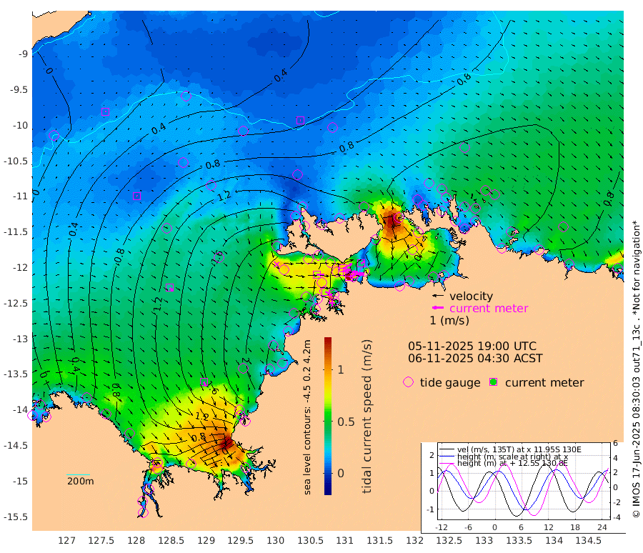 131cm/s 78T +4cm/s rms + 6cm/s 51T. Darwin_C1 52m 94cm/s 85T +4cm/s rms + 7cm/s -161T. Darwin_CW1 22m 77cm/s 75T +4cm/s rms + 8cm/s 61T. Darwin_CW2 34m 36cm/s 58T +3cm/s rms + 9cm/s 98T. Darwin_CW3 22m 91cm/s 87T +5cm/s rms + 7cm/s 88T. Darwin_C3 56m 89cm/s 63T +2cm/s rms + 9cm/s -126T. Darwin_CTbW 22m 3cm/s 95T +9cm/s rms + 2cm/s -110T. NWSLYN 196m 69cm/s 90T +1cm/s rms + 1cm/s -47T. DARBGF 30m 8cm/s 21T +7cm/s rms + 2cm/s -137T. ITFTIS 464m 5cm/s 109T +9cm/s rms + 1cm/s 74T. ITFMHB 146m 44cm/s 155T +4cm/s rms + 1cm/s -134T. ITFJBG 61m 32cm/s 130T +6cm/s rms + 4cm/s 121T. ITFFTB 108m 68cm/s 120T +4cm/s rms + 3cm/s 80T. NRSDAR 19m -84cm Carronade Island -98cm Guy Point -84cm Napier Broome Bay 7cm Lesueur Island 48cm Reveley Island 28cm Rocky Island 52cm Cape Domett 51cm Lacrosse Island -7cm Adolphus Island -112cm Pender Point -157cm Wyndham 74cm The Boxers 126cm Unnamed Shoal 15cm Loxton Shoal 80cm Pelican Island 71cm Calder Shoal 35cm Evans Shoal -48cm Quoin Island 147cm Port Keats 151cm Jones Point -113cm Catfish Island 152cm Cape Scott Offshore 260cm Cape Ford 183cm Anson Bay 70cm Goodrich Bank 178cm Peron Island North 189cm Point Jenny 193cm Native Point 200cm Fish Reef 201cm Tapa Bay 144cm Point Fawcett (Offshore) 210cm Burge Point 203cm Munkunuwa 186cm Beagle A 203cm Parsons Bank 205cm Fenton Patches 48cm Lynedoch Bank 177cm Hancox Shoal Area 193cm Nightcliff 206cm Darwin 202cm Charles Point Patches 111cm Glyde Point 5cm Chambers Bay -7cm Point Stuart 71cm Cape Hotham 7cm Christine Reef -23cm West Alligator Head -64cm East Field Island 31cm Two Hills Bay 142cm Newby Shoal 35cm Camp Point 201cm Medina Inlet South 142cm South Barlow Point 111cm St. Asaph Bay 80cm Cape Van Dieman 89cm Snake Bay 74cm Cache Point -20cm Echo Shoal 73cm Point Jahleel (Off) 80cm Cape Don 82cm Port Essington 83cm Smith Point - West 79cm NW Peacock Island 64cm North Of Jones Shoal 24cm Peacock Island 84cm Point David 87cm D'urville Point 68cm Money Shoal 81cm Copeland Island 104cm Cape Cockburn 79cm One Tree Point 87cm Hogmany Shoal 82cm New Year Island - West 84cm Grant Island 81cm Aurari Bay 73cm Cuthbert Point 82cm North Goulburn Island 58cm Paxie Shoal 60cm Entrance Island 35cm Yabooma Island