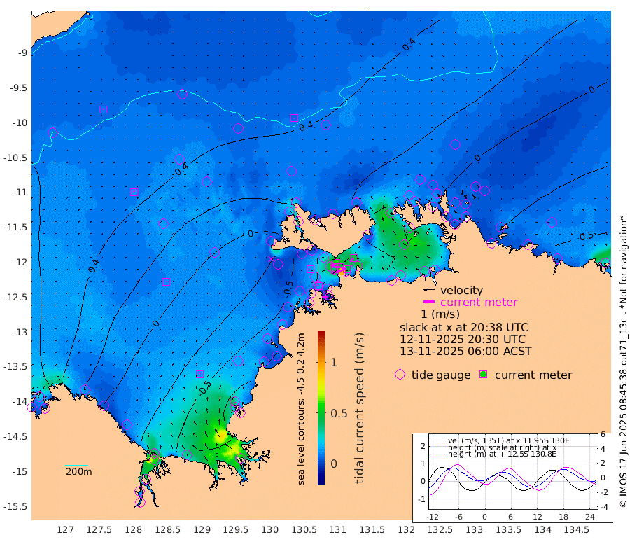 94cm/s -101T +4cm/s rms + 6cm/s 51T. Darwin_C1 52m 46cm/s -91T +4cm/s rms + 7cm/s -161T. Darwin_CW1 22m 35cm/s -107T +4cm/s rms + 8cm/s 61T. Darwin_CW2 34m 44cm/s -134T +3cm/s rms + 9cm/s 98T. Darwin_CW3 22m 46cm/s -91T +5cm/s rms + 7cm/s 88T. Darwin_C3 56m 56cm/s -116T +2cm/s rms + 9cm/s -126T. Darwin_CTbW 22m 7cm/s 130T +9cm/s rms + 2cm/s -110T. NWSLYN 196m 13cm/s -96T +1cm/s rms + 1cm/s -47T. DARBGF 30m 9cm/s 30T +7cm/s rms + 2cm/s -137T. ITFTIS 464m 13cm/s 26T +9cm/s rms + 1cm/s 74T. ITFMHB 146m 15cm/s 5T +4cm/s rms + 1cm/s -134T. ITFJBG 61m 12cm/s 21T +6cm/s rms + 4cm/s 121T. ITFFTB 108m 13cm/s -76T +4cm/s rms + 3cm/s 80T. NRSDAR 19m 56cm Carronade Island 62cm Guy Point 66cm Napier Broome Bay 18cm Lesueur Island -40cm Reveley Island -34cm Rocky Island -63cm Cape Domett -58cm Lacrosse Island -72cm Adolphus Island -24cm Pender Point -18cm Wyndham 28cm The Boxers 22cm Unnamed Shoal 58cm Loxton Shoal -84cm Pelican Island 33cm Calder Shoal 38cm Evans Shoal -84cm Quoin Island -74cm Port Keats -79cm Jones Point -128cm Catfish Island -51cm Cape Scott Offshore -30cm Cape Ford -58cm Anson Bay 32cm Goodrich Bank -58cm Peron Island North -52cm Point Jenny -49cm Native Point -65cm Fish Reef -58cm Tapa Bay -12cm Point Fawcett (Offshore) -64cm Burge Point -58cm Munkunuwa -44cm Beagle A -72cm Parsons Bank -68cm Fenton Patches 37cm Lynedoch Bank -69cm Hancox Shoal Area -72cm Nightcliff -70cm Darwin -54cm Charles Point Patches -59cm Glyde Point -61cm Chambers Bay -64cm Point Stuart -58cm Cape Hotham -52cm Christine Reef -72cm West Alligator Head -65cm East Field Island -54cm Two Hills Bay -5cm Newby Shoal -33cm Camp Point -56cm Medina Inlet South -1cm South Barlow Point 12cm St. Asaph Bay 29cm Cape Van Dieman 29cm Snake Bay 23cm Cache Point 59cm Echo Shoal 10cm Point Jahleel (Off) -16cm Cape Don 6cm Port Essington -1cm Smith Point - West 3cm NW Peacock Island 16cm North Of Jones Shoal 4cm Peacock Island -6cm Point David -3cm D'urville Point 14cm Money Shoal -10cm Copeland Island -18cm Cape Cockburn -4cm One Tree Point -11cm Hogmany Shoal -3cm New Year Island - West -7cm Grant Island -27cm Aurari Bay -36cm Cuthbert Point -22cm North Goulburn Island -23cm Paxie Shoal -48cm Entrance Island -61cm Yabooma Island