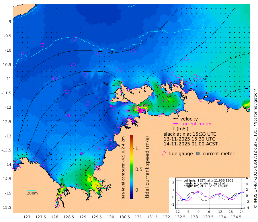 123cm/s 78T +4cm/s rms + 6cm/s 51T. Darwin_C1 52m 75cm/s 92T +4cm/s rms + 7cm/s -161T. Darwin_CW1 22m 65cm/s 72T +4cm/s rms + 8cm/s 61T. Darwin_CW2 34m 61cm/s 50T +3cm/s rms + 9cm/s 98T. Darwin_CW3 22m 90cm/s 89T +5cm/s rms + 7cm/s 88T. Darwin_C3 56m 72cm/s 65T +2cm/s rms + 9cm/s -126T. Darwin_CTbW 22m 2cm/s -21T +9cm/s rms + 2cm/s -110T. NWSLYN 196m 19cm/s 78T +1cm/s rms + 1cm/s -47T. DARBGF 30m 2cm/s -77T +7cm/s rms + 2cm/s -137T. ITFTIS 464m 6cm/s -154T +9cm/s rms + 1cm/s 74T. ITFMHB 146m 10cm/s -175T +4cm/s rms + 1cm/s -134T. ITFJBG 61m 5cm/s -171T +6cm/s rms + 4cm/s 121T. ITFFTB 108m 11cm/s 94T +4cm/s rms + 3cm/s 80T. NRSDAR 19m 19cm Carronade Island 13cm Guy Point 26cm Napier Broome Bay 67cm Lesueur Island 111cm Reveley Island 105cm Rocky Island 154cm Cape Domett 144cm Lacrosse Island 145cm Adolphus Island 123cm Pender Point 115cm Wyndham 45cm The Boxers 52cm Unnamed Shoal -1cm Loxton Shoal 156cm Pelican Island 30cm Calder Shoal 4cm Evans Shoal 167cm Quoin Island 157cm Port Keats 153cm Jones Point 200cm Catfish Island 120cm Cape Scott Offshore 118cm Cape Ford 128cm Anson Bay 10cm Goodrich Bank 119cm Peron Island North 120cm Point Jenny 120cm Native Point 131cm Fish Reef 129cm Tapa Bay 71cm Point Fawcett (Offshore) 139cm Burge Point 121cm Munkunuwa 110cm Beagle A 130cm Parsons Bank 137cm Fenton Patches 4cm Lynedoch Bank 125cm Hancox Shoal Area 136cm Nightcliff 144cm Darwin 129cm Charles Point Patches 115cm Glyde Point 100cm Chambers Bay 102cm Point Stuart 100cm Cape Hotham 91cm Christine Reef 111cm West Alligator Head 104cm East Field Island 91cm Two Hills Bay 88cm Newby Shoal 81cm Camp Point 128cm Medina Inlet South 53cm South Barlow Point 38cm St. Asaph Bay 13cm Cape Van Dieman 16cm Snake Bay 18cm Cache Point -12cm Echo Shoal 27cm Point Jahleel (Off) 54cm Cape Don 24cm Port Essington 26cm Smith Point - West 20cm NW Peacock Island 12cm North Of Jones Shoal 5cm Peacock Island 20cm Point David 23cm D'urville Point 10cm Money Shoal 20cm Copeland Island 32cm Cape Cockburn 23cm One Tree Point 28cm Hogmany Shoal 25cm New Year Island - West 26cm Grant Island 32cm Aurari Bay 40cm Cuthbert Point 34cm North Goulburn Island 38cm Paxie Shoal 45cm Entrance Island 39cm Yabooma Island