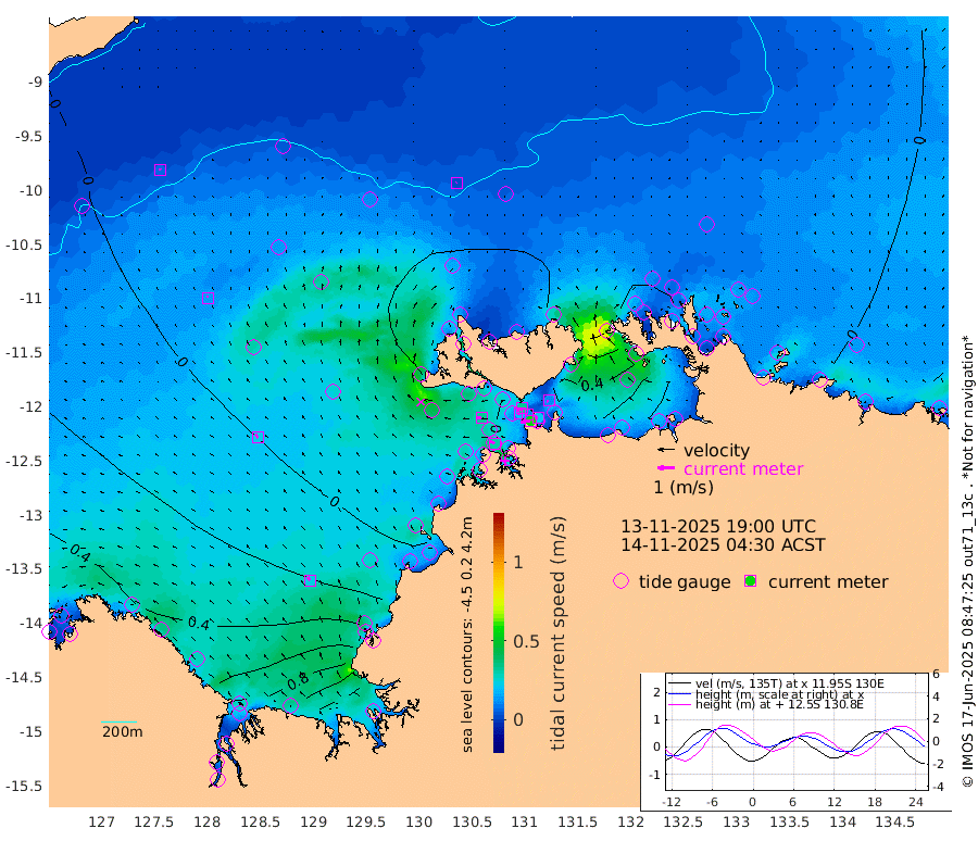 57cm/s -102T +4cm/s rms + 6cm/s 51T. Darwin_C1 52m 20cm/s -91T +4cm/s rms + 7cm/s -161T. Darwin_CW1 22m 18cm/s -108T +4cm/s rms + 8cm/s 61T. Darwin_CW2 34m 12cm/s -108T +3cm/s rms + 9cm/s 98T. Darwin_CW3 22m 11cm/s -95T +5cm/s rms + 7cm/s 88T. Darwin_C3 56m 32cm/s -116T +2cm/s rms + 9cm/s -126T. Darwin_CTbW 22m 3cm/s 18T +9cm/s rms + 2cm/s -110T. NWSLYN 196m 32cm/s -85T +1cm/s rms + 1cm/s -47T. DARBGF 30m 6cm/s -10T +7cm/s rms + 2cm/s -137T. ITFTIS 464m 14cm/s -4T +9cm/s rms + 1cm/s 74T. ITFMHB 146m 23cm/s -30T +4cm/s rms + 1cm/s -134T. ITFJBG 61m 23cm/s -37T +6cm/s rms + 4cm/s 121T. ITFFTB 108m 31cm/s -60T +4cm/s rms + 3cm/s 80T. NRSDAR 19m 64cm Carronade Island 66cm Guy Point 75cm Napier Broome Bay 57cm Lesueur Island 50cm Reveley Island 35cm Rocky Island 81cm Cape Domett 72cm Lacrosse Island 91cm Adolphus Island 152cm Pender Point 166cm Wyndham 3cm The Boxers -2cm Unnamed Shoal -2cm Loxton Shoal 58cm Pelican Island -8cm Calder Shoal -17cm Evans Shoal 113cm Quoin Island 35cm Port Keats 38cm Jones Point 88cm Catfish Island -3cm Cape Scott Offshore 14cm Cape Ford -10cm Anson Bay -20cm Goodrich Bank -18cm Peron Island North -10cm Point Jenny -8cm Native Point -13cm Fish Reef -7cm Tapa Bay -28cm Point Fawcett (Offshore) 5cm Burge Point -17cm Munkunuwa -12cm Beagle A -11cm Parsons Bank 1cm Fenton Patches -15cm Lynedoch Bank -3cm Hancox Shoal Area -5cm Nightcliff 2cm Darwin -4cm Charles Point Patches 27cm Glyde Point 54cm Chambers Bay 64cm Point Stuart 30cm Cape Hotham 51cm Christine Reef 73cm West Alligator Head 94cm East Field Island 34cm Two Hills Bay 1cm Newby Shoal 49cm Camp Point -11cm Medina Inlet South -32cm South Barlow Point -29cm St. Asaph Bay -24cm Cape Van Dieman -26cm Snake Bay -22cm Cache Point 0cm Echo Shoal -19cm Point Jahleel (Off) -7cm Cape Don -25cm Port Essington -32cm Smith Point - West -29cm NW Peacock Island -31cm North Of Jones Shoal -11cm Peacock Island -23cm Point David -33cm D'urville Point -21cm Money Shoal -24cm Copeland Island -33cm Cape Cockburn -25cm One Tree Point -20cm Hogmany Shoal -19cm New Year Island - West -20cm Grant Island -21cm Aurari Bay -12cm Cuthbert Point -19cm North Goulburn Island 7cm Paxie Shoal 7cm Entrance Island 14cm Yabooma Island
