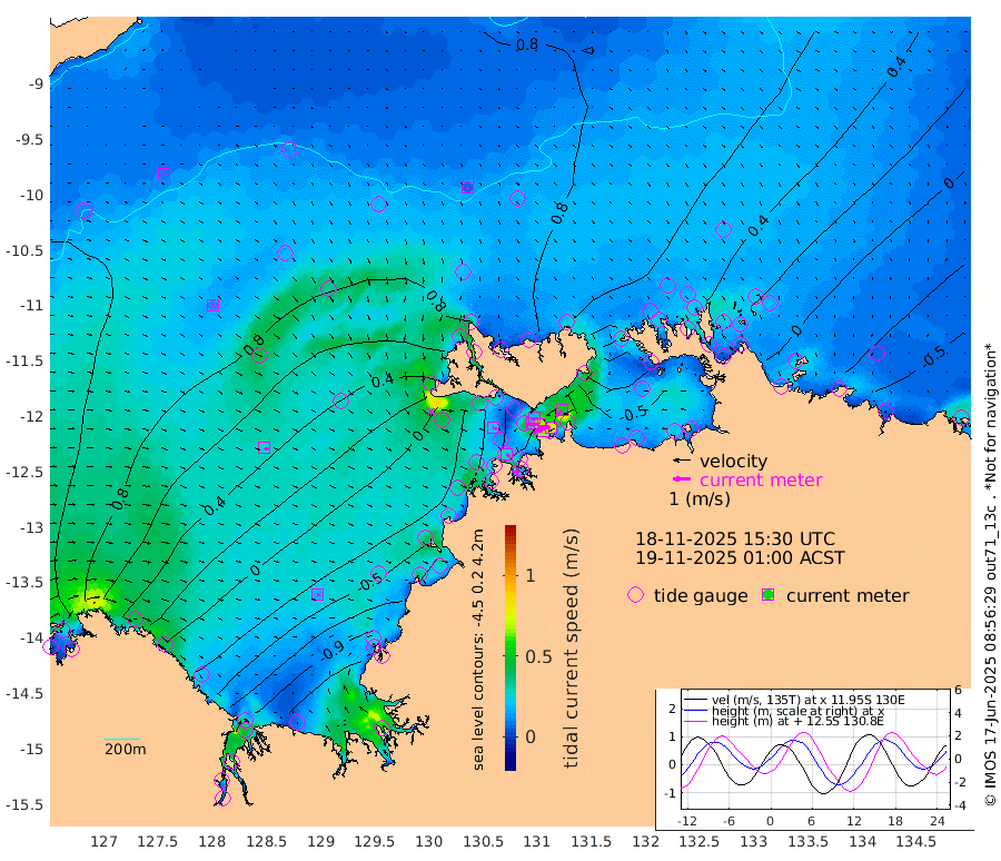 65cm/s -100T +4cm/s rms + 6cm/s 51T. Darwin_C1 52m 72cm/s -91T +4cm/s rms + 7cm/s -161T. Darwin_CW1 22m 30cm/s -106T +4cm/s rms + 8cm/s 61T. Darwin_CW2 34m 48cm/s -136T +3cm/s rms + 9cm/s 98T. Darwin_CW3 22m 67cm/s -91T +5cm/s rms + 7cm/s 88T. Darwin_C3 56m 20cm/s -116T +2cm/s rms + 9cm/s -126T. Darwin_CTbW 22m 7cm/s 145T +9cm/s rms + 2cm/s -110T. NWSLYN 196m 21cm/s 104T +1cm/s rms + 1cm/s -47T. DARBGF 30m 9cm/s 55T +7cm/s rms + 2cm/s -137T. ITFTIS 464m 11cm/s 96T +9cm/s rms + 1cm/s 74T. ITFMHB 146m 16cm/s 109T +4cm/s rms + 1cm/s -134T. ITFJBG 61m 25cm/s 108T +6cm/s rms + 4cm/s 121T. ITFFTB 108m 25cm/s 136T +4cm/s rms + 3cm/s 80T. NRSDAR 19m 82cm Carronade Island 79cm Guy Point 87cm Napier Broome Bay 29cm Lesueur Island -61cm Reveley Island -15cm Rocky Island -118cm Cape Domett -98cm Lacrosse Island -138cm Adolphus Island -138cm Pender Point -131cm Wyndham 72cm The Boxers 68cm Unnamed Shoal 97cm Loxton Shoal -138cm Pelican Island 83cm Calder Shoal 81cm Evans Shoal -200cm Quoin Island -91cm Port Keats -111cm Jones Point -180cm Catfish Island -39cm Cape Scott Offshore -26cm Cape Ford -46cm Anson Bay 77cm Goodrich Bank -31cm Peron Island North -19cm Point Jenny -16cm Native Point -32cm Fish Reef -39cm Tapa Bay 37cm Point Fawcett (Offshore) -46cm Burge Point -39cm Munkunuwa 7cm Beagle A -56cm Parsons Bank -37cm Fenton Patches 76cm Lynedoch Bank -61cm Hancox Shoal Area -50cm Nightcliff -70cm Darwin -46cm Charles Point Patches -66cm Glyde Point -83cm Chambers Bay -96cm Point Stuart -66cm Cape Hotham -66cm Christine Reef -110cm West Alligator Head -117cm East Field Island -61cm Two Hills Bay 59cm Newby Shoal -54cm Camp Point -37cm Medina Inlet South 50cm South Barlow Point 62cm St. Asaph Bay 77cm Cape Van Dieman 77cm Snake Bay 73cm Cache Point 100cm Echo Shoal 53cm Point Jahleel (Off) 13cm Cape Don 45cm Port Essington 49cm Smith Point - West 49cm NW Peacock Island 62cm North Of Jones Shoal 20cm Peacock Island 24cm Point David 47cm D'urville Point 49cm Money Shoal 18cm Copeland Island 29cm Cape Cockburn 29cm One Tree Point 17cm Hogmany Shoal 32cm New Year Island - West 25cm Grant Island 2cm Aurari Bay -16cm Cuthbert Point 7cm North Goulburn Island -32cm Paxie Shoal -46cm Entrance Island -78cm Yabooma Island