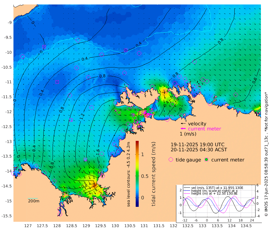 107cm/s 77T +4cm/s rms + 6cm/s 51T. Darwin_C1 52m 84cm/s 85T +4cm/s rms + 7cm/s -161T. Darwin_CW1 22m 64cm/s 75T +4cm/s rms + 8cm/s 61T. Darwin_CW2 34m 39cm/s 51T +3cm/s rms + 9cm/s 98T. Darwin_CW3 22m 85cm/s 88T +5cm/s rms + 7cm/s 88T. Darwin_C3 56m 70cm/s 64T +2cm/s rms + 9cm/s -126T. Darwin_CTbW 22m 3cm/s 88T +9cm/s rms + 2cm/s -110T. NWSLYN 196m 48cm/s 89T +1cm/s rms + 1cm/s -47T. DARBGF 30m 8cm/s 9T +7cm/s rms + 2cm/s -137T. ITFTIS 464m 5cm/s 38T +9cm/s rms + 1cm/s 74T. ITFMHB 146m 27cm/s 158T +4cm/s rms + 1cm/s -134T. ITFJBG 61m 18cm/s 125T +6cm/s rms + 4cm/s 121T. ITFFTB 108m 47cm/s 117T +4cm/s rms + 3cm/s 80T. NRSDAR 19m -65cm Carronade Island -74cm Guy Point -59cm Napier Broome Bay 11cm Lesueur Island 43cm Reveley Island 19cm Rocky Island 64cm Cape Domett 61cm Lacrosse Island 34cm Adolphus Island -48cm Pender Point -73cm Wyndham 54cm The Boxers 90cm Unnamed Shoal 6cm Loxton Shoal 85cm Pelican Island 47cm Calder Shoal 19cm Evans Shoal 28cm Quoin Island 132cm Port Keats 123cm Jones Point -6cm Catfish Island 130cm Cape Scott Offshore 141cm Cape Ford 158cm Anson Bay 45cm Goodrich Bank 140cm Peron Island North 144cm Point Jenny 145cm Native Point 153cm Fish Reef 155cm Tapa Bay 105cm Point Fawcett (Offshore) 163cm Burge Point 151cm Munkunuwa 137cm Beagle A 159cm Parsons Bank 158cm Fenton Patches 34cm Lynedoch Bank 145cm Hancox Shoal Area 164cm Nightcliff 170cm Darwin 166cm Charles Point Patches 98cm Glyde Point 27cm Chambers Bay 13cm Point Stuart 67cm Cape Hotham 26cm Christine Reef 3cm West Alligator Head -24cm East Field Island 39cm Two Hills Bay 109cm Newby Shoal 45cm Camp Point 159cm Medina Inlet South 104cm South Barlow Point 78cm St. Asaph Bay 52cm Cape Van Dieman 62cm Snake Bay 49cm Cache Point -18cm Echo Shoal 51cm Point Jahleel (Off) 67cm Cape Don 62cm Port Essington 62cm Smith Point - West 59cm NW Peacock Island 54cm North Of Jones Shoal 21cm Peacock Island 68cm Point David 66cm D'urville Point 59cm Money Shoal 67cm Copeland Island 89cm Cape Cockburn 69cm One Tree Point 66cm Hogmany Shoal 70cm New Year Island - West 69cm Grant Island 76cm Aurari Bay 70cm Cuthbert Point 73cm North Goulburn Island 69cm Paxie Shoal 64cm Entrance Island 58cm Yabooma Island
