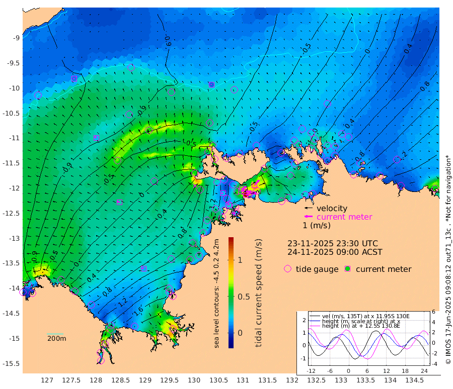 134cm/s 78T +4cm/s rms + 6cm/s 51T. Darwin_C1 52m 91cm/s 92T +4cm/s rms + 7cm/s -161T. Darwin_CW1 22m 50cm/s 71T +4cm/s rms + 8cm/s 61T. Darwin_CW2 34m 91cm/s 42T +3cm/s rms + 9cm/s 98T. Darwin_CW3 22m 85cm/s 90T +5cm/s rms + 7cm/s 88T. Darwin_C3 56m 63cm/s 66T +2cm/s rms + 9cm/s -126T. Darwin_CTbW 22m 7cm/s -17T +9cm/s rms + 2cm/s -110T. NWSLYN 196m 18cm/s -76T +1cm/s rms + 1cm/s -47T. DARBGF 30m 10cm/s -93T +7cm/s rms + 2cm/s -137T. ITFTIS 464m 18cm/s -41T +9cm/s rms + 1cm/s 74T. ITFMHB 146m 17cm/s -68T +4cm/s rms + 1cm/s -134T. ITFJBG 61m 32cm/s -64T +6cm/s rms + 4cm/s 121T. ITFFTB 108m 25cm/s -42T +4cm/s rms + 3cm/s 80T. NRSDAR 19m -108cm Carronade Island -109cm Guy Point -111cm Napier Broome Bay -25cm Lesueur Island 62cm Reveley Island -15cm Rocky Island 131cm Cape Domett 110cm Lacrosse Island 159cm Adolphus Island 133cm Pender Point 130cm Wyndham -70cm The Boxers -31cm Unnamed Shoal -109cm Loxton Shoal 157cm Pelican Island -88cm Calder Shoal -90cm Evans Shoal 230cm Quoin Island 125cm Port Keats 127cm Jones Point 199cm Catfish Island 61cm Cape Scott Offshore -36cm Cape Ford 81cm Anson Bay -72cm Goodrich Bank 54cm Peron Island North 32cm Point Jenny 31cm Native Point 45cm Fish Reef 61cm Tapa Bay -33cm Point Fawcett (Offshore) 68cm Burge Point 51cm Munkunuwa 2cm Beagle A 92cm Parsons Bank 59cm Fenton Patches -66cm Lynedoch Bank 99cm Hancox Shoal Area 94cm Nightcliff 109cm Darwin 76cm Charles Point Patches 97cm Glyde Point 108cm Chambers Bay 119cm Point Stuart 98cm Cape Hotham 90cm Christine Reef 131cm West Alligator Head 134cm East Field Island 90cm Two Hills Bay -42cm Newby Shoal 84cm Camp Point 60cm Medina Inlet South -34cm South Barlow Point -59cm St. Asaph Bay -70cm Cape Van Dieman -57cm Snake Bay -66cm Cache Point -123cm Echo Shoal -39cm Point Jahleel (Off) 17cm Cape Don -18cm Port Essington -21cm Smith Point - West -15cm NW Peacock Island -34cm North Of Jones Shoal -8cm Peacock Island 37cm Point David -8cm D'urville Point -7cm Money Shoal 43cm Copeland Island 49cm Cape Cockburn 28cm One Tree Point 47cm Hogmany Shoal 31cm New Year Island - West 37cm Grant Island 76cm Aurari Bay 93cm Cuthbert Point 67cm North Goulburn Island 116cm Paxie Shoal 129cm Entrance Island 175cm Yabooma Island