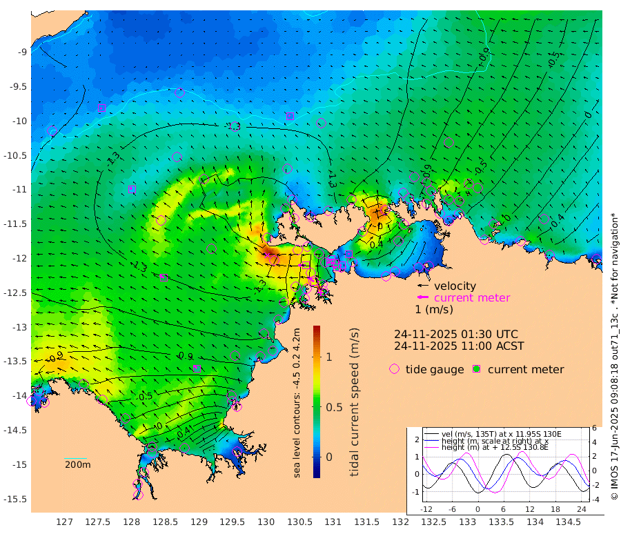 34cm/s -106T +4cm/s rms + 6cm/s 51T. Darwin_C1 52m 14cm/s -78T +4cm/s rms + 7cm/s -161T. Darwin_CW1 22m 34cm/s -102T +4cm/s rms + 8cm/s 61T. Darwin_CW2 34m 10cm/s 24T +3cm/s rms + 9cm/s 98T. Darwin_CW3 22m 35cm/s -93T +5cm/s rms + 7cm/s 88T. Darwin_C3 56m 24cm/s -116T +2cm/s rms + 9cm/s -126T. Darwin_CTbW 22m 11cm/s -39T +9cm/s rms + 2cm/s -110T. NWSLYN 196m 68cm/s -88T +1cm/s rms + 1cm/s -47T. DARBGF 30m 13cm/s -123T +7cm/s rms + 2cm/s -137T. ITFTIS 464m 20cm/s -42T +9cm/s rms + 1cm/s 74T. ITFMHB 146m 35cm/s -34T +4cm/s rms + 1cm/s -134T. ITFJBG 61m 45cm/s -58T +6cm/s rms + 4cm/s 121T. ITFFTB 108m 77cm/s -56T +4cm/s rms + 3cm/s 80T. NRSDAR 19m -51cm Carronade Island -52cm Guy Point -55cm Napier Broome Bay -58cm Lesueur Island -30cm Reveley Island -47cm Rocky Island 16cm Cape Domett 4cm Lacrosse Island 75cm Adolphus Island 131cm Pender Point 165cm Wyndham -134cm The Boxers -125cm Unnamed Shoal -125cm Loxton Shoal 17cm Pelican Island -146cm Calder Shoal -118cm Evans Shoal 153cm Quoin Island -55cm Port Keats -39cm Jones Point 224cm Catfish Island -100cm Cape Scott Offshore -249cm Cape Ford -107cm Anson Bay -127cm Goodrich Bank -115cm Peron Island North -145cm Point Jenny -150cm Native Point -132cm Fish Reef -136cm Tapa Bay -154cm Point Fawcett (Offshore) -131cm Burge Point -138cm Munkunuwa -158cm Beagle A -106cm Parsons Bank -133cm Fenton Patches -105cm Lynedoch Bank -89cm Hancox Shoal Area -107cm Nightcliff -100cm Darwin -127cm Charles Point Patches -27cm Glyde Point 67cm Chambers Bay 93cm Point Stuart 11cm Cape Hotham 42cm Christine Reef 113cm West Alligator Head 148cm East Field Island 38cm Two Hills Bay -166cm Newby Shoal 22cm Camp Point -131cm Medina Inlet South -153cm South Barlow Point -151cm St. Asaph Bay -132cm Cape Van Dieman -127cm Snake Bay -123cm Cache Point -107cm Echo Shoal -100cm Point Jahleel (Off) -59cm Cape Don -86cm Port Essington -90cm Smith Point - West -81cm NW Peacock Island -88cm North Of Jones Shoal -28cm Peacock Island -38cm Point David -80cm D'urville Point -66cm Money Shoal -29cm Copeland Island -41cm Cape Cockburn -42cm One Tree Point -38cm Hogmany Shoal -42cm New Year Island - West -39cm Grant Island 3cm Aurari Bay 20cm Cuthbert Point -8cm North Goulburn Island 43cm Paxie Shoal 62cm Entrance Island 121cm Yabooma Island