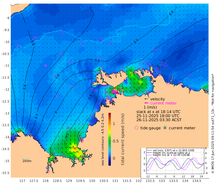 140cm/s -101T +4cm/s rms + 6cm/s 51T. Darwin_C1 52m 82cm/s -90T +4cm/s rms + 7cm/s -161T. Darwin_CW1 22m 59cm/s -108T +4cm/s rms + 8cm/s 61T. Darwin_CW2 34m 62cm/s -132T +3cm/s rms + 9cm/s 98T. Darwin_CW3 22m 72cm/s -91T +5cm/s rms + 7cm/s 88T. Darwin_C3 56m 80cm/s -115T +2cm/s rms + 9cm/s -126T. Darwin_CTbW 22m 8cm/s 137T +9cm/s rms + 2cm/s -110T. NWSLYN 196m 21cm/s -94T +1cm/s rms + 1cm/s -47T. DARBGF 30m 10cm/s 30T +7cm/s rms + 2cm/s -137T. ITFTIS 464m 14cm/s 34T +9cm/s rms + 1cm/s 74T. ITFMHB 146m 17cm/s 1T +4cm/s rms + 1cm/s -134T. ITFJBG 61m 13cm/s 30T +6cm/s rms + 4cm/s 121T. ITFFTB 108m 19cm/s -80T +4cm/s rms + 3cm/s 80T. NRSDAR 19m 116cm Carronade Island 116cm Guy Point 128cm Napier Broome Bay 58cm Lesueur Island -34cm Reveley Island 0cm Rocky Island -61cm Cape Domett -51cm Lacrosse Island -68cm Adolphus Island -1cm Pender Point 20cm Wyndham 55cm The Boxers 39cm Unnamed Shoal 81cm Loxton Shoal -89cm Pelican Island 53cm Calder Shoal 59cm Evans Shoal -86cm Quoin Island -91cm Port Keats -82cm Jones Point -25cm Catfish Island -61cm Cape Scott Offshore -12cm Cape Ford -78cm Anson Bay 47cm Goodrich Bank -61cm Peron Island North -58cm Point Jenny -56cm Native Point -62cm Fish Reef -74cm Tapa Bay -1cm Point Fawcett (Offshore) -78cm Burge Point -82cm Munkunuwa -39cm Beagle A -93cm Parsons Bank -76cm Fenton Patches 52cm Lynedoch Bank -91cm Hancox Shoal Area -101cm Nightcliff -91cm Darwin -67cm Charles Point Patches -54cm Glyde Point -37cm Chambers Bay -30cm Point Stuart -45cm Cape Hotham -35cm Christine Reef -34cm West Alligator Head -18cm East Field Island -29cm Two Hills Bay 13cm Newby Shoal -19cm Camp Point -71cm Medina Inlet South -1cm South Barlow Point 19cm St. Asaph Bay 44cm Cape Van Dieman 38cm Snake Bay 44cm Cache Point 92cm Echo Shoal 26cm Point Jahleel (Off) -1cm Cape Don 22cm Port Essington 14cm Smith Point - West 17cm NW Peacock Island 29cm North Of Jones Shoal 8cm Peacock Island 0cm Point David 11cm D'urville Point 26cm Money Shoal -5cm Copeland Island -5cm Cape Cockburn 4cm One Tree Point 6cm Hogmany Shoal 7cm New Year Island - West 1cm Grant Island -20cm Aurari Bay -23cm Cuthbert Point -13cm North Goulburn Island -23cm Paxie Shoal -39cm Entrance Island -57cm Yabooma Island